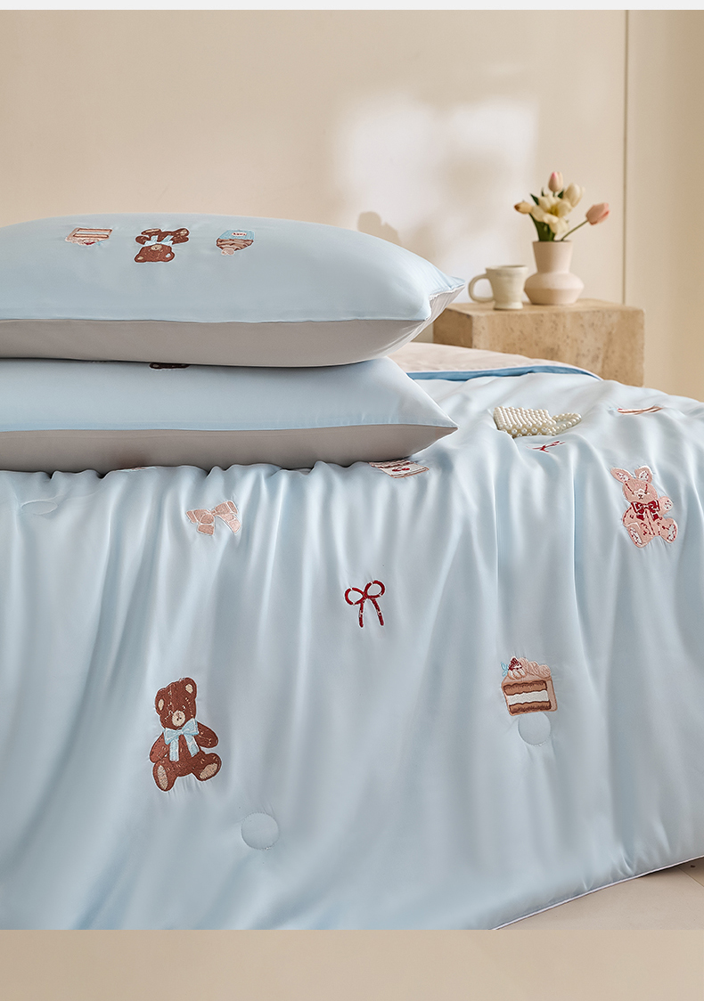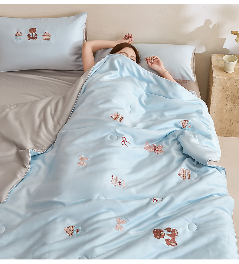 DC 2026新款A类兰精天丝麻绳平绣系列夏被四件套 婴儿蓝+冰川灰(焦糖小熊)