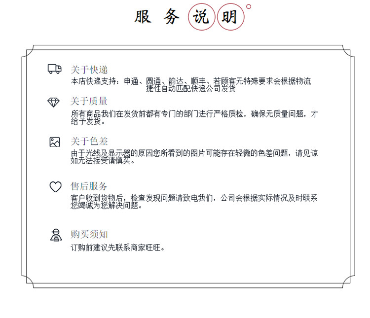 云仓服务3:享急速发货,18点之前下单,2小时内发货,保证发货时效;