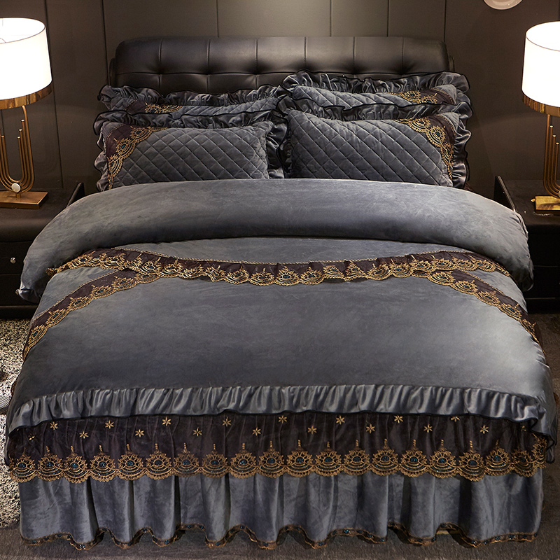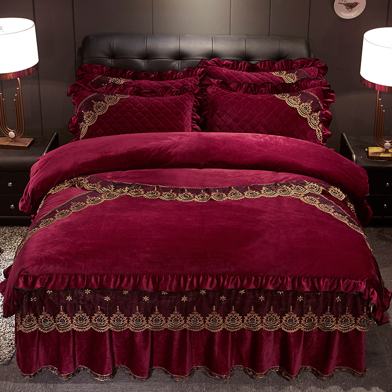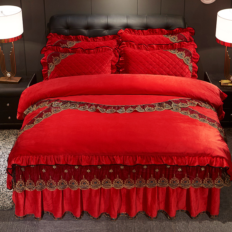 (总)宜凡家纺 2025新款婴儿绒压花全夹棉床裙四件套,韵雅-中国红,韵雅-黑天鹅