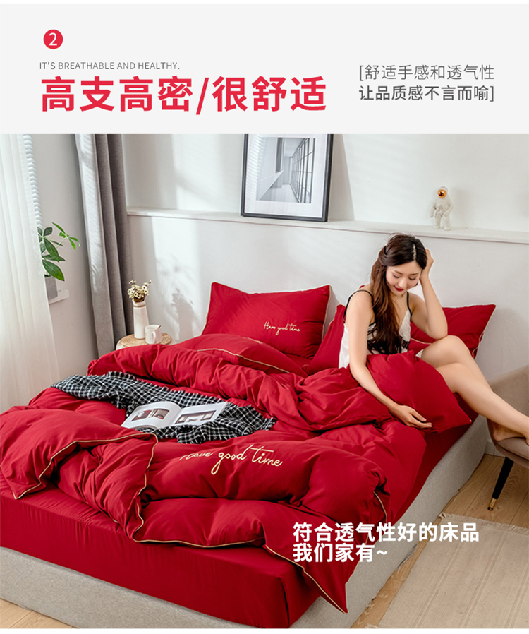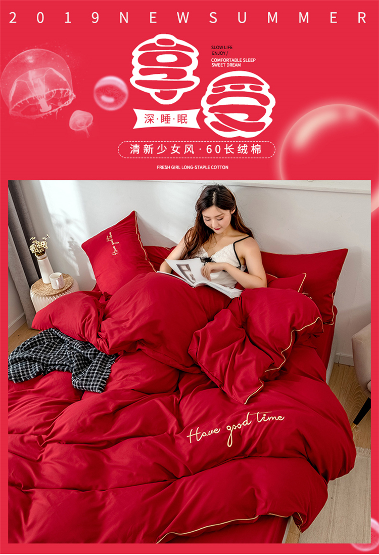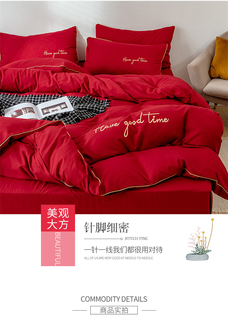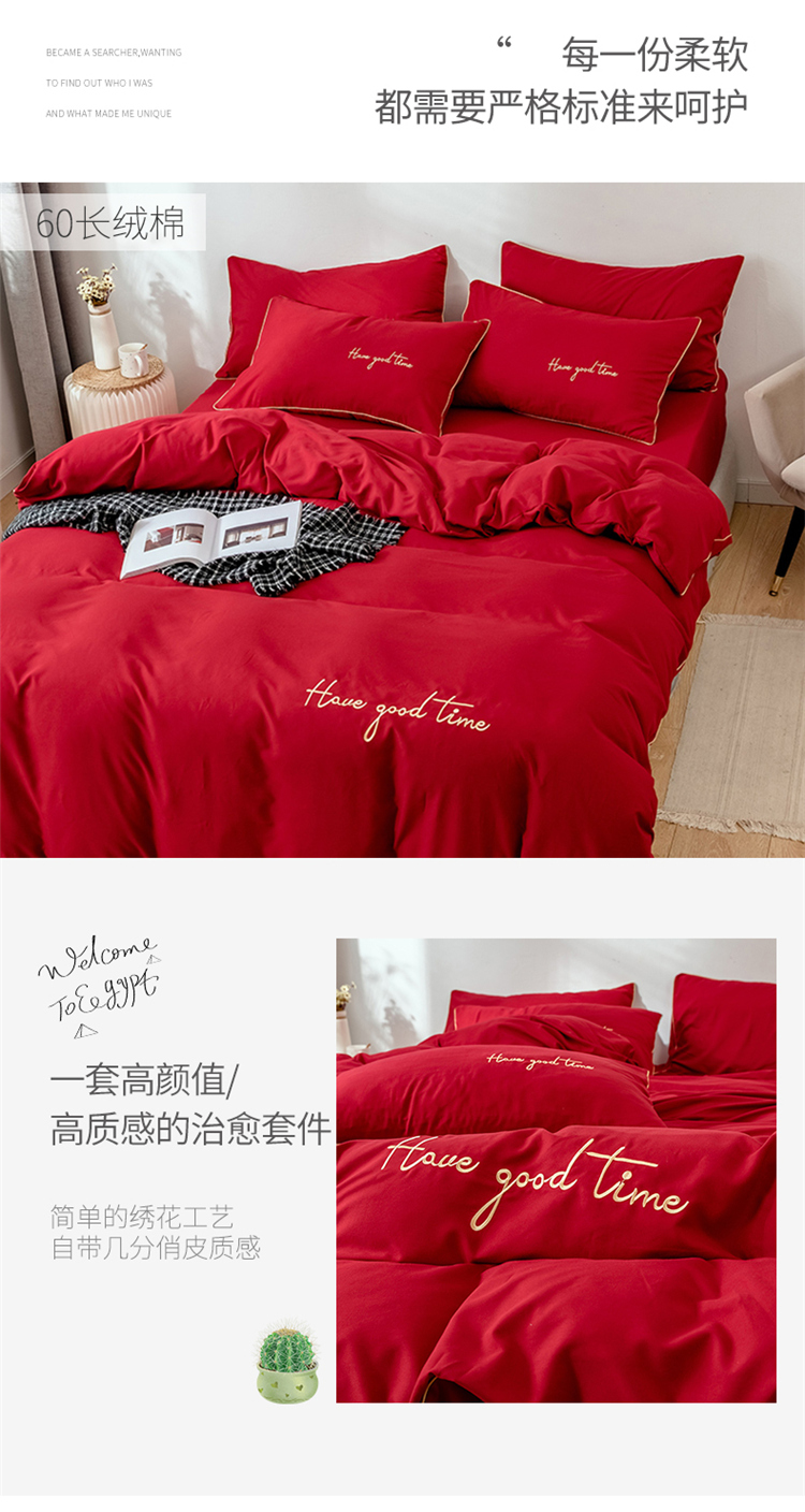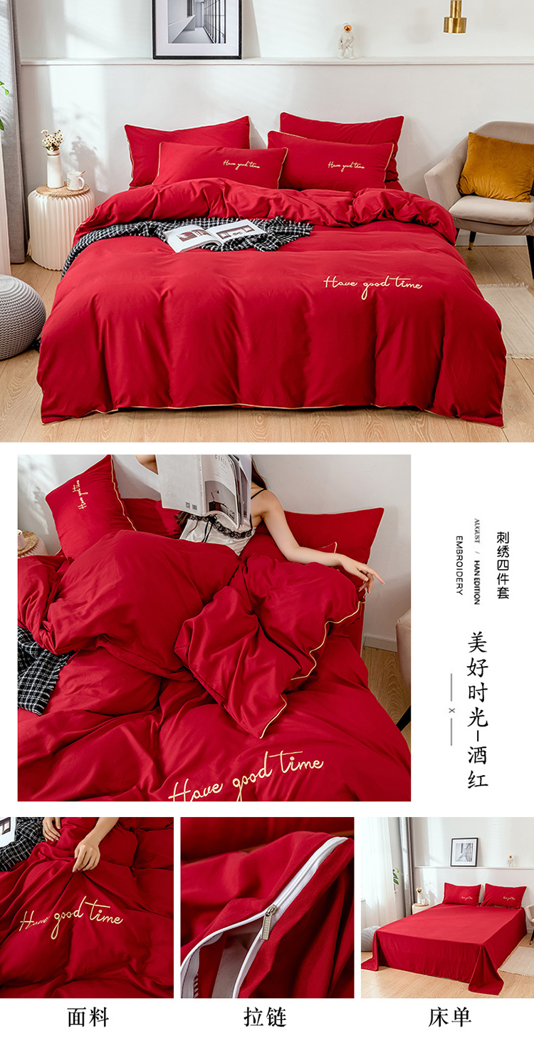 意尚风情2019新款60长绒棉绣花工艺款四件套美好时光-酒红