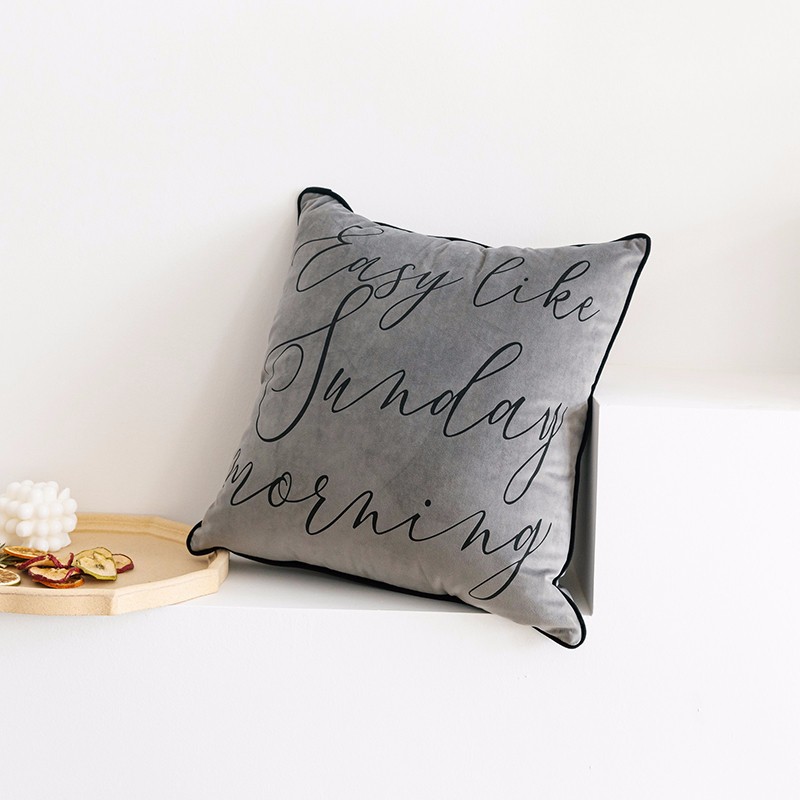 当前位置: 91家纺网 > 商品网购 > 居家日用 > 靠垫/抱枕 > 美茉家居绒布双面拼色抱枕英文字母印花滚绳靠垫 sunday morning