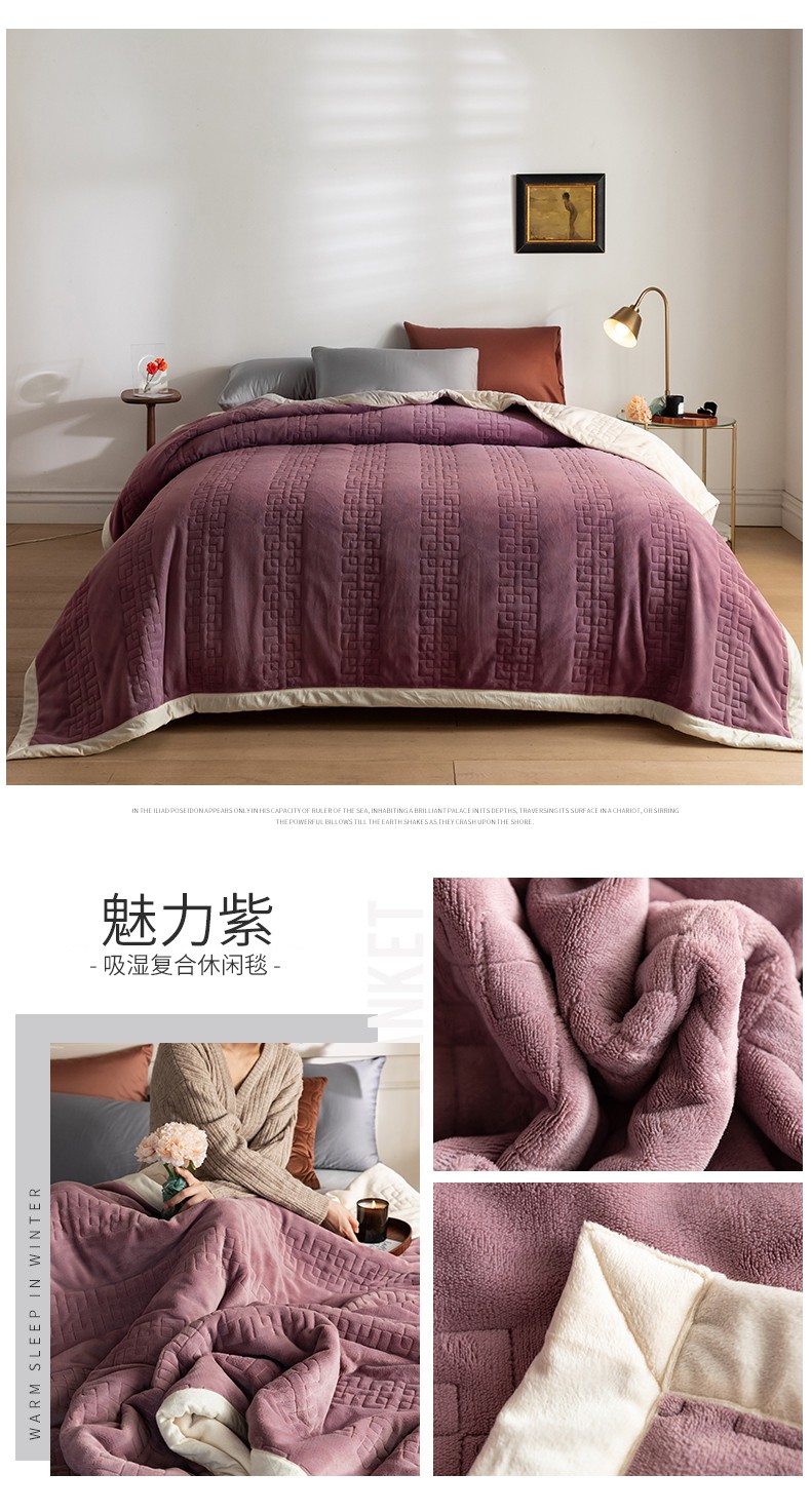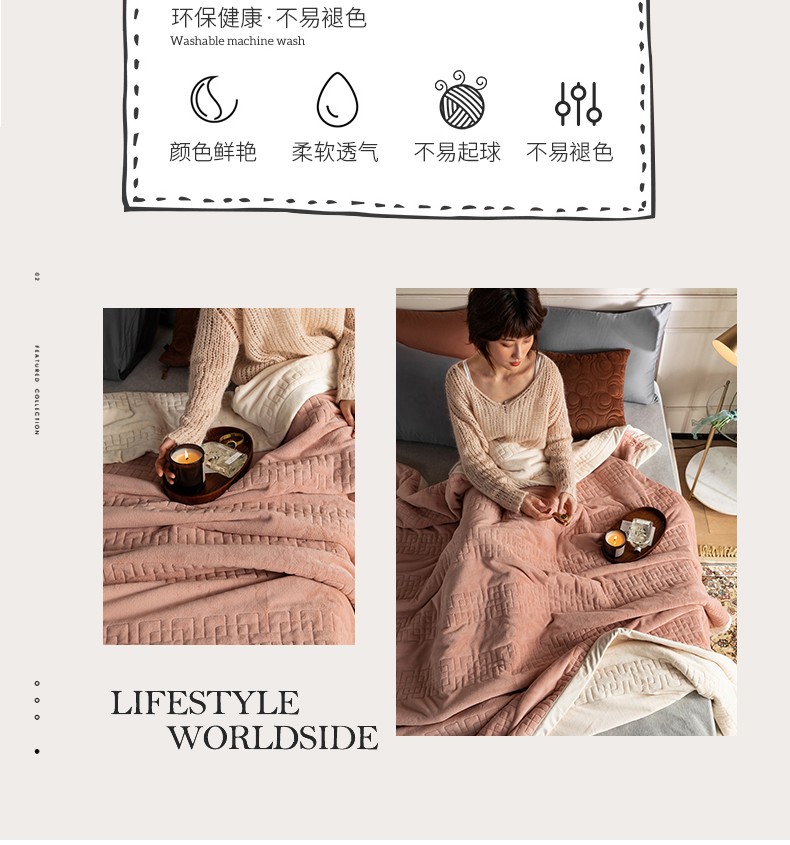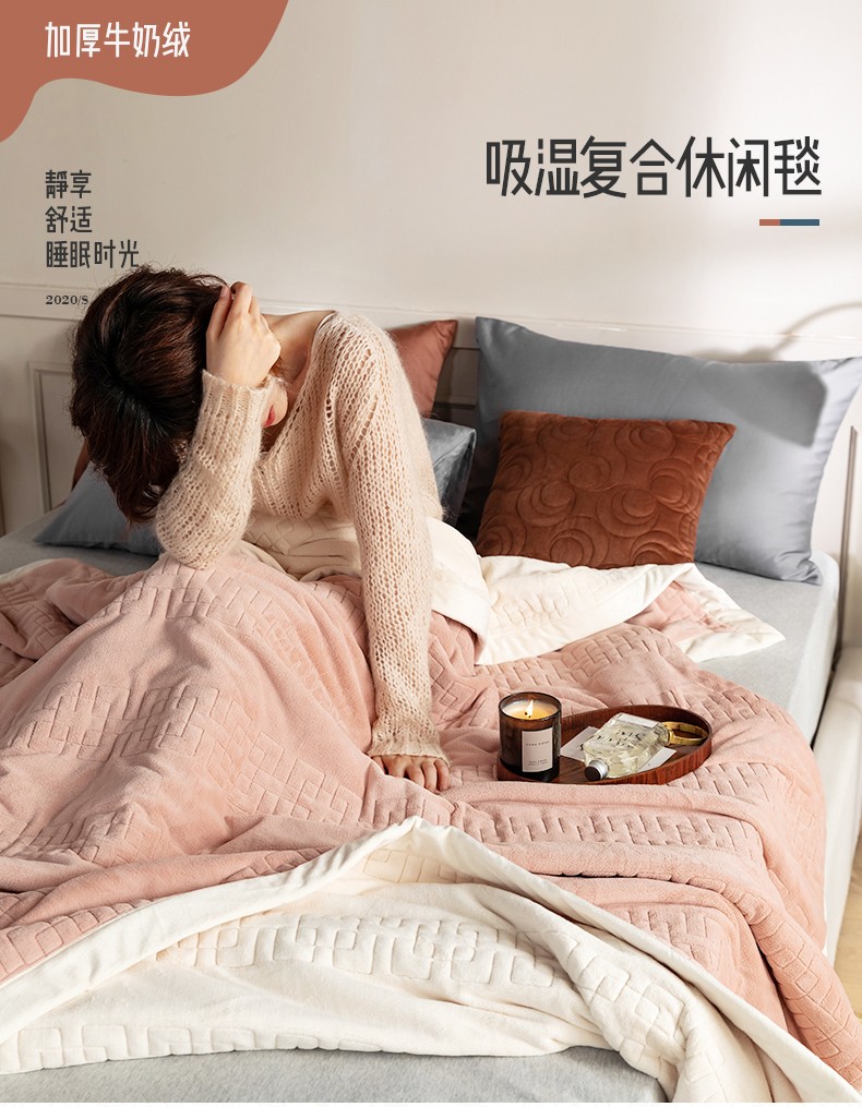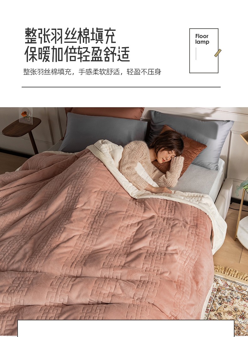 商品名称:法芙娜 秋冬加厚吸湿绗绣毯 牛奶绒夹棉毛毯 樱花粉