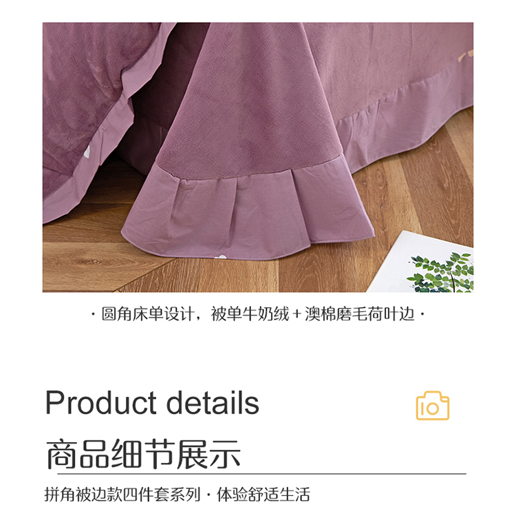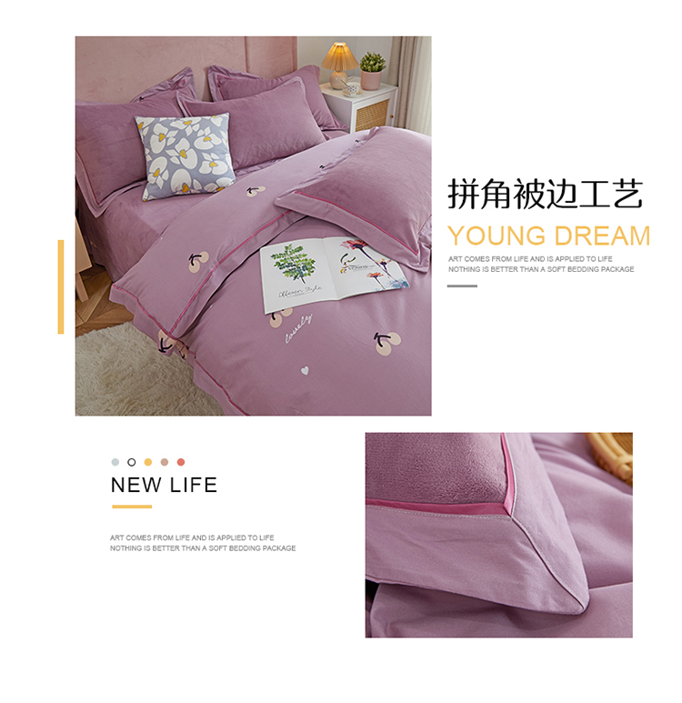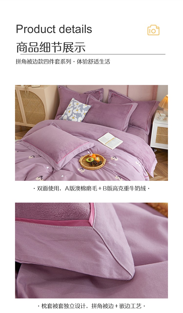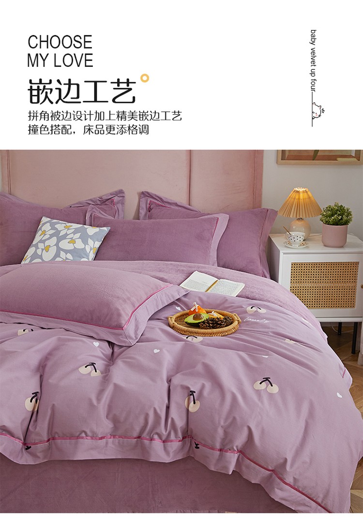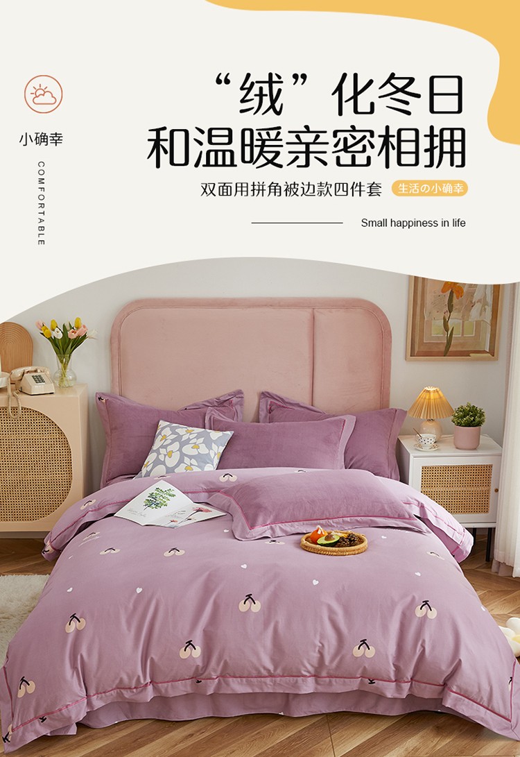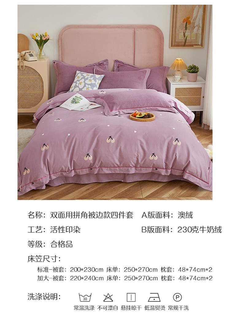 商品名称:杜先生 2021新款拼角被边款澳绒牛奶绒四件套 小樱桃-豆沙