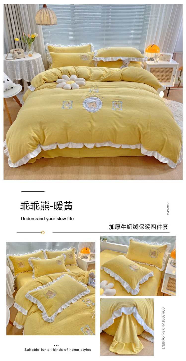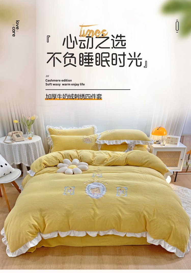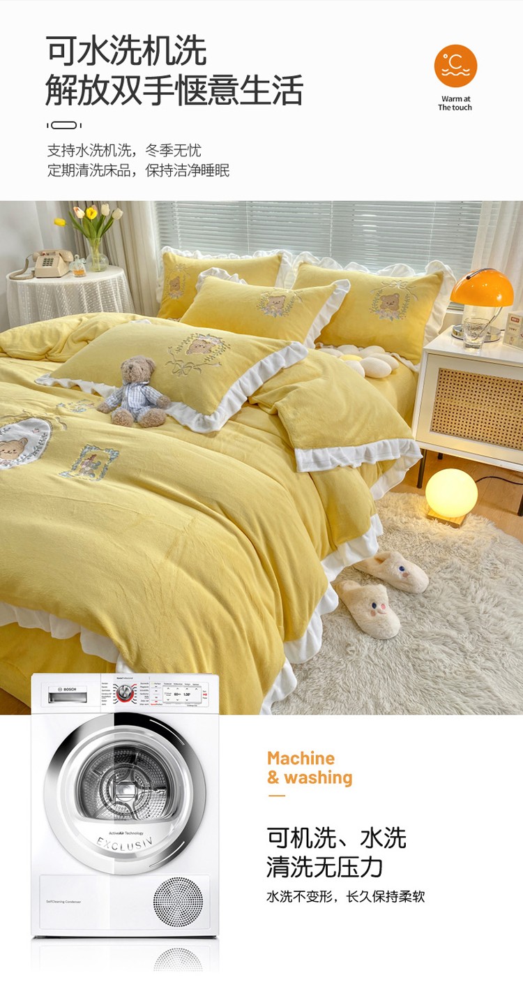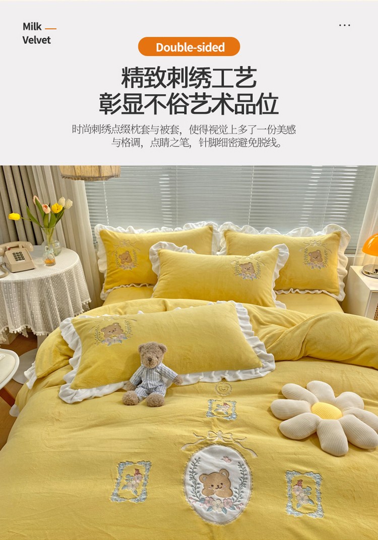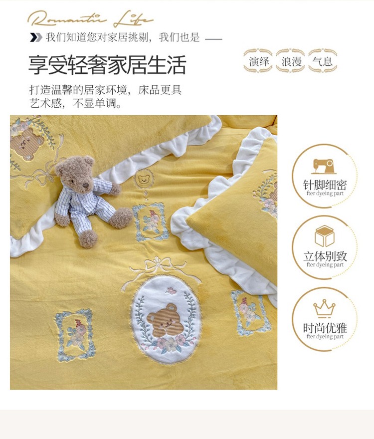 星尚 高品质牛奶绒绣花四件套加厚法莱宝宝婴儿绒-乖乖熊 暖黄