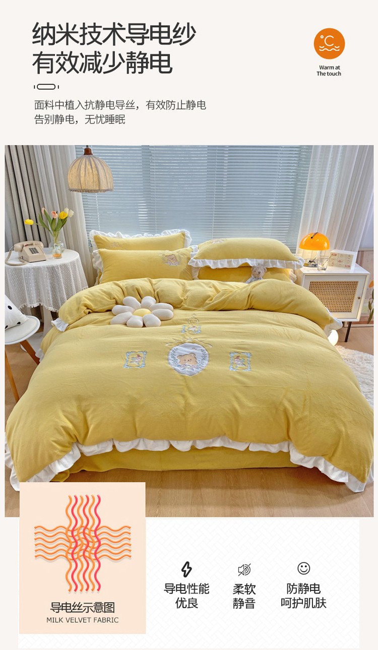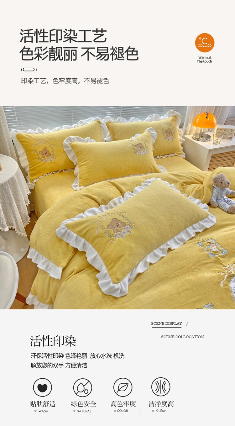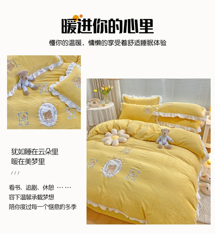 商品名称:星尚 高品质牛奶绒绣花四件套加厚法莱宝宝婴儿绒-乖乖熊 暖黄