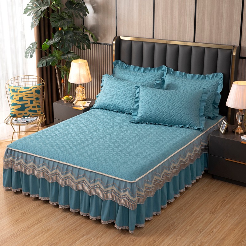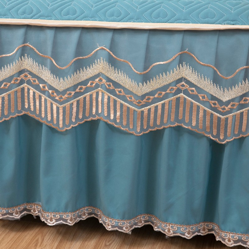 木兰花 新款 超柔氧棉加厚磨毛韩版蕾丝夹棉四件套床裙款 青蓝