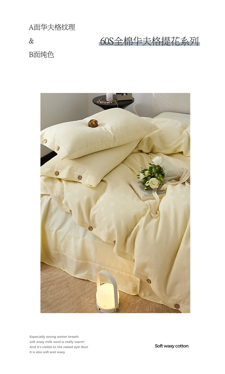 商品名称:名品优仓2023新款60支华夫格水洗棉提花四件套 沫之圆-奶油黄