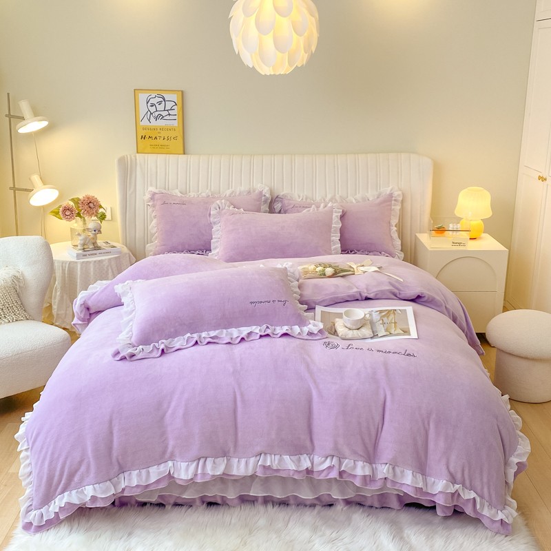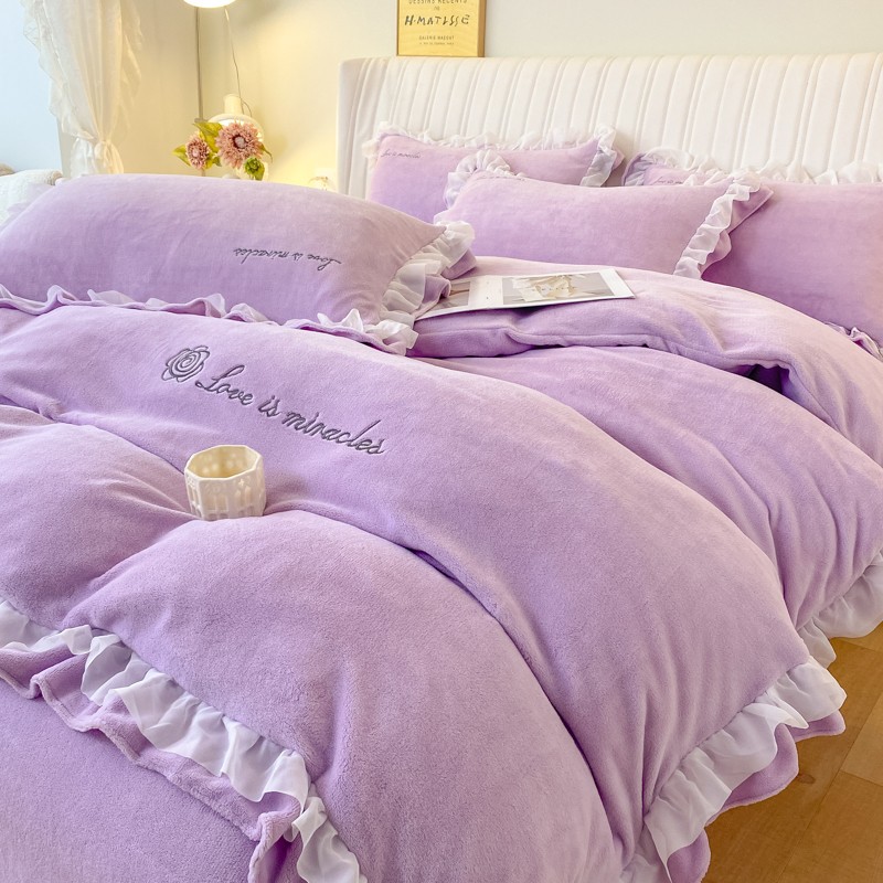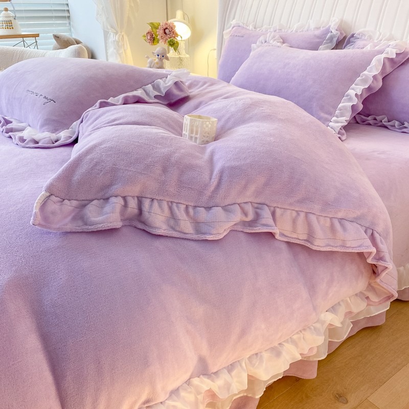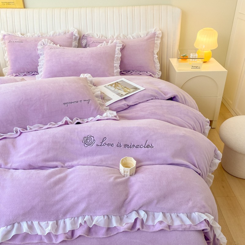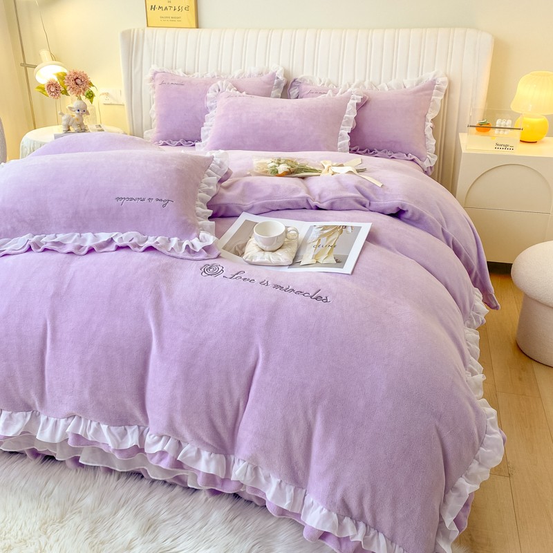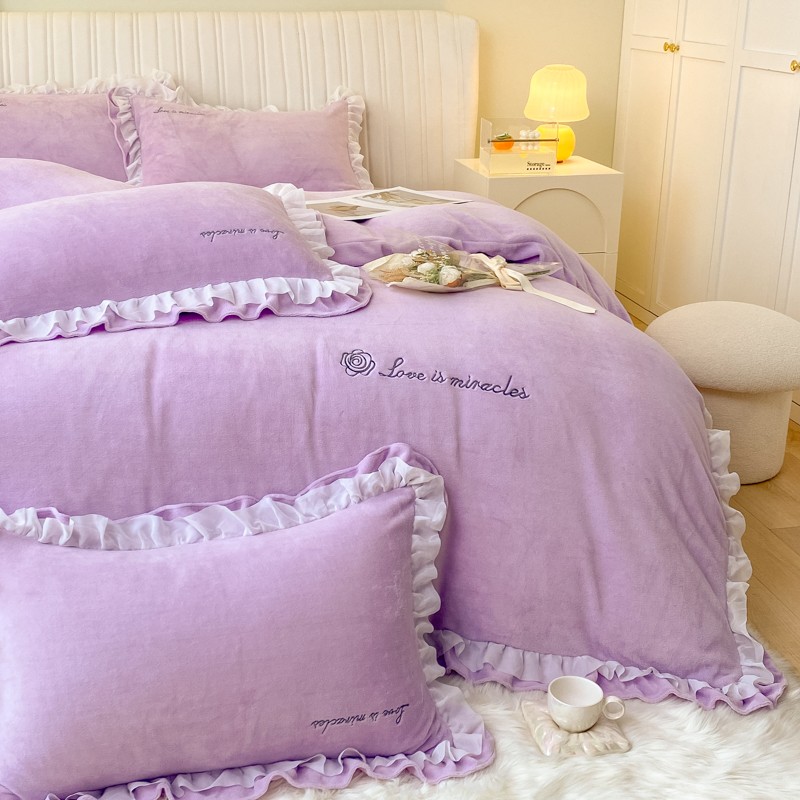 金丝鸟 2022新款200克韩式公主风花边款牛奶绒四件套 梦幻紫