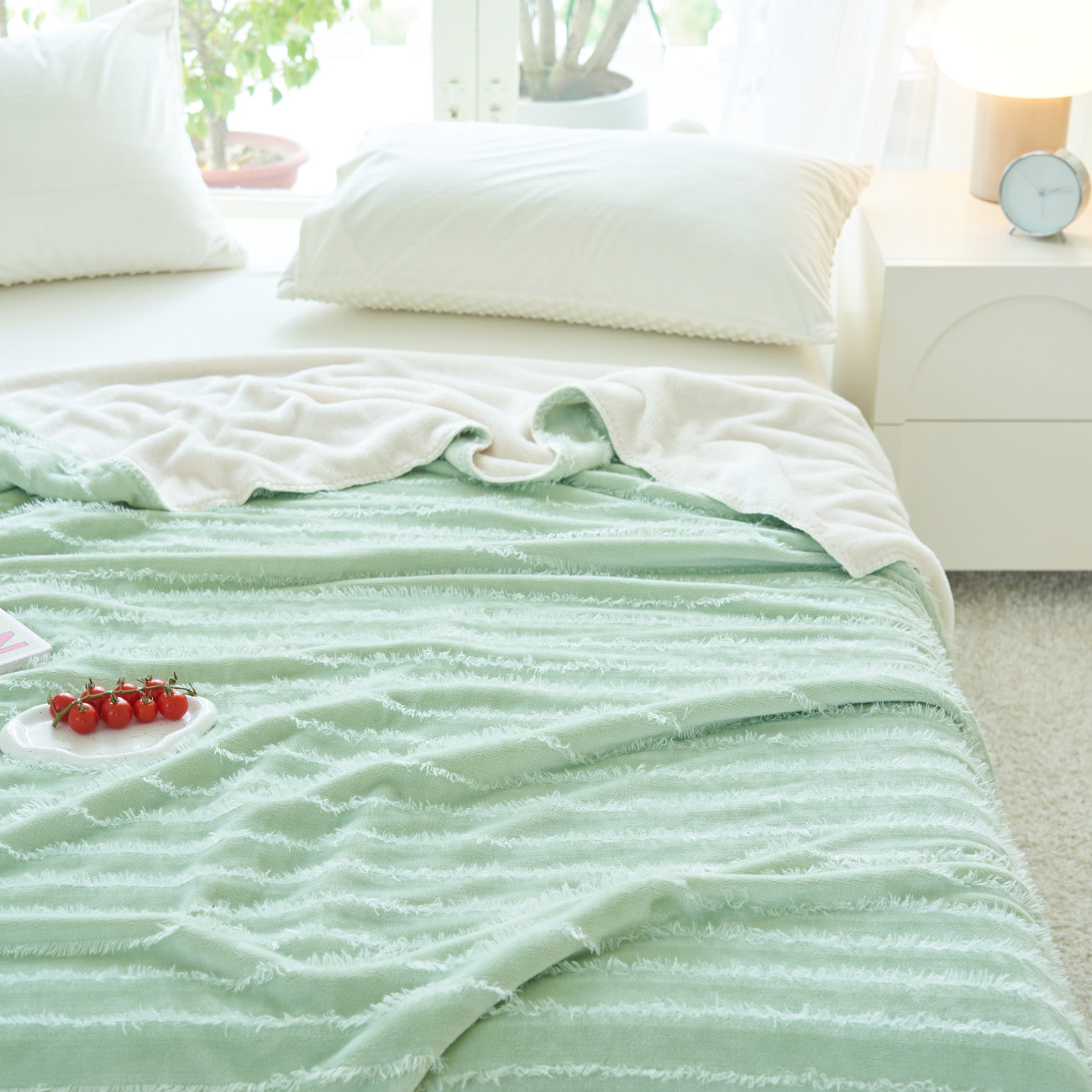 商品名称:晨曦家纺 2022新款流苏款三角针毛毯 流苏-青草绿