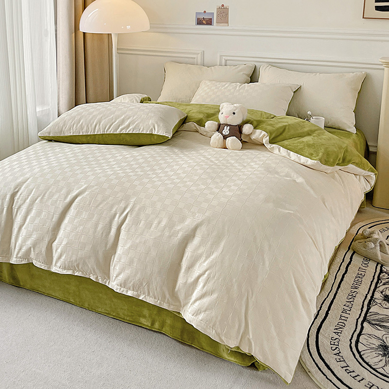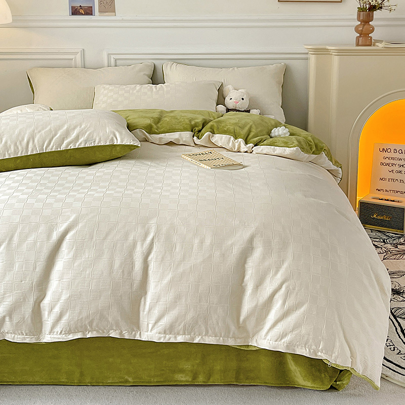 金丝鸟 2022全棉华夫格提花加牛奶绒四件套 苏珊格白加绿