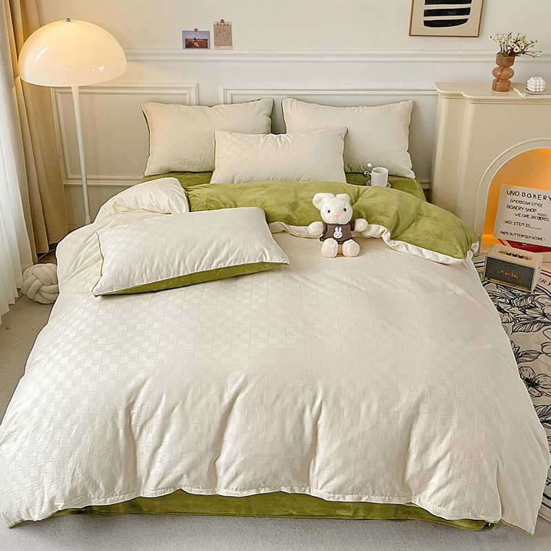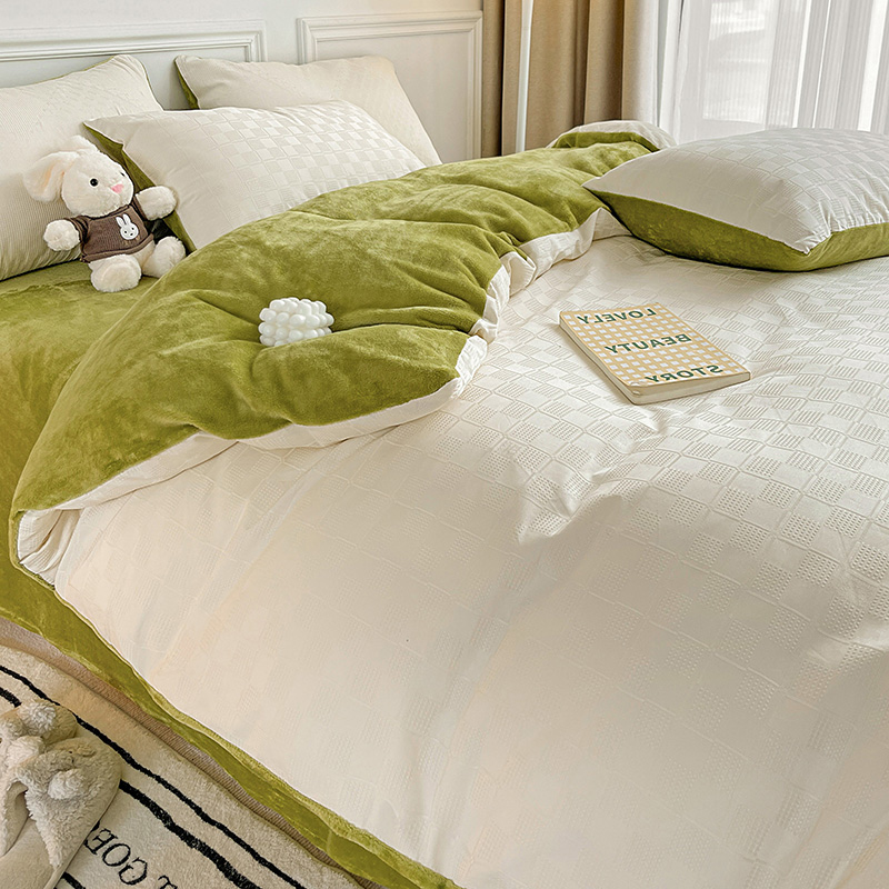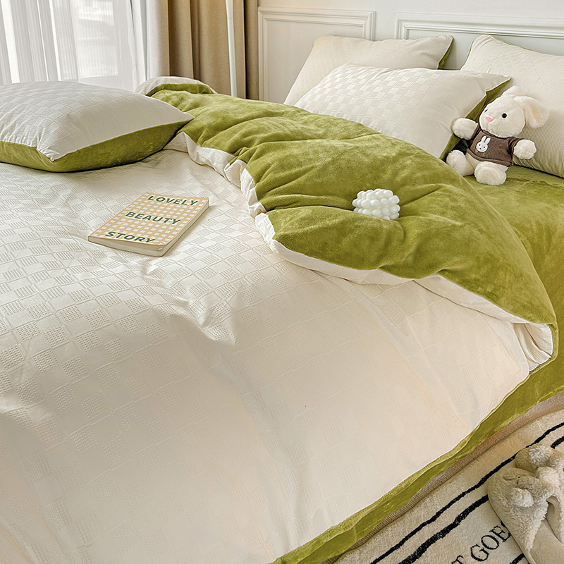 商品名称:金丝鸟 2022全棉华夫格提花加牛奶绒四件套 苏珊格白加绿
