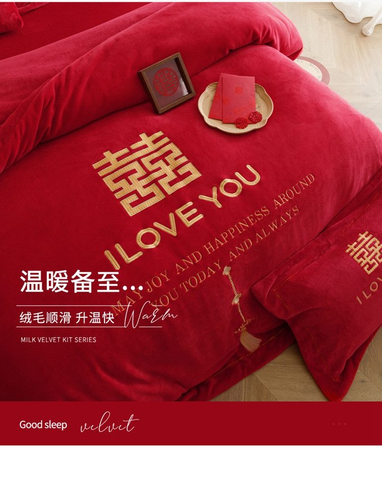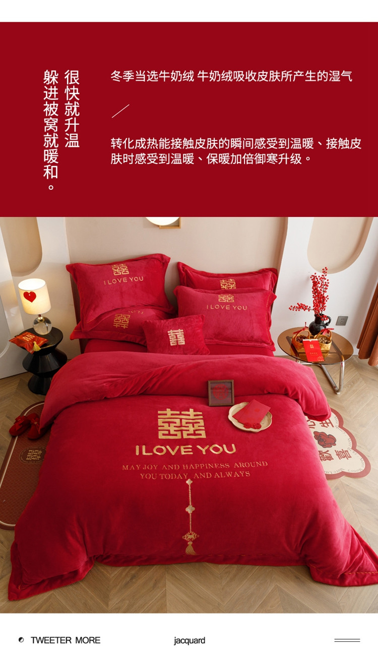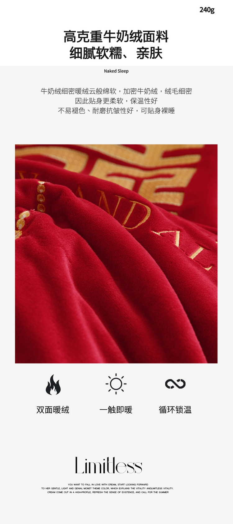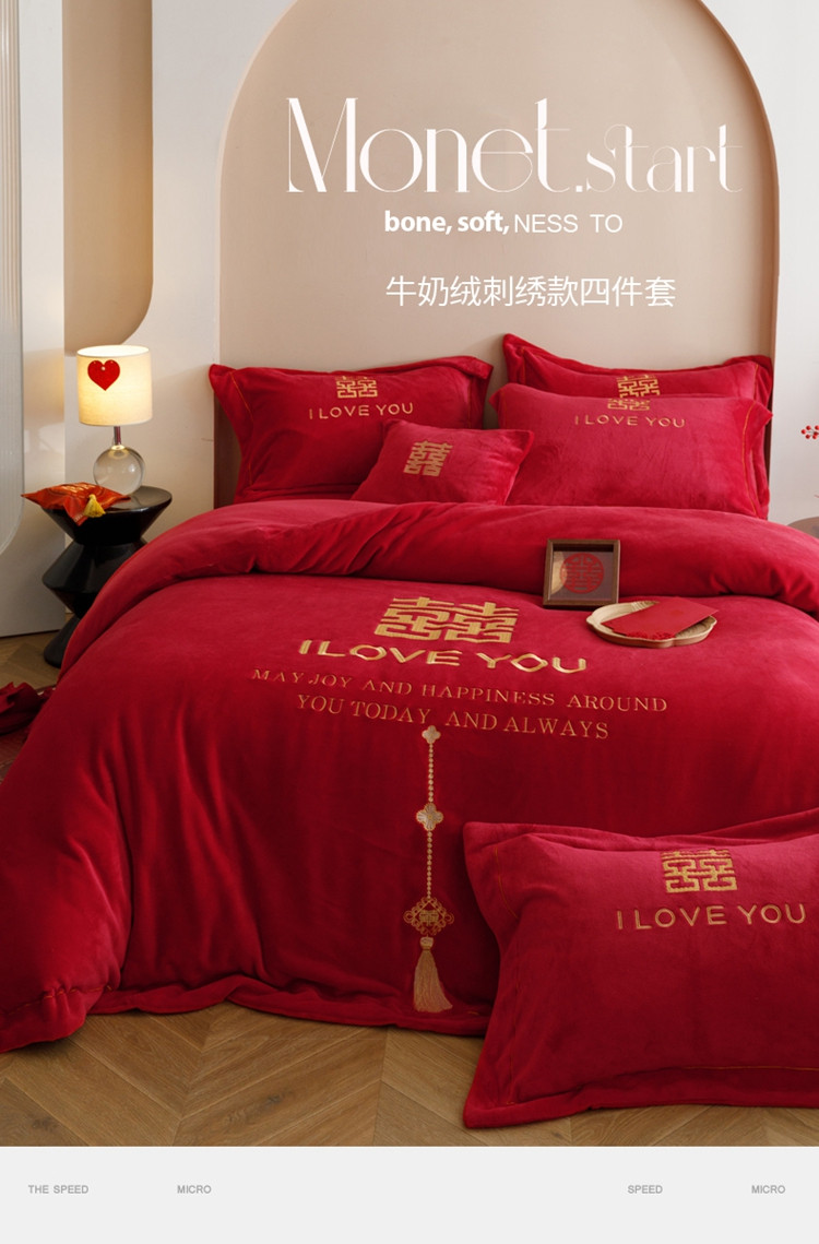 铭动 2023新款高克重牛奶绒刺绣款婚庆大红色新婚四件套 倾心