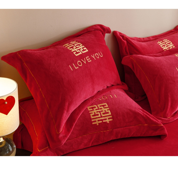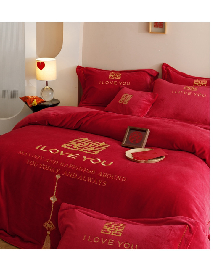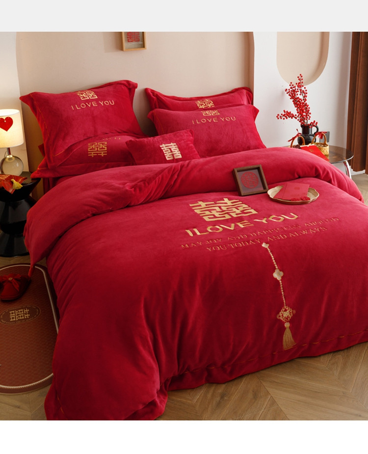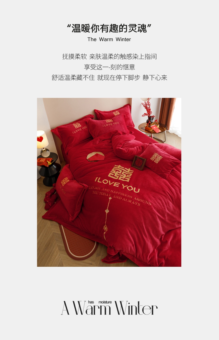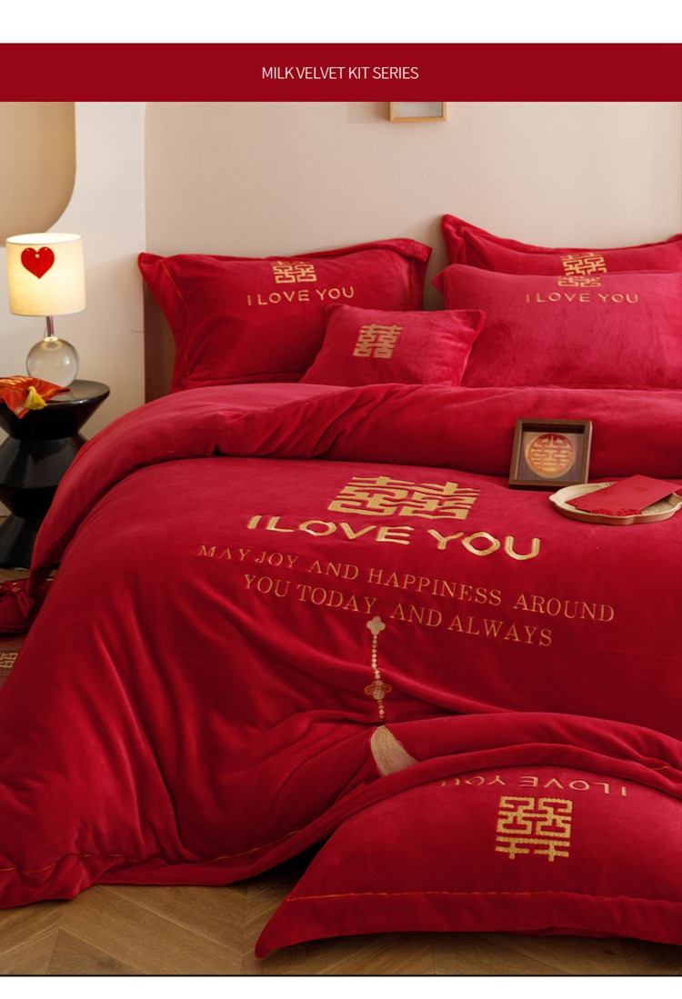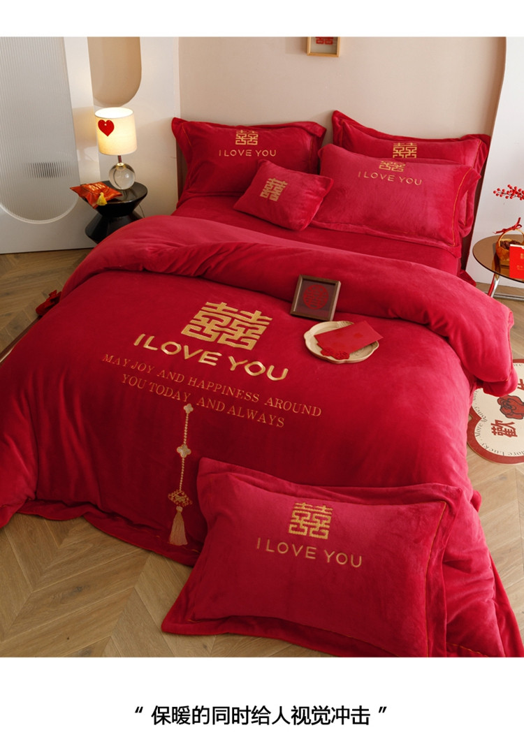 铭动 2023新款高克重牛奶绒刺绣款婚庆大红色新婚四件套 倾心