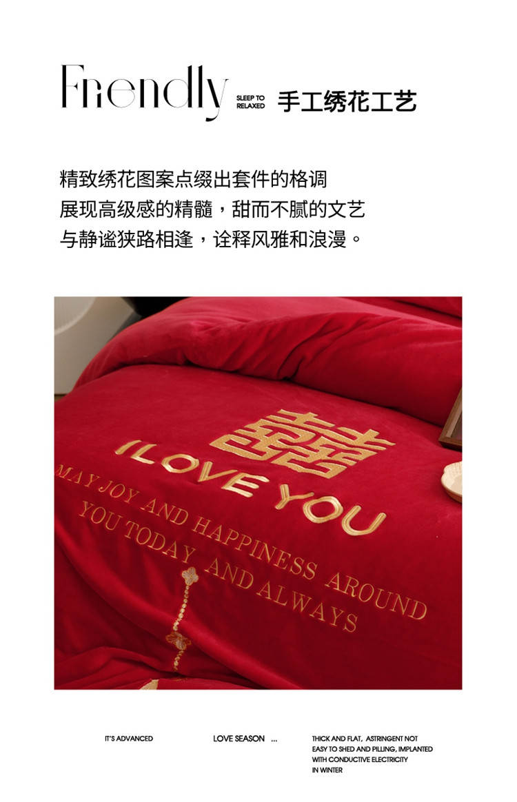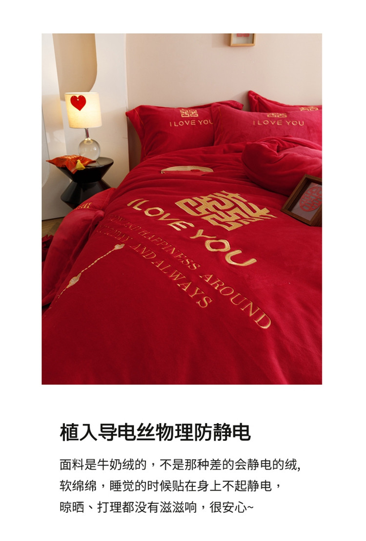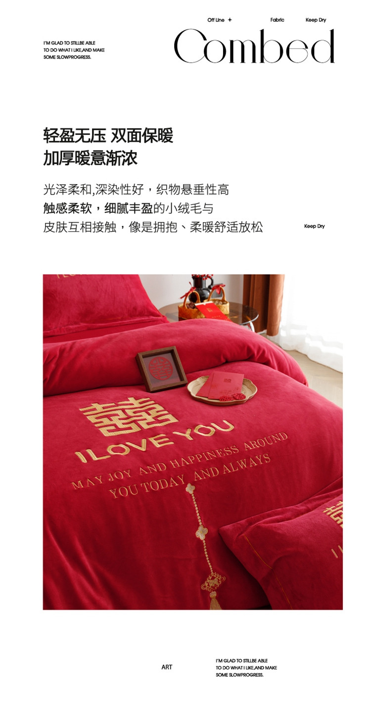 商品名称:铭动 2023新款高克重牛奶绒刺绣款婚庆大红色新婚四件套 倾心