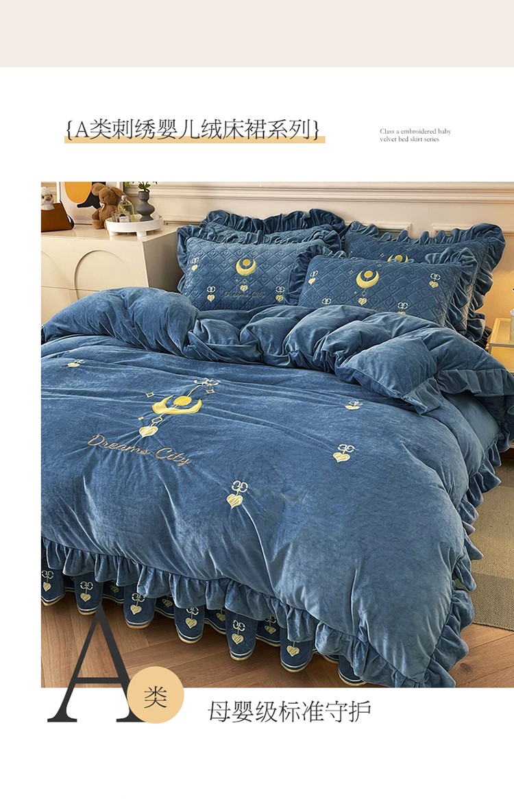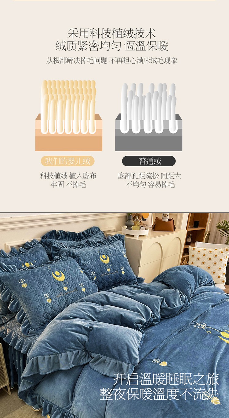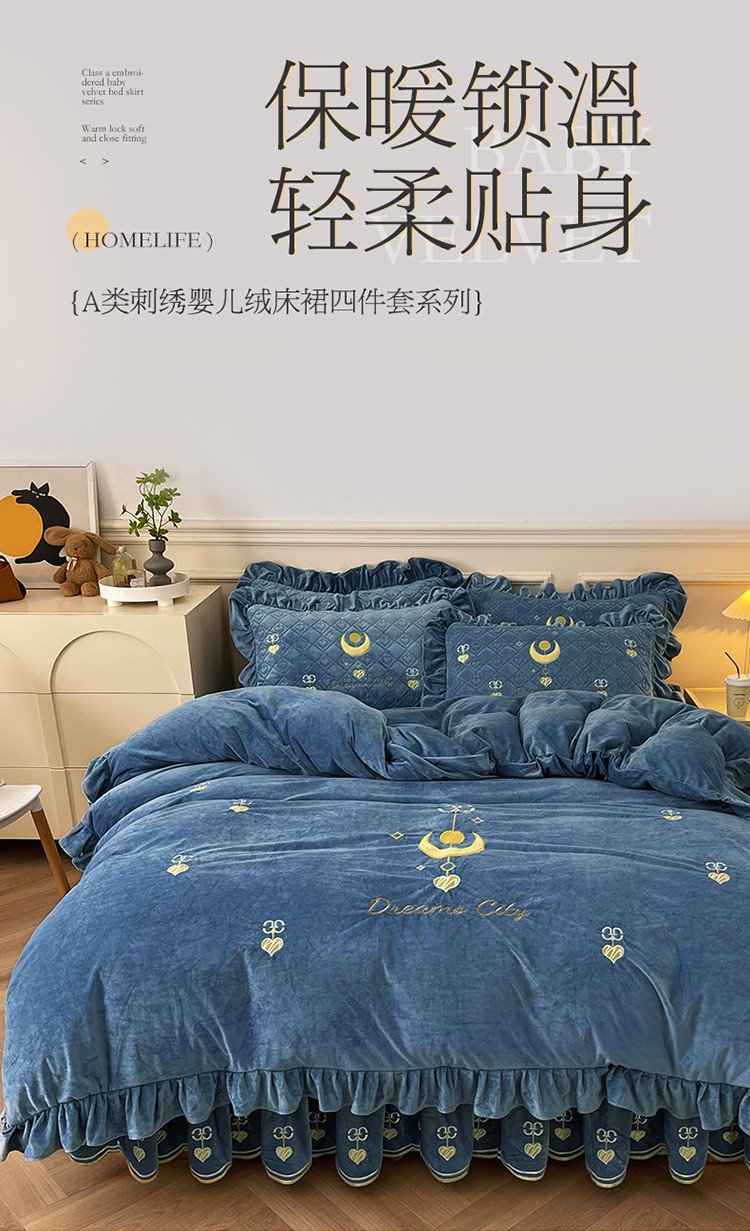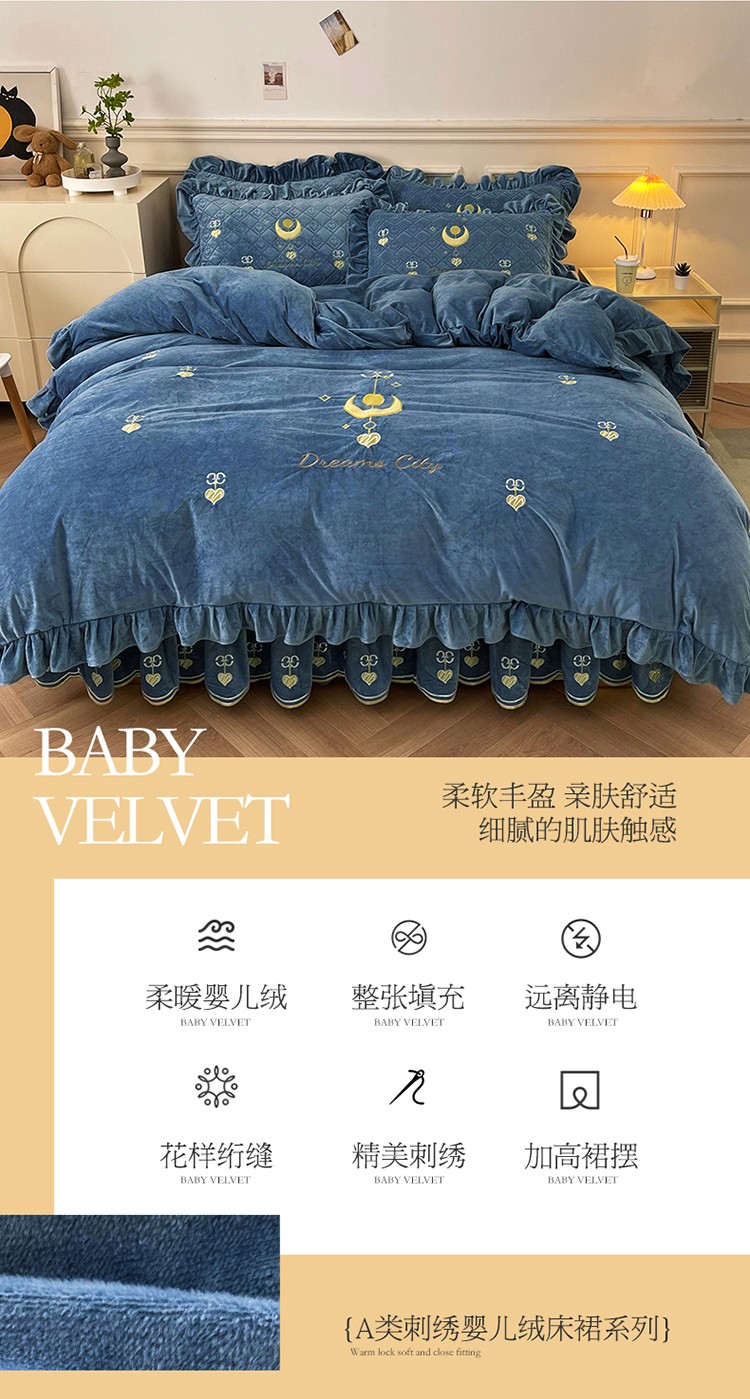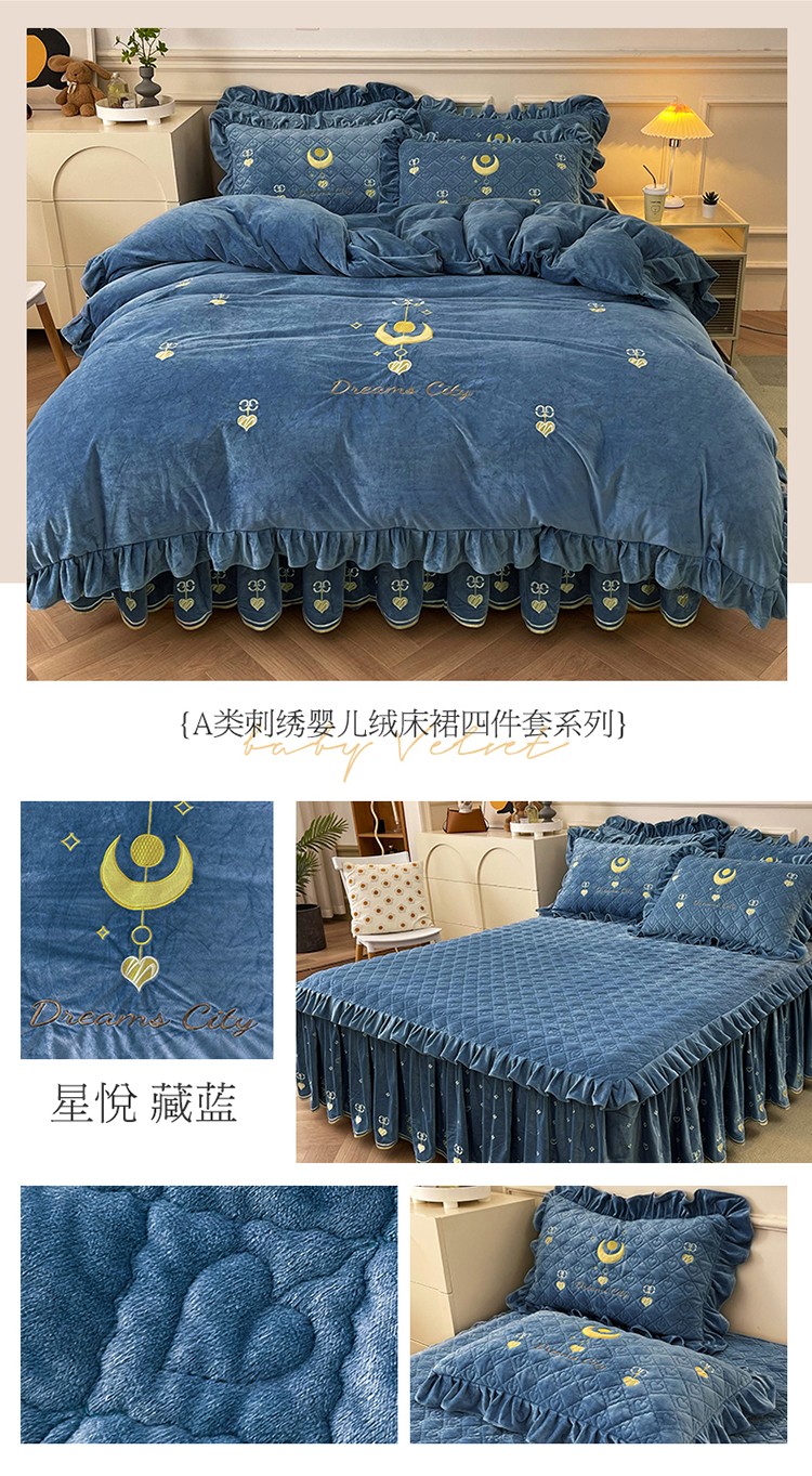 当前位置: 91家纺网 > 商品网购 > 床品套件 > 四件套 > 宝宝绒四件套 > 宜凡家纺 2022新款A类婴儿绒床裙星悦系列四件套 星悦-藏蓝