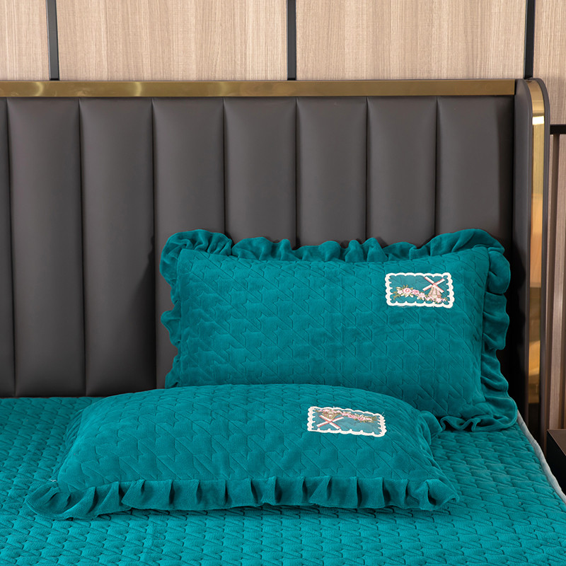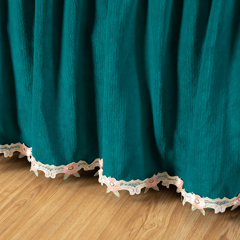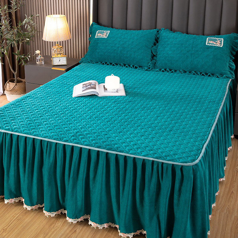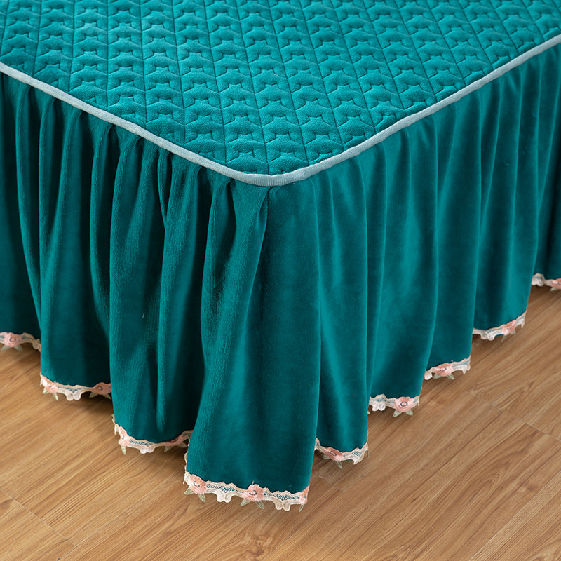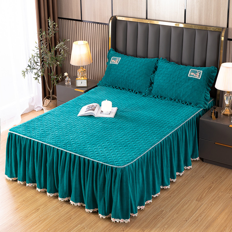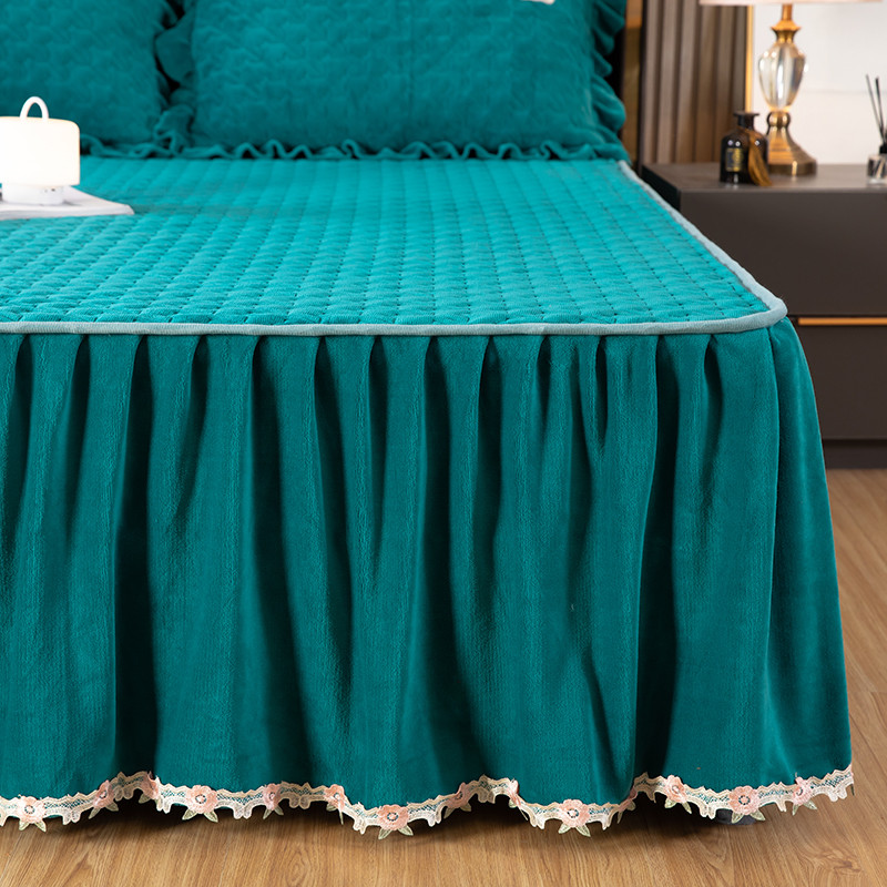 商品名称:木兰花 牛奶绒夹棉纯色床裙水晶法莱绒三件套-国色天香宝石绿