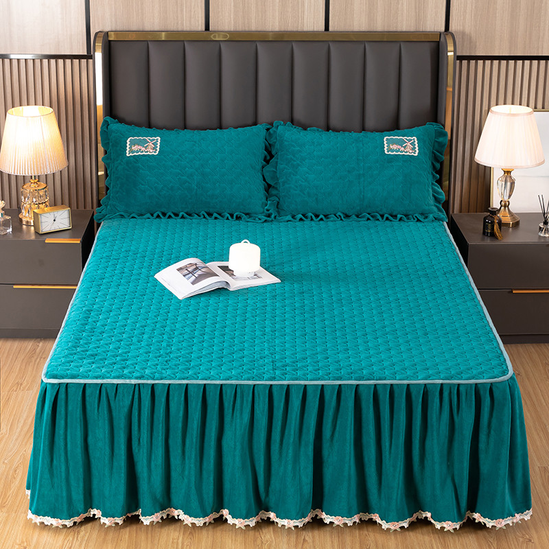 木兰花 牛奶绒夹棉纯色床裙水晶法莱绒三件套-国色天香宝石绿