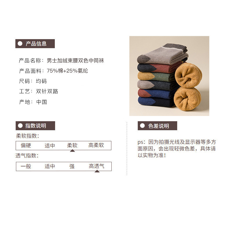 商品名称:【男士拼色加绒袜】日式无印男士加绒中筒袜良品拼色秋冬保暖加绒加厚男袜子