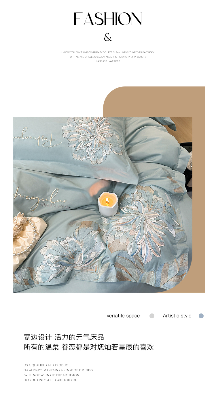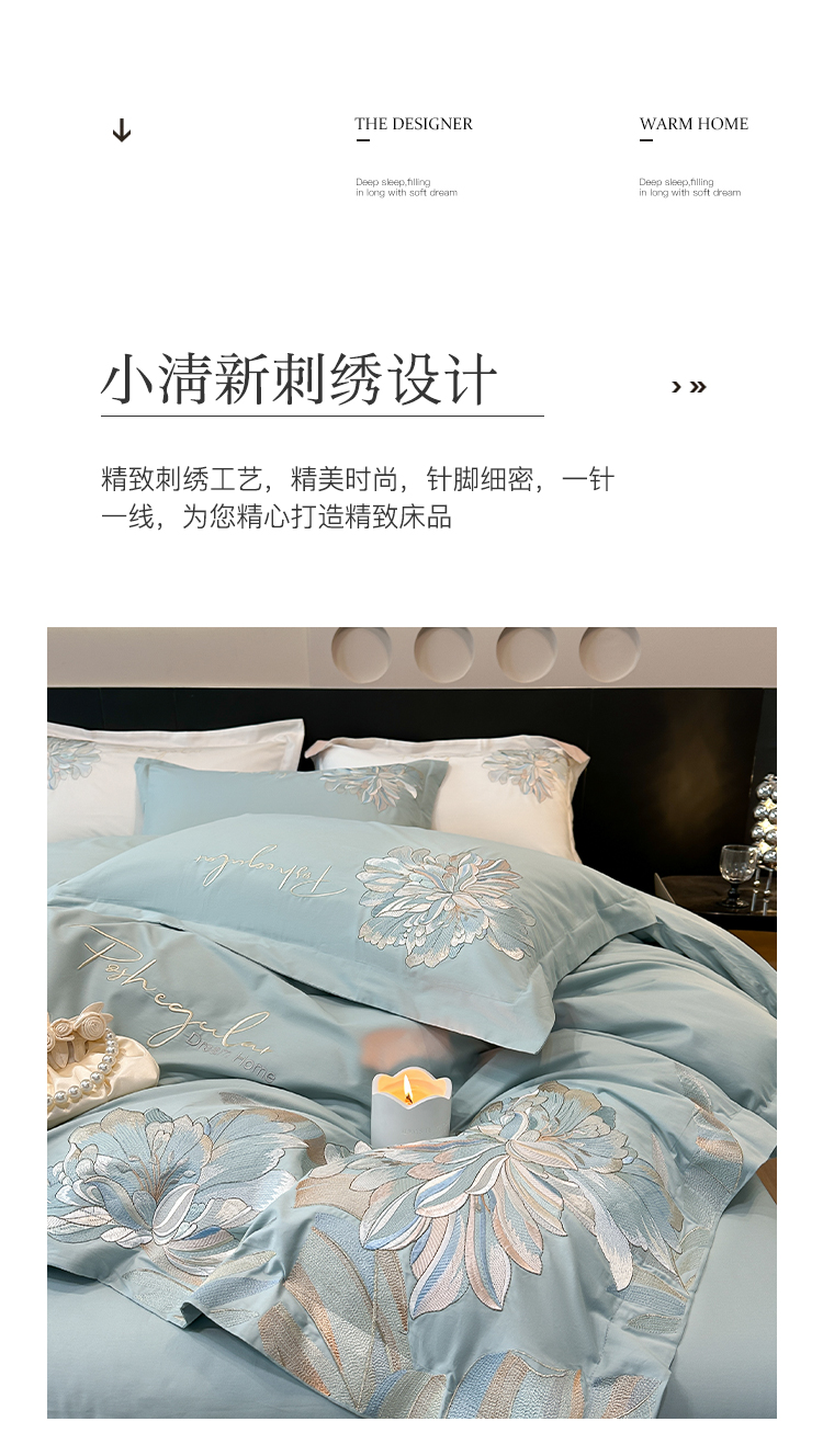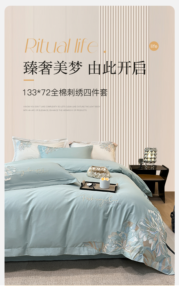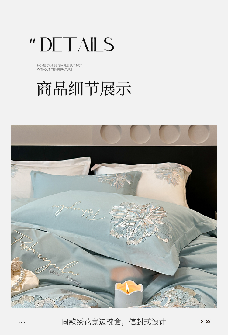 (总)理想家家纺 2025新款纯棉轻奢刺绣四件套--心愿系列场景二,心愿粉,心愿红,心愿黄,心愿蓝