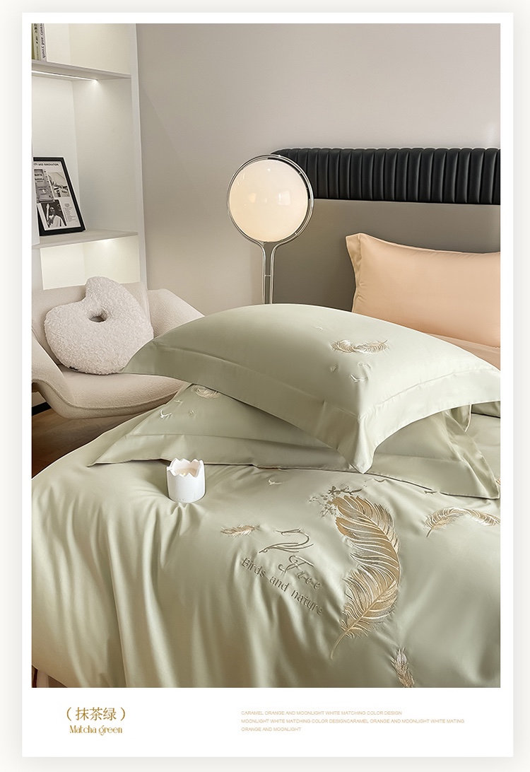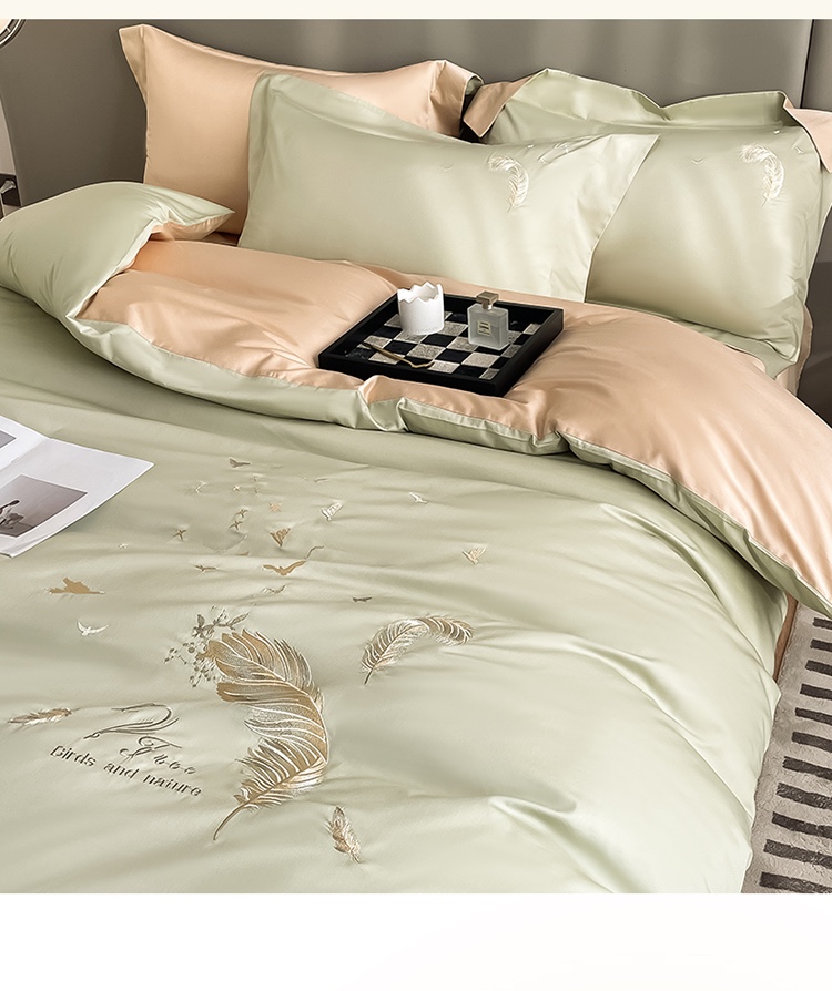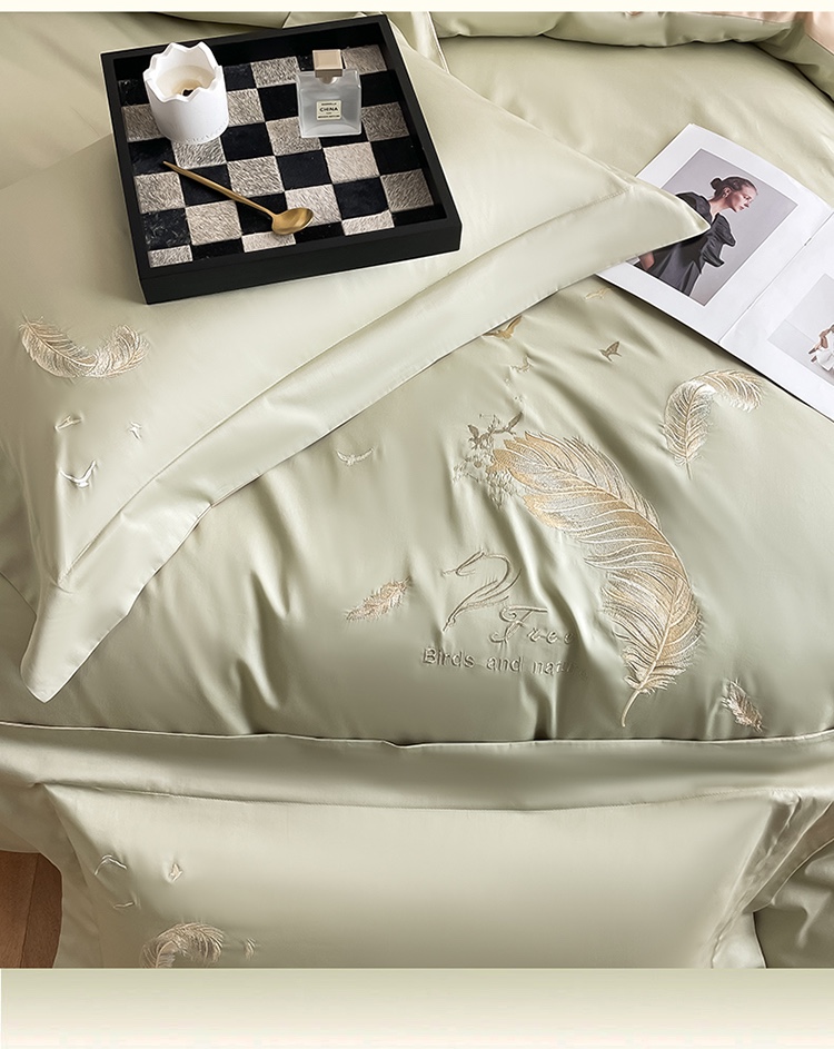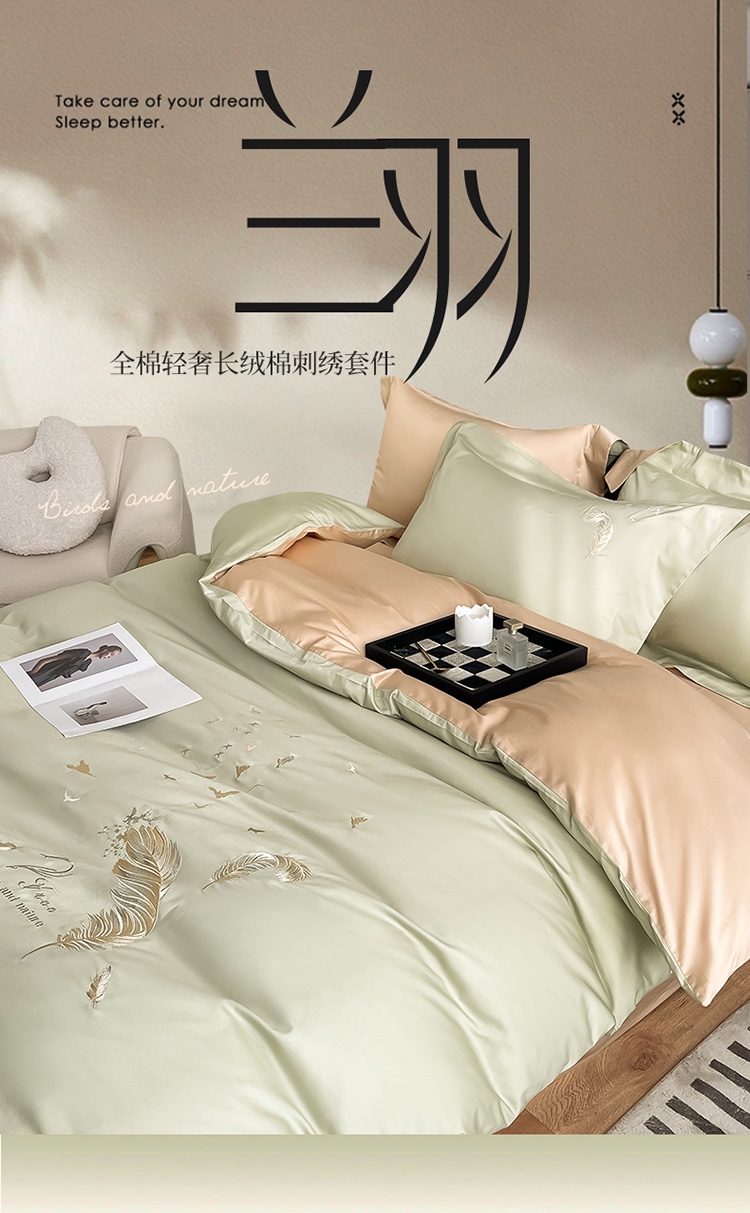 蓝米卡夫 2024全棉高级感长绒棉刺绣兰羽系列-单被套 兰羽-果绿香槟