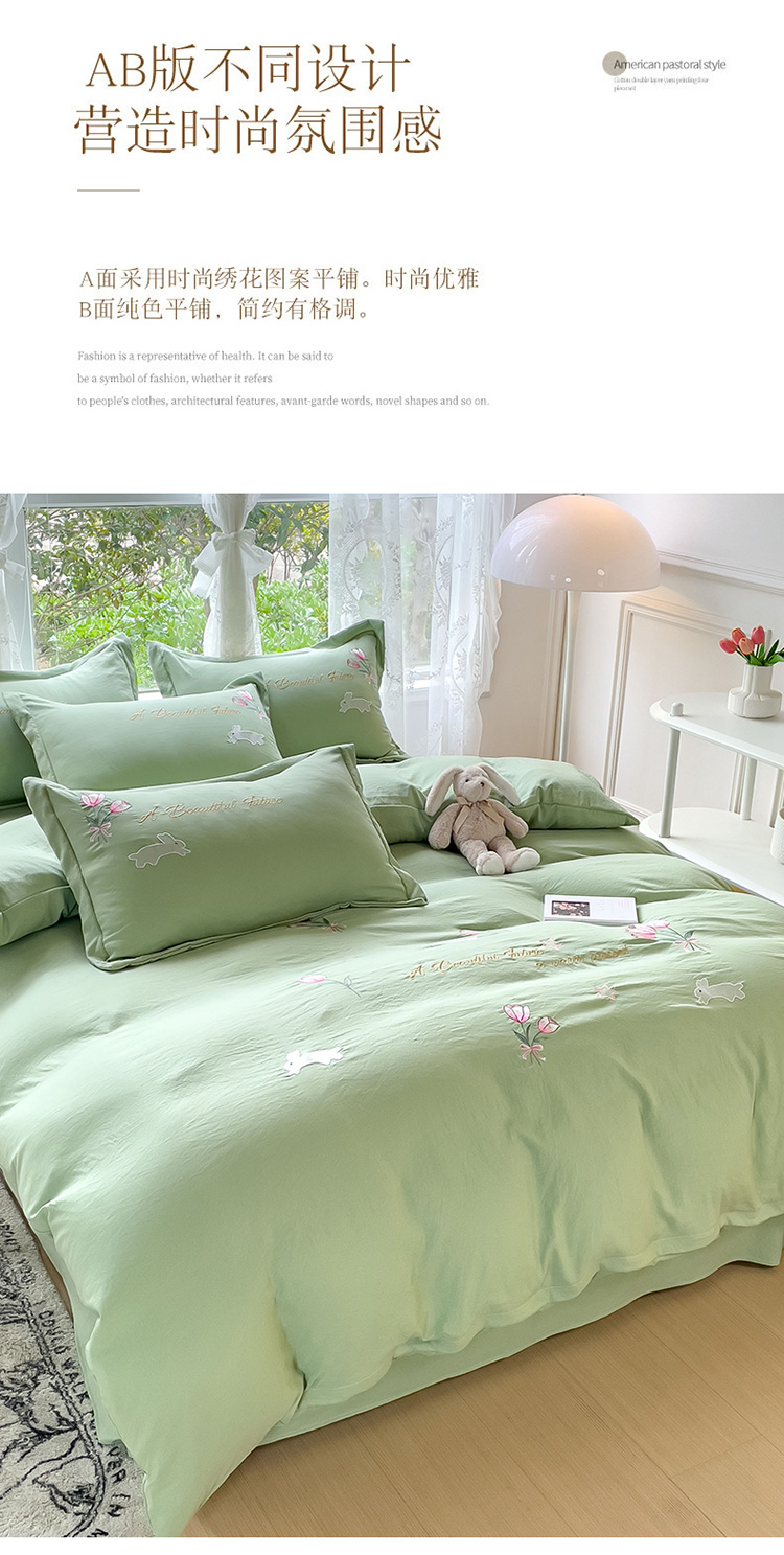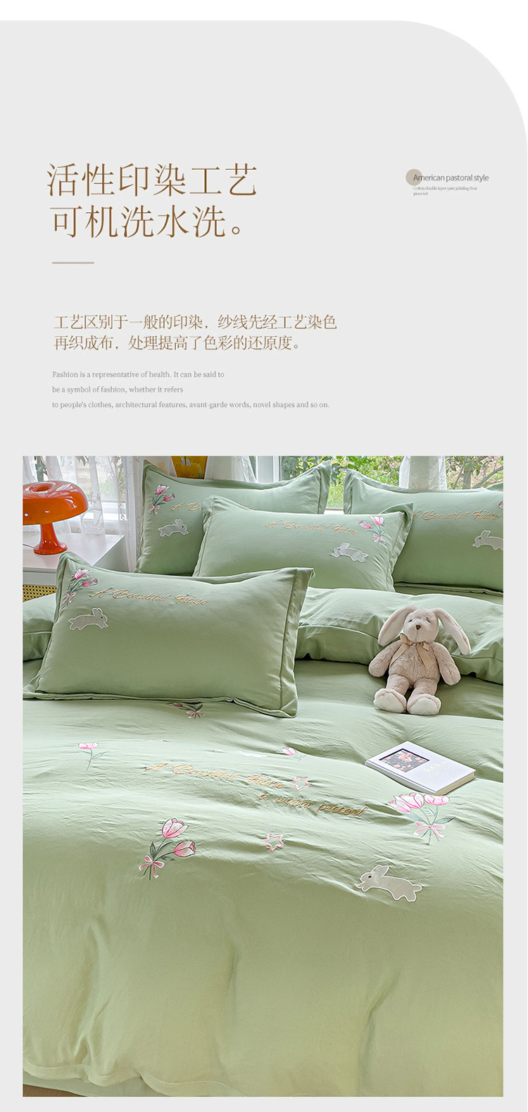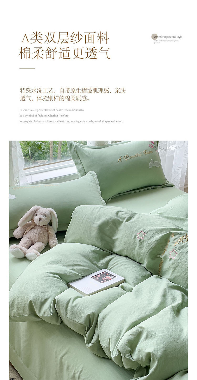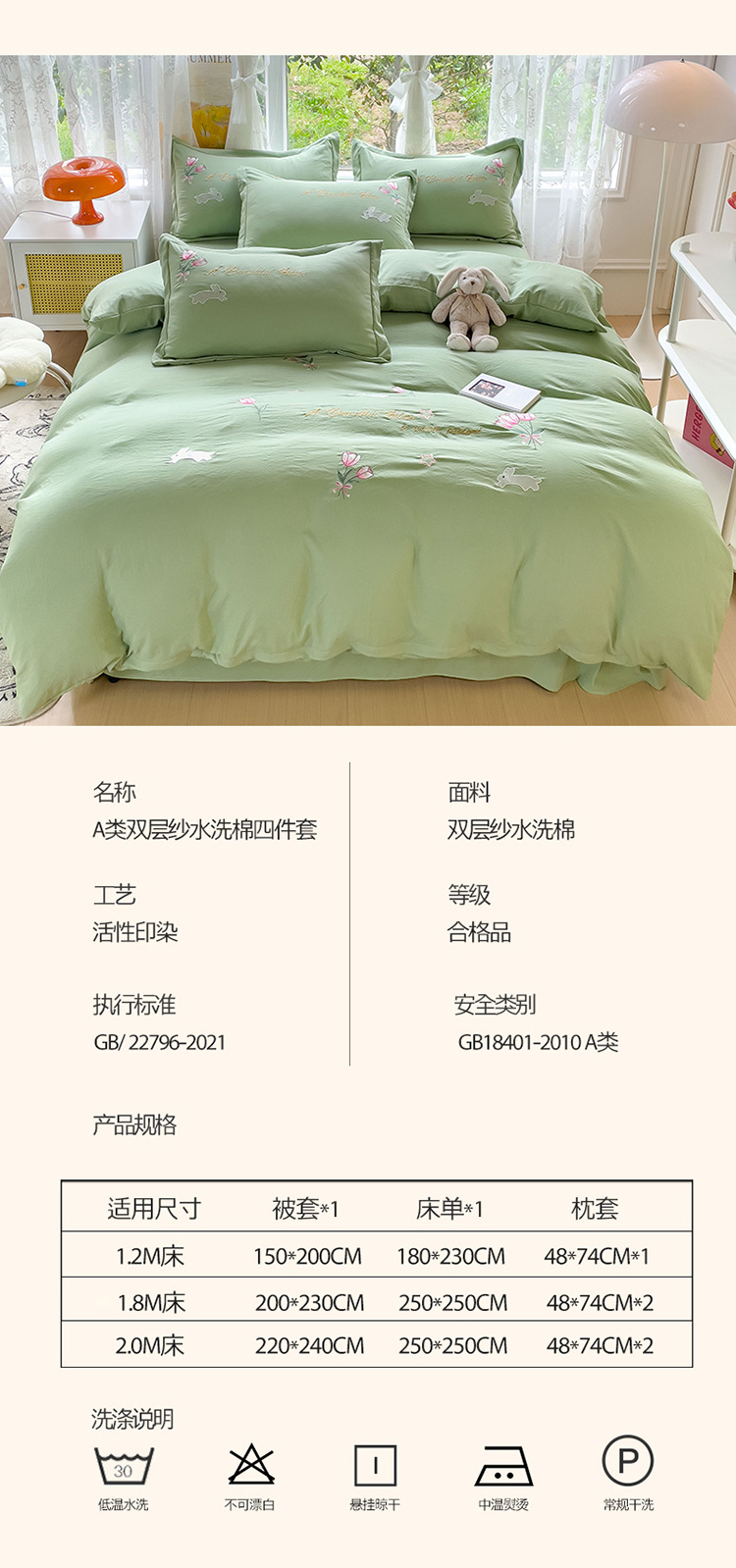 商品名称:2023春夏新品A类双层纱水洗棉麻四件套-郁金香系列 郁金香-青提绿