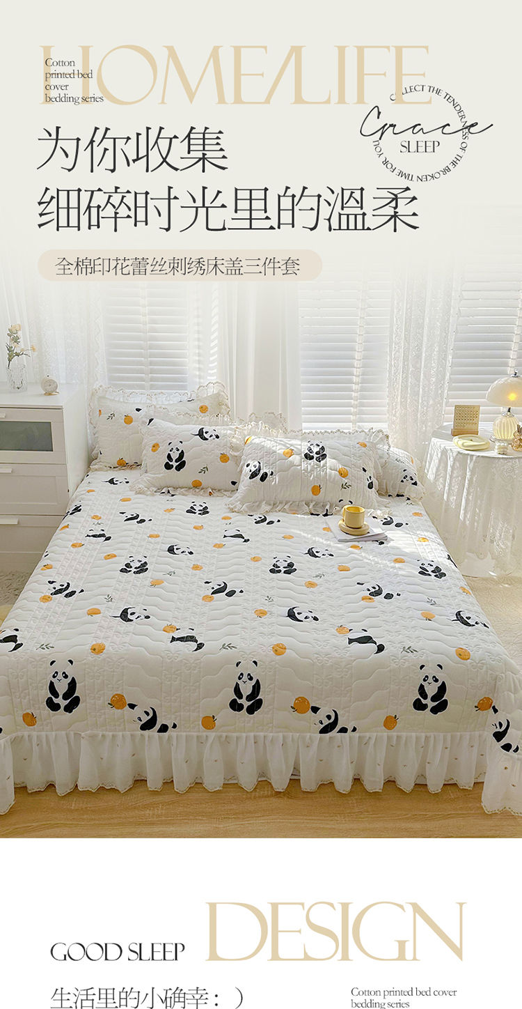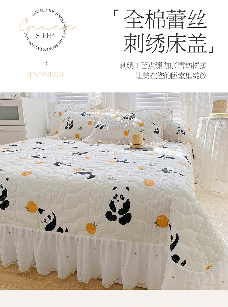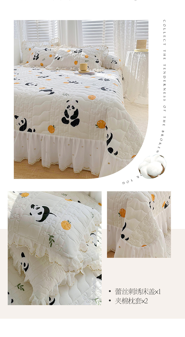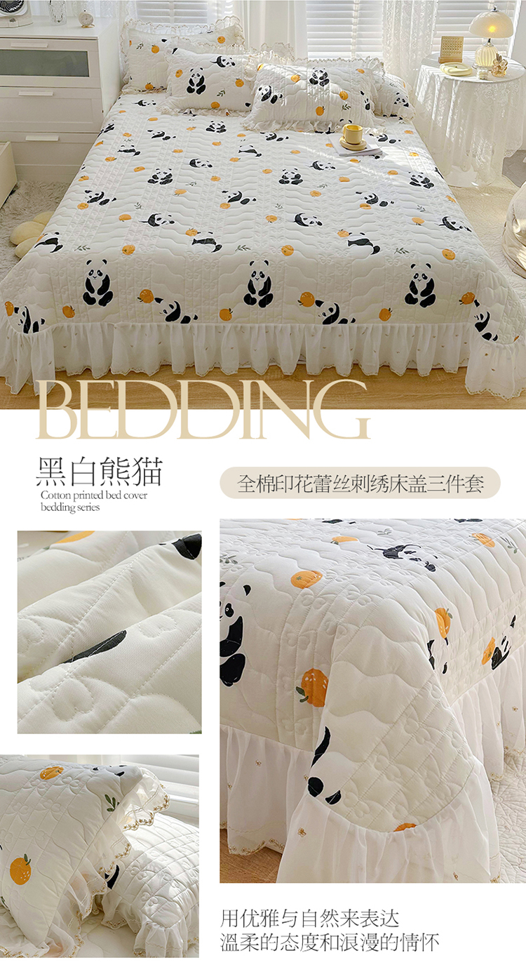 宜凡 2023新款全棉蕾丝刺绣床盖三件套 黑白熊猫