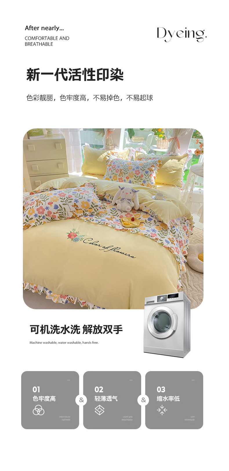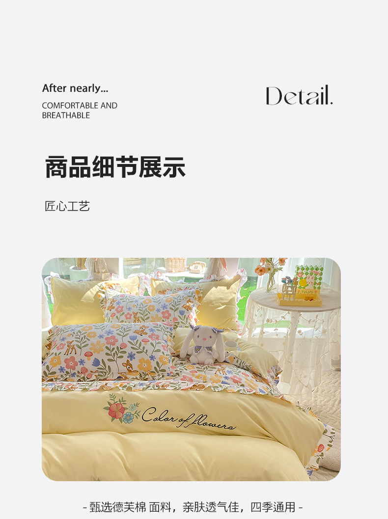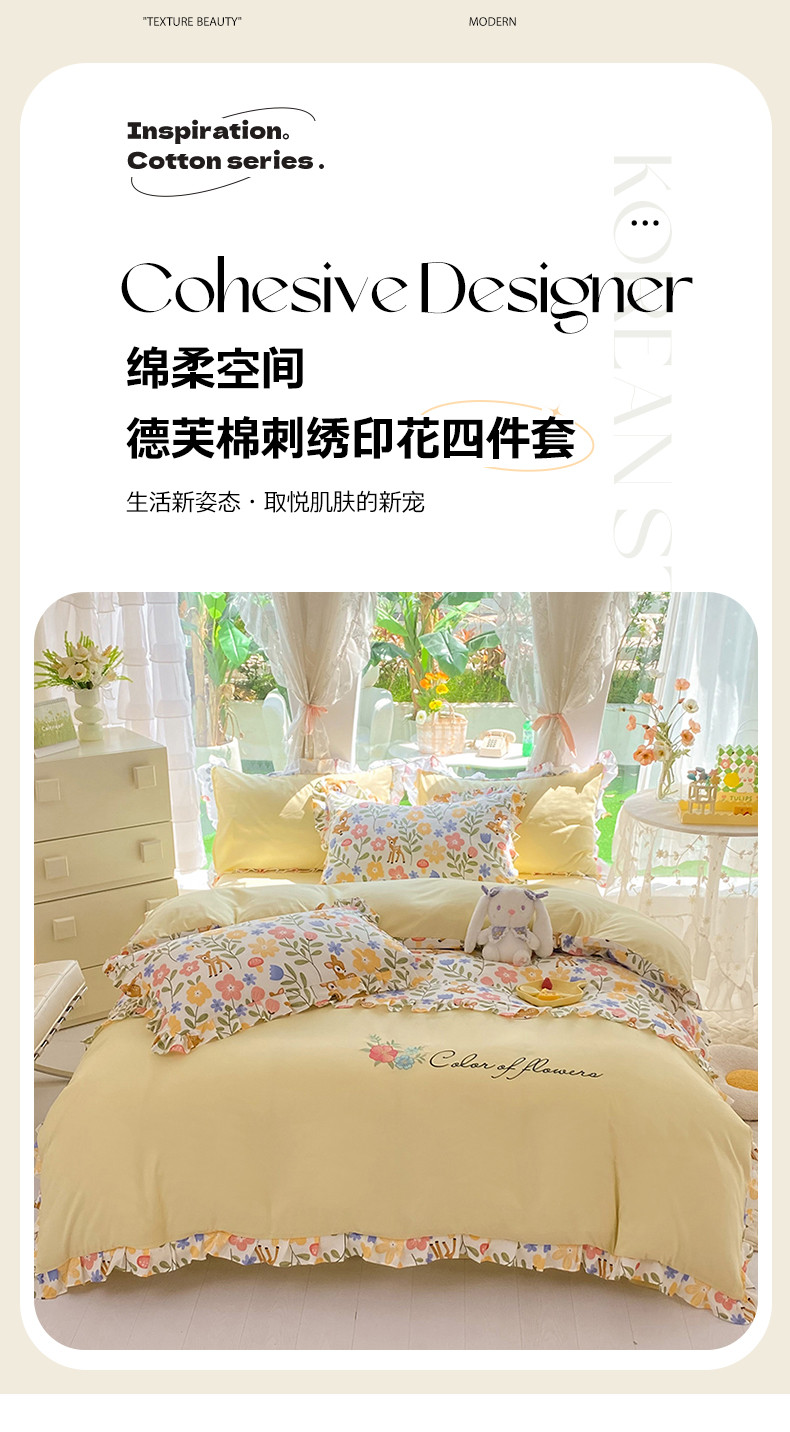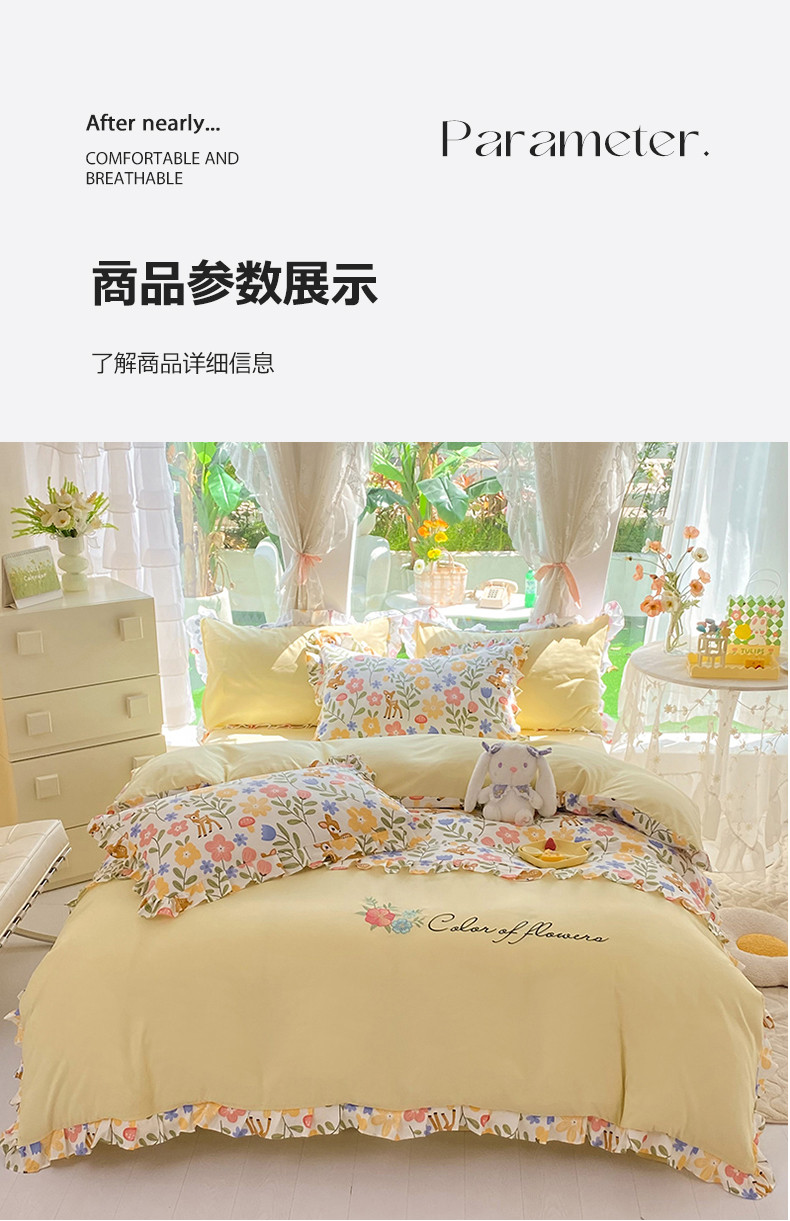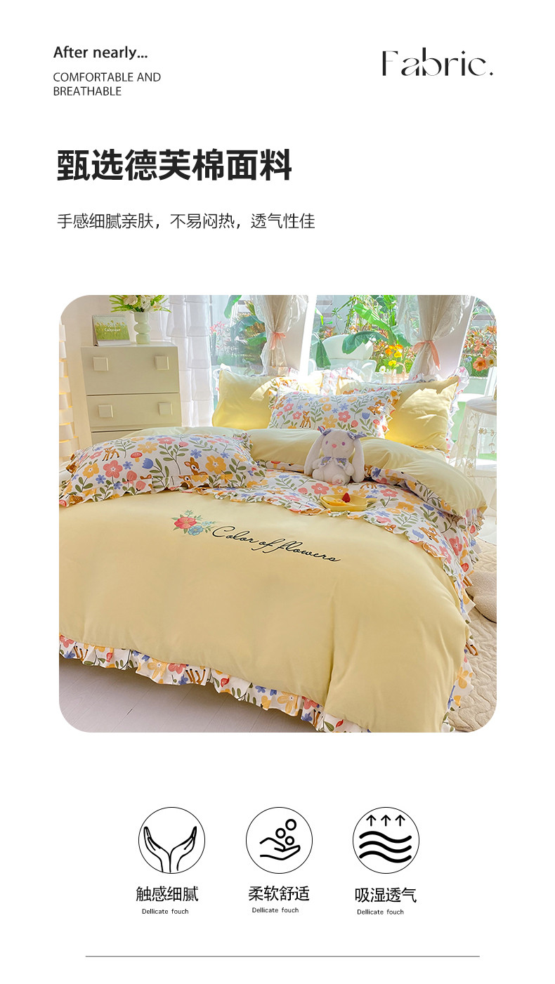 当前位置: 91家纺网 > 商品网购 > 床品套件 > 四件套 > 水洗棉四件套 > 易辰美 2024新款双层纱水洗磨毛德芙棉绣花四件套 笑颜如花