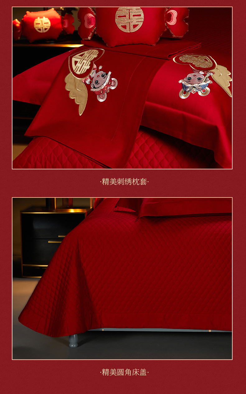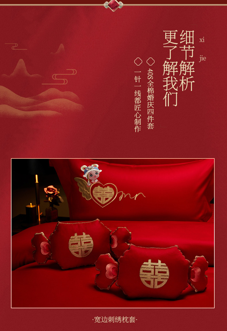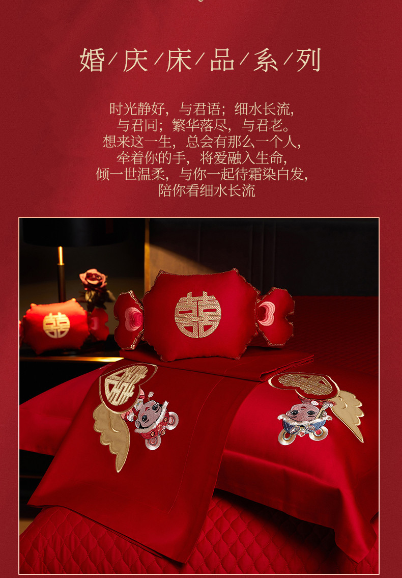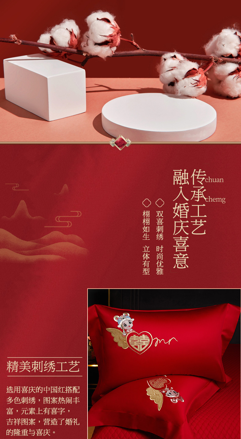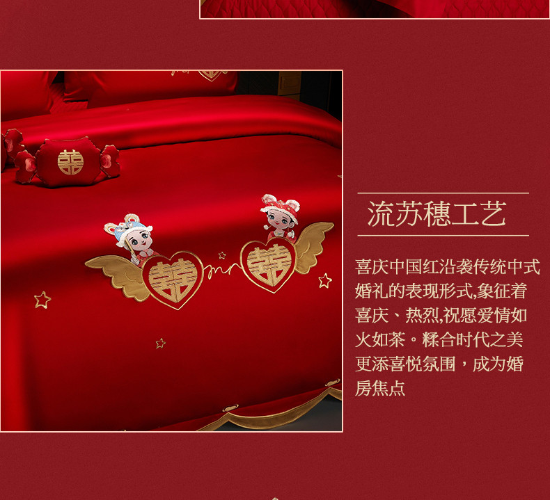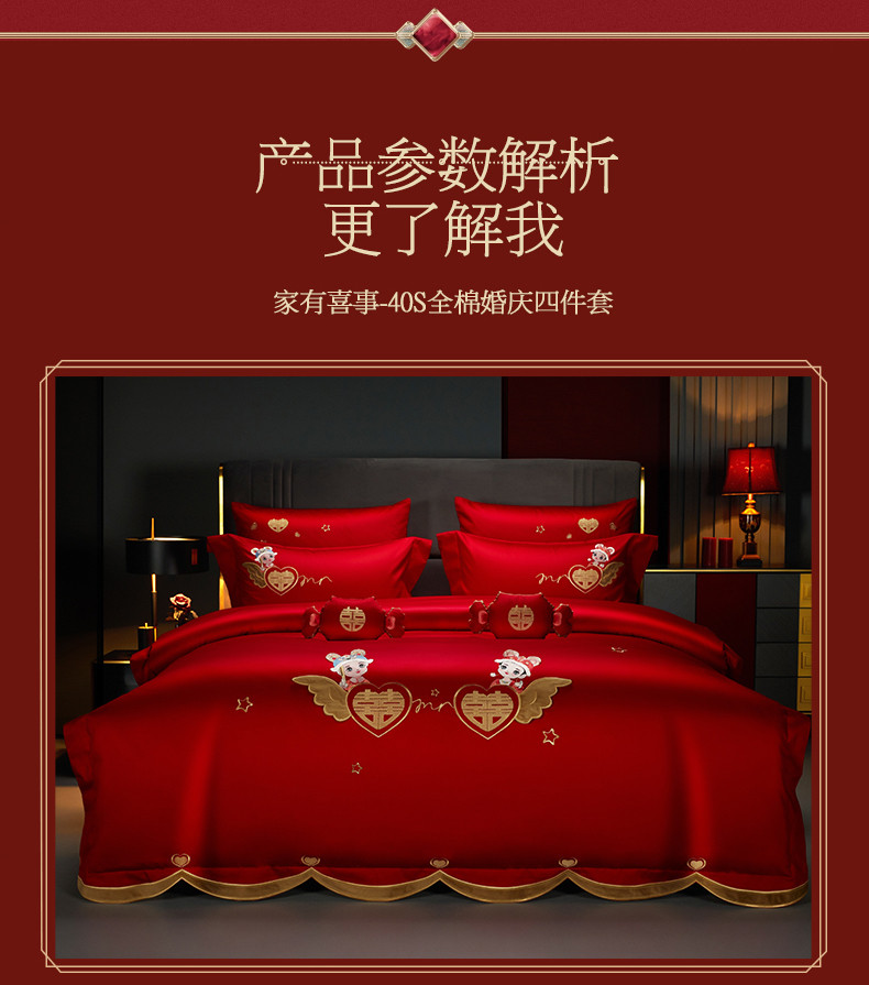 当前位置: 91家纺网 > 商品网购 > 床品套件 > 多件套 > 多件套 > 美娘阁 2023年秋冬新品长绒棉刺绣系列婚庆 四件套/多件套 天生一对