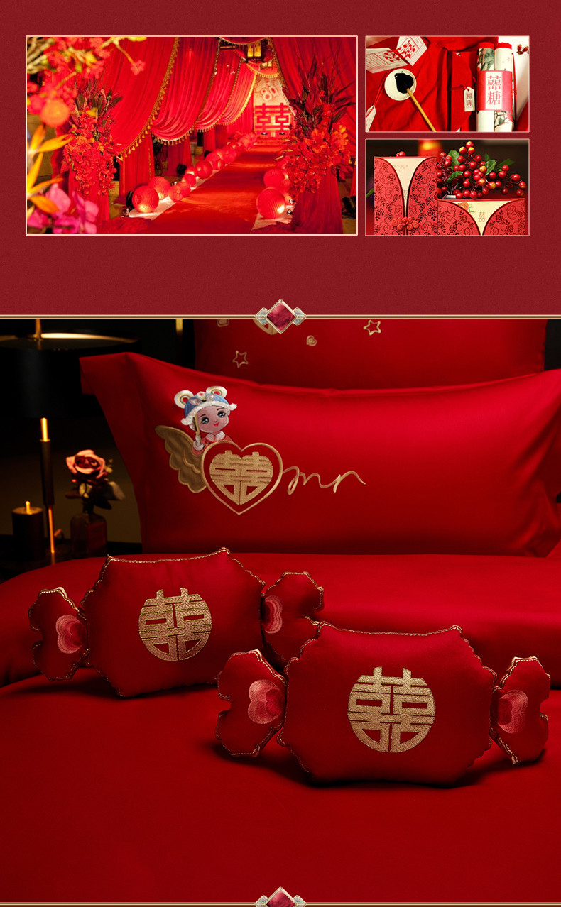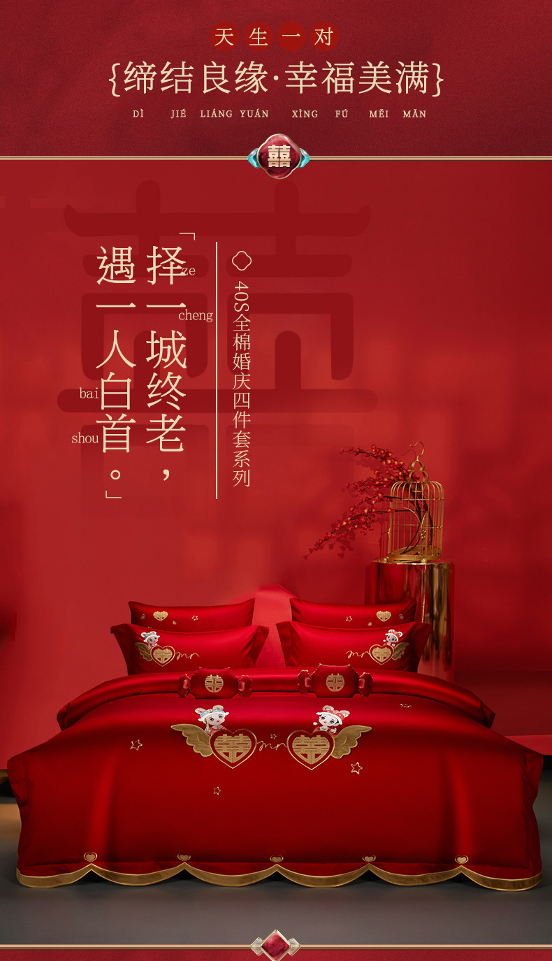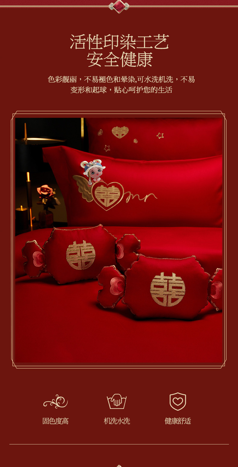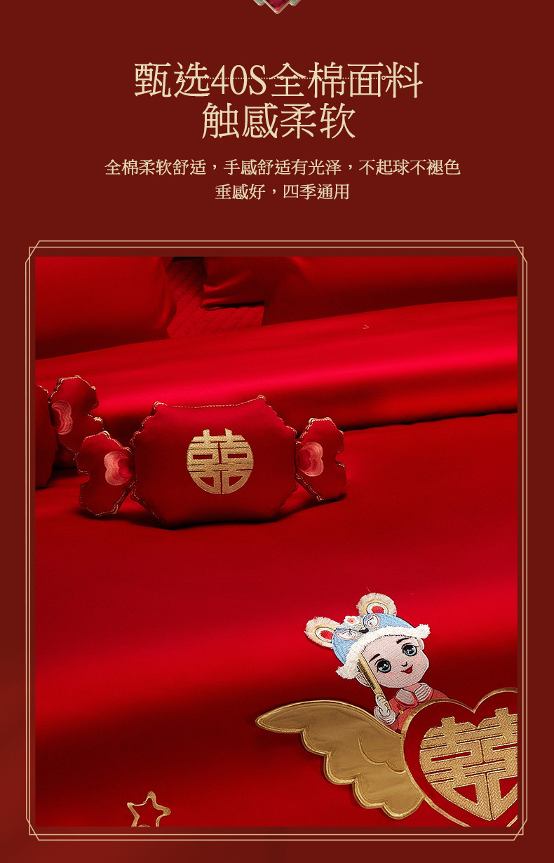 当前位置: 91家纺网 > 商品网购 > 床品套件 > 多件套 > 多件套 > 美娘阁 2023年秋冬新品长绒棉刺绣系列婚庆 四件套/多件套 天生一对