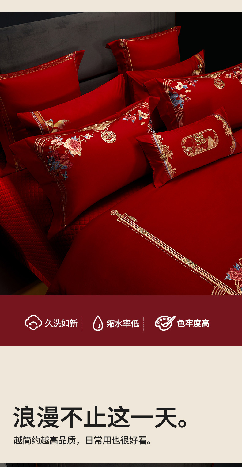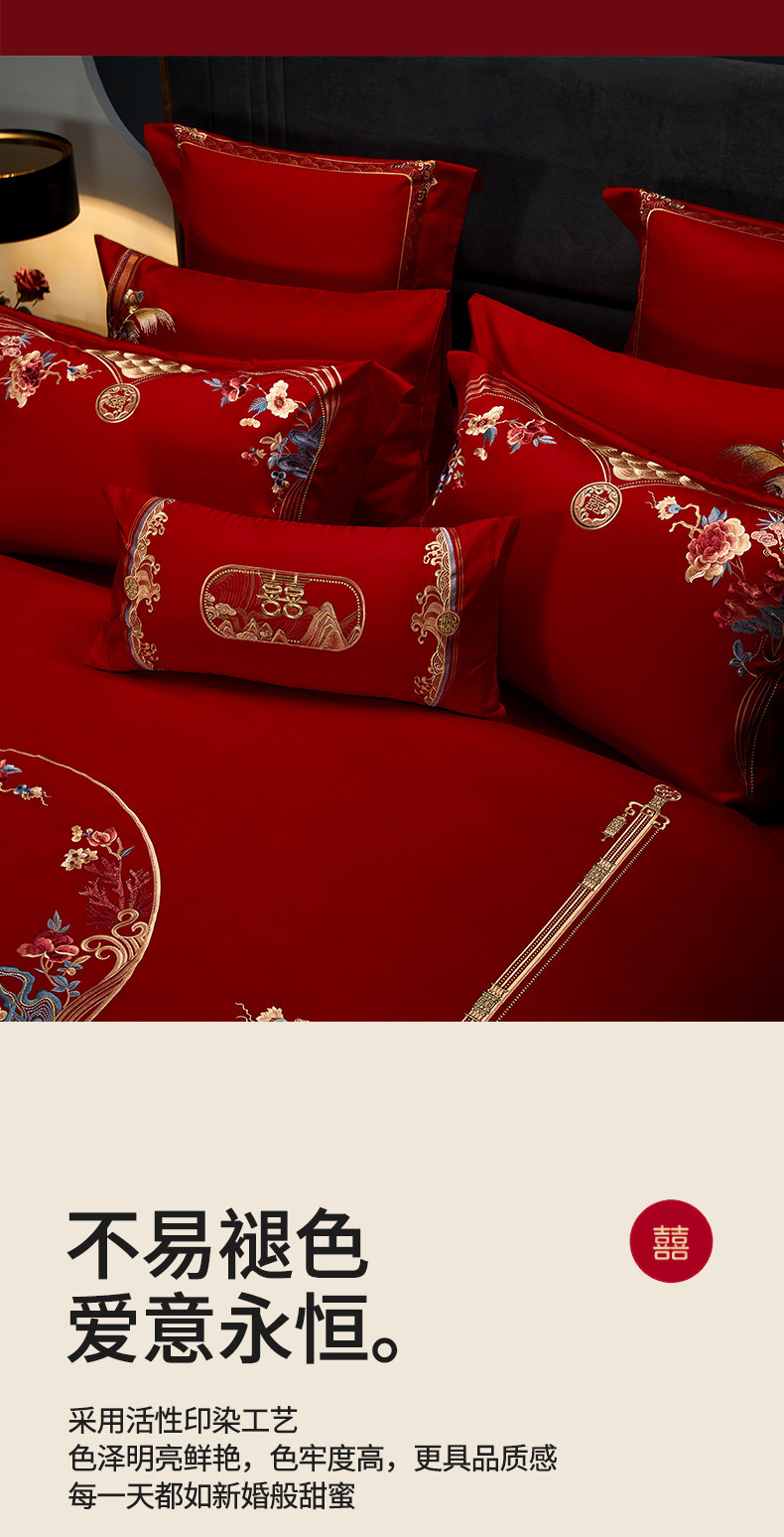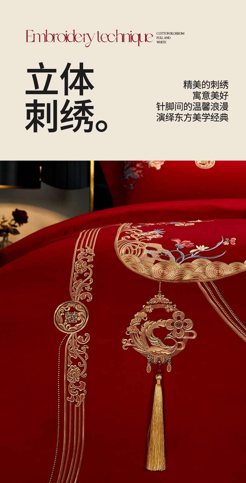 当前位置: 91家纺网 > 商品网购 > 床品套件 > 四件套 > 长绒棉四件套 > 美娘阁 2023年秋冬新款双面长绒棉刺绣提花工艺系列款婚庆套件 花前月下