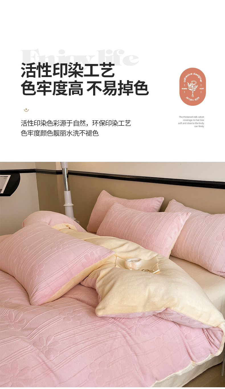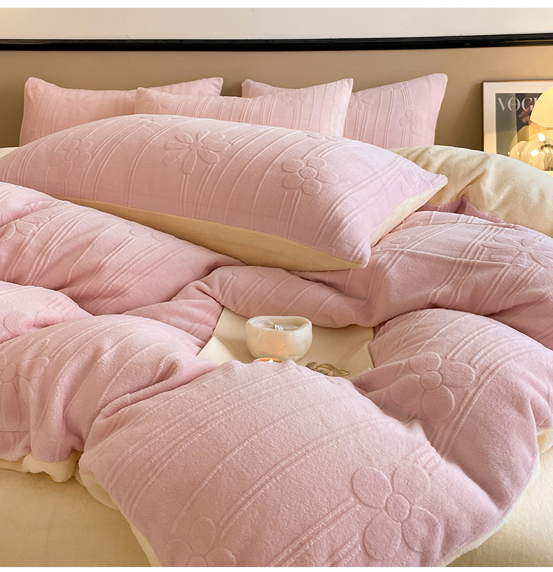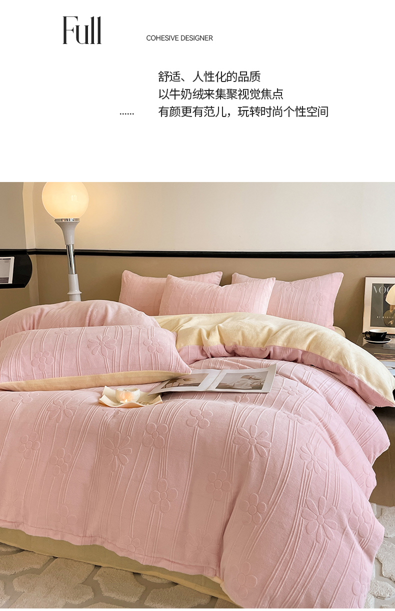 商品名称:澳梵 2023新款雕花牛奶绒四件套 冬日花信-粉