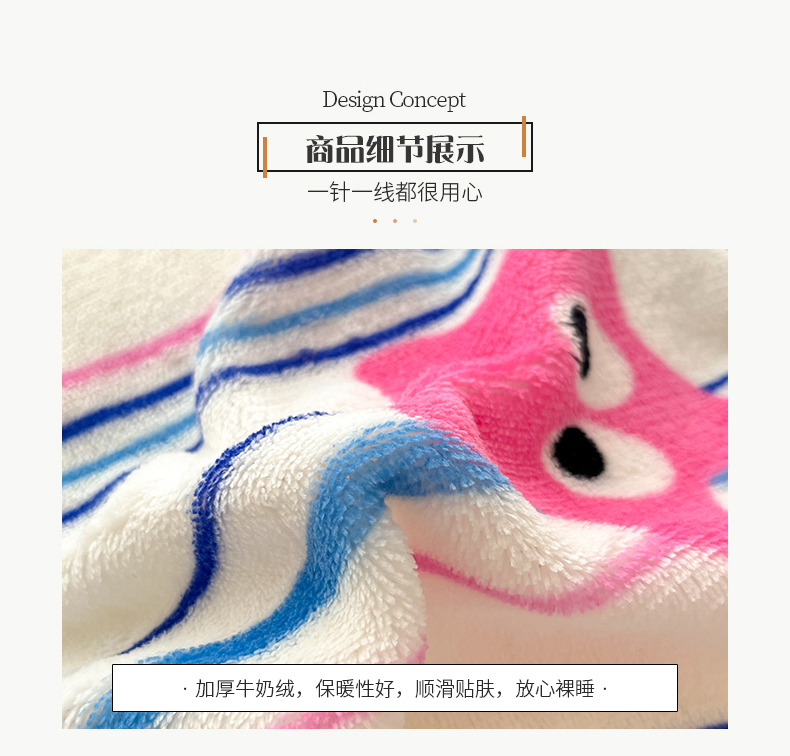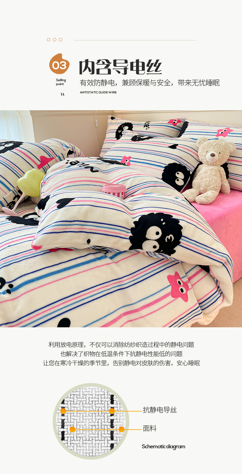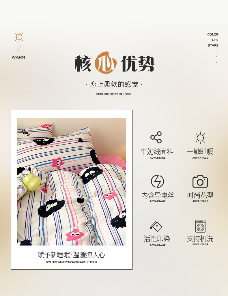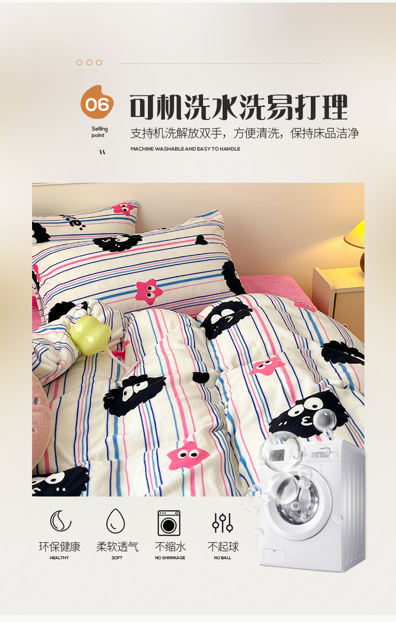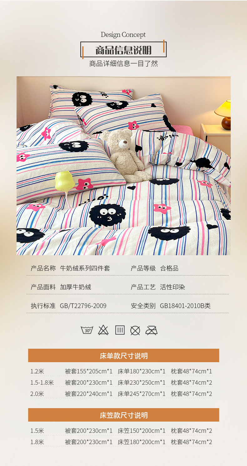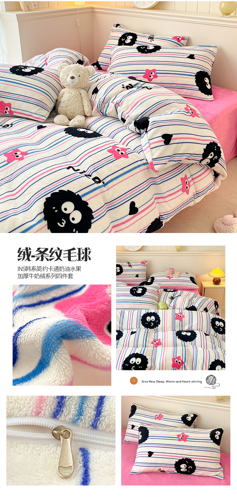 商品名称:桃子家居 2023新款ins韩系简约卡通奶油小清新加厚牛奶绒系列四件套 绒-条纹毛球