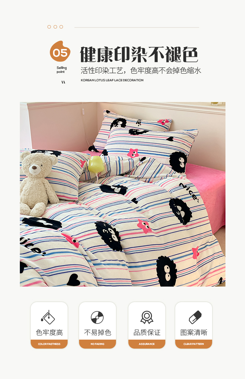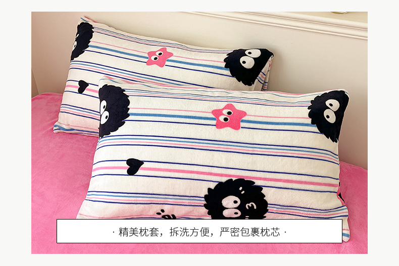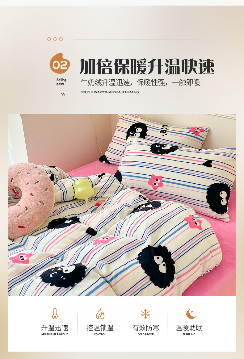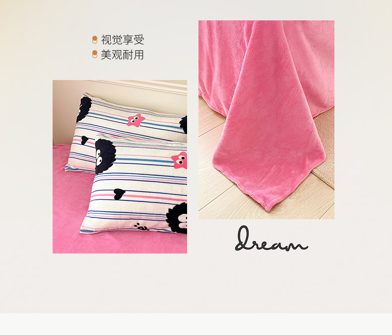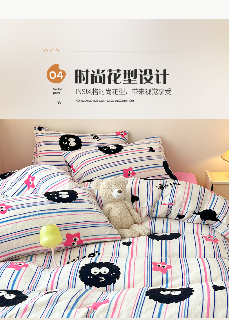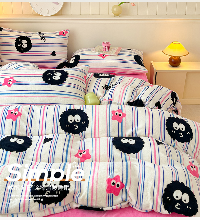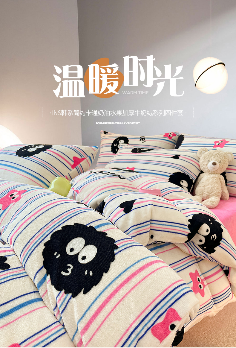 桃子家居 2023新款ins韩系简约卡通奶油小清新加厚牛奶绒系列四件套 绒-条纹毛球