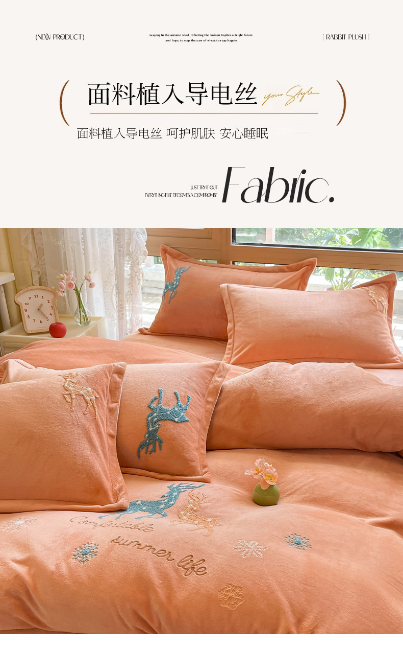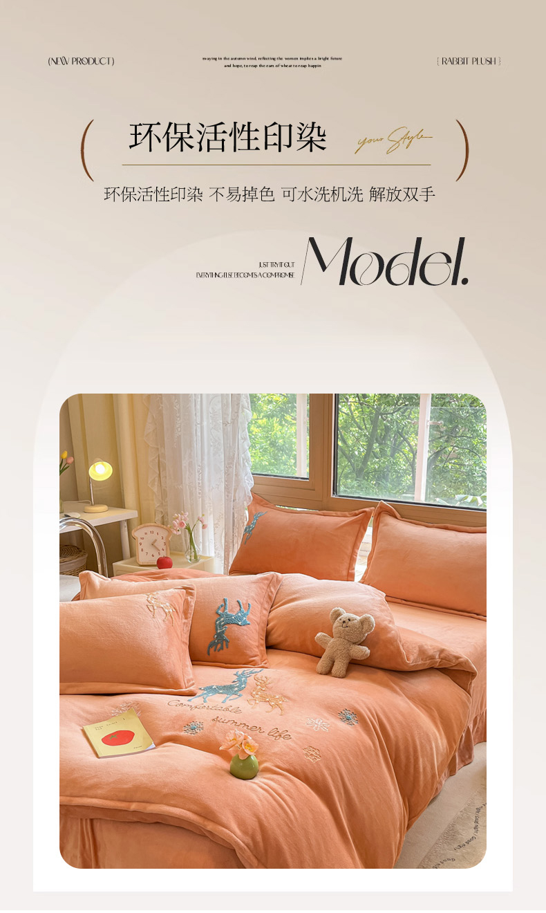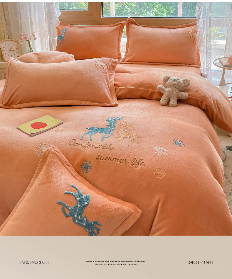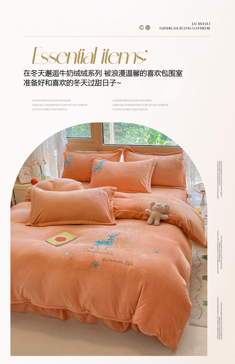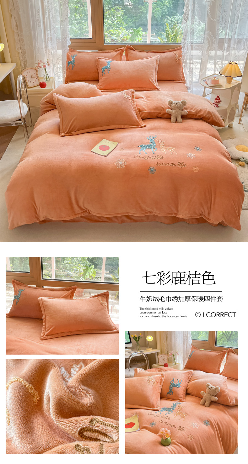 商品名称:恋佳 2023新款加厚保暖牛奶绒毛巾绣四件套 七彩鹿桔色