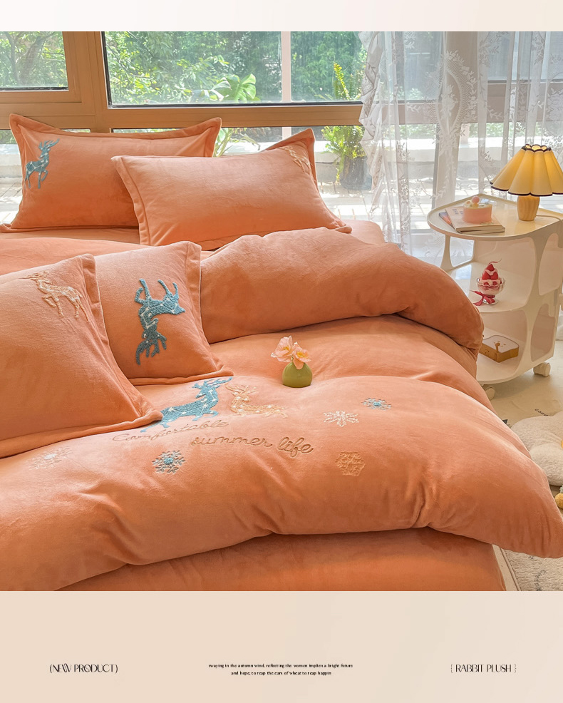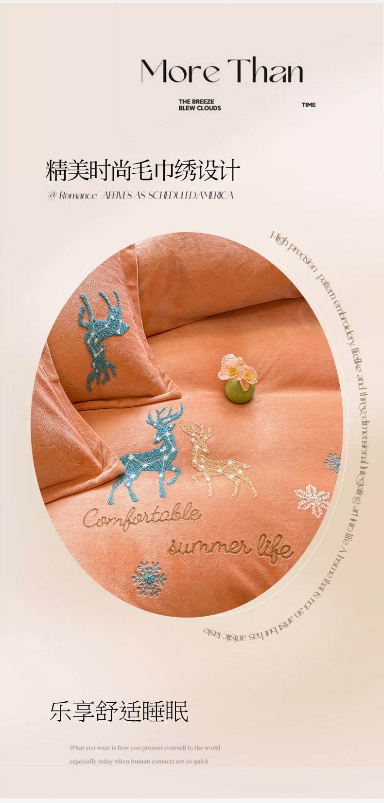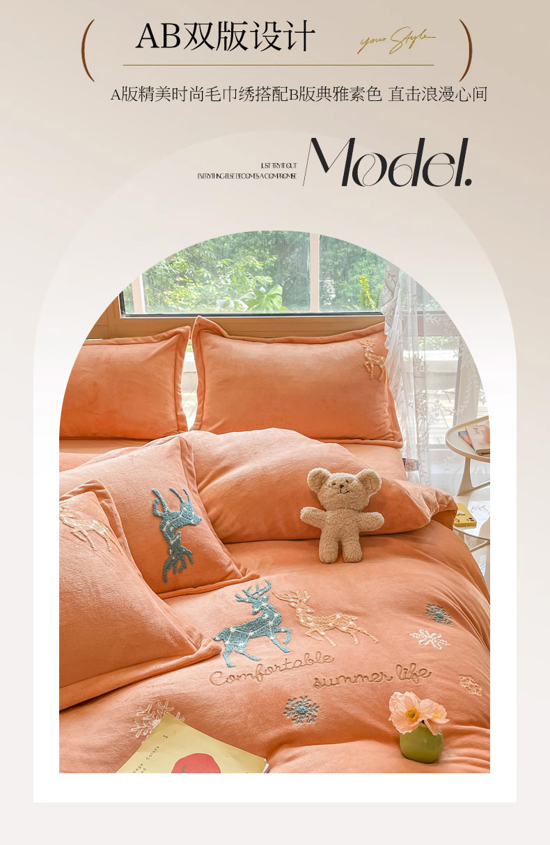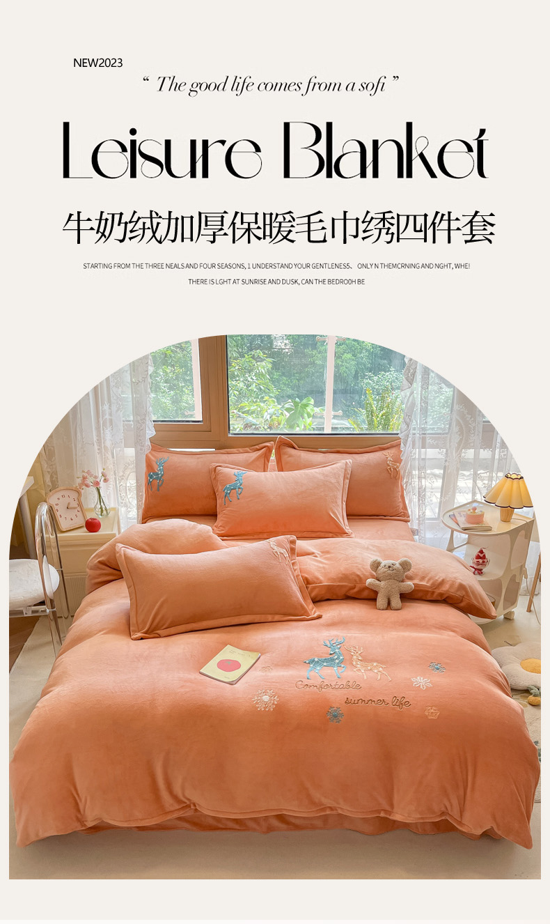 恋佳 2023新款加厚保暖牛奶绒毛巾绣四件套 七彩鹿桔色