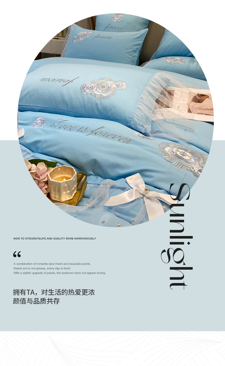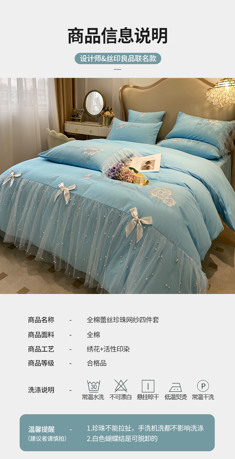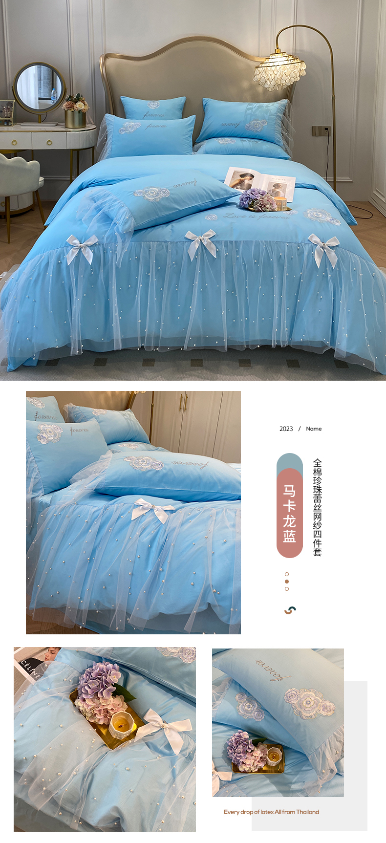 商品名称:丝印良品 2023新款秋冬保暖60S全棉蕾丝刺绣丽丽贝尔系列四件套 马卡龙蓝