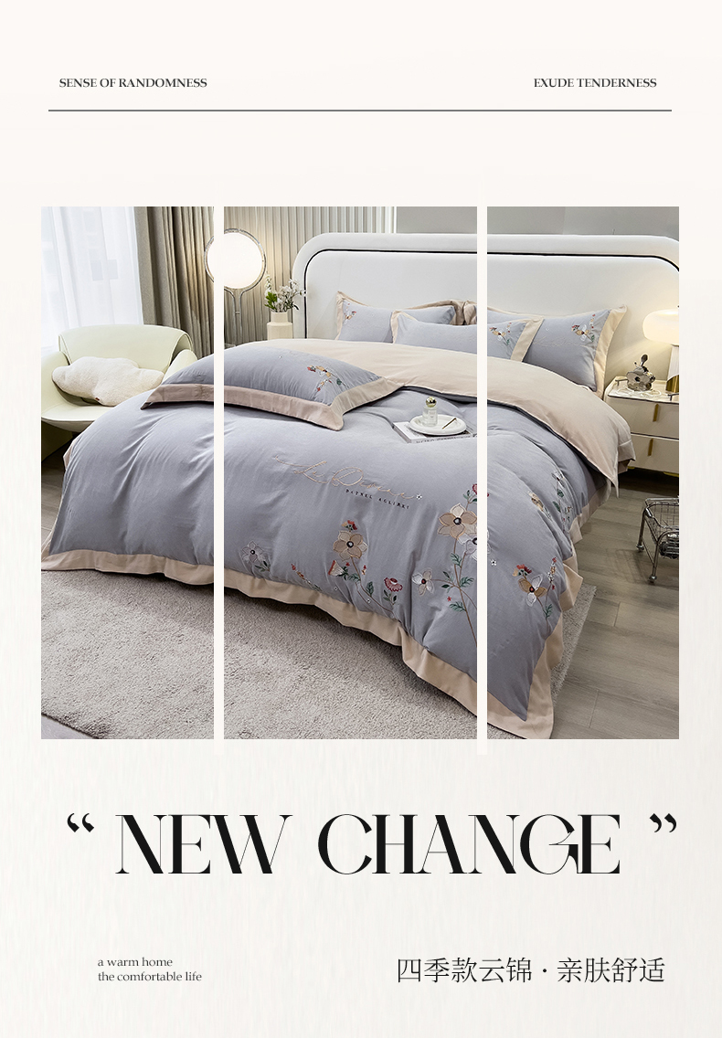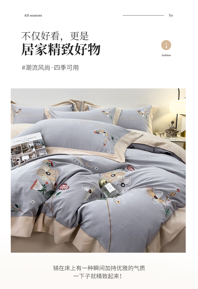 商品名称:丝印良品 2023新款秋冬保暖云锦棉刺绣宽边盛夏光年系列四件套 盛夏光年-银灰