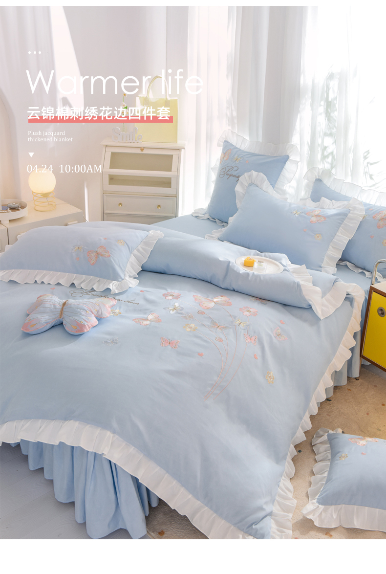 当前位置: 91家纺网 > 商品网购 > 床品套件 > 四件套 > 化纤活性四件套 > 丝印良品 2023新款秋冬保暖云锦棉刺绣花边春卉系列四件套 春卉-慕蓝
