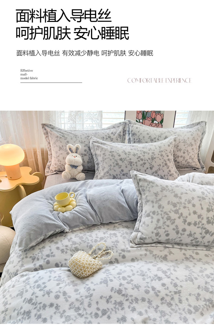 商品名称:寐居家纺 2023新款高克重剪花印花牛奶绒四件套 悠若-蓝灰