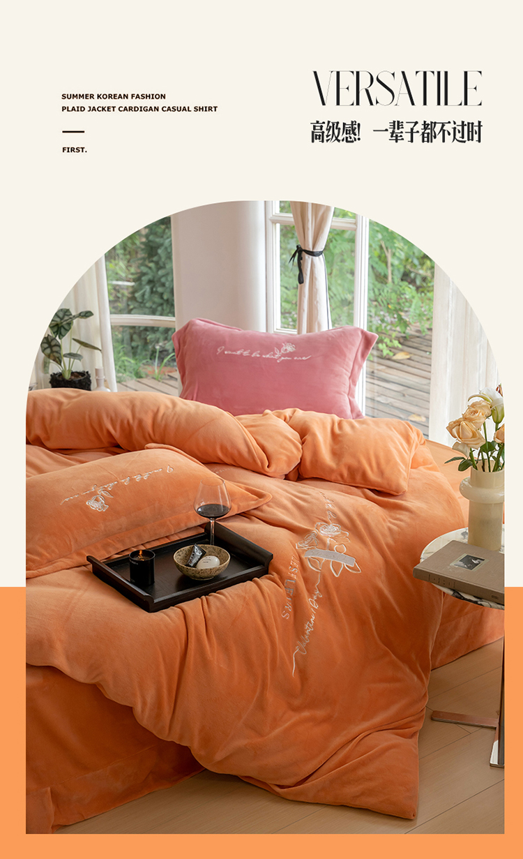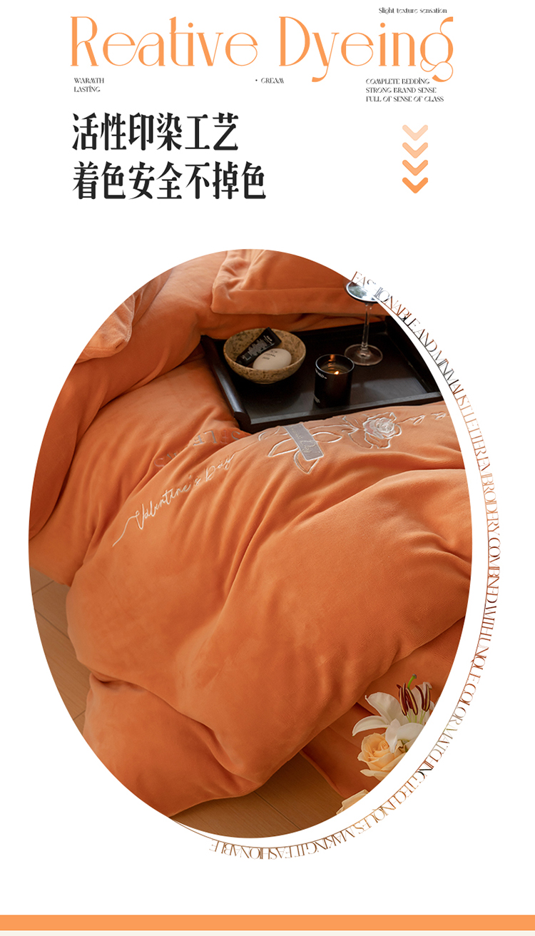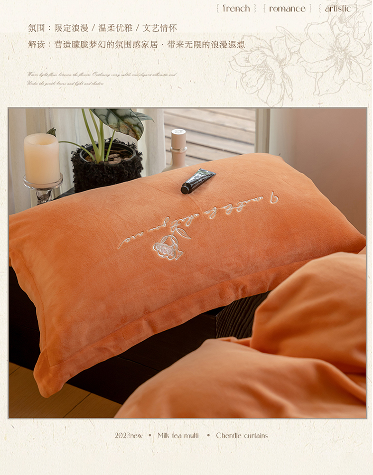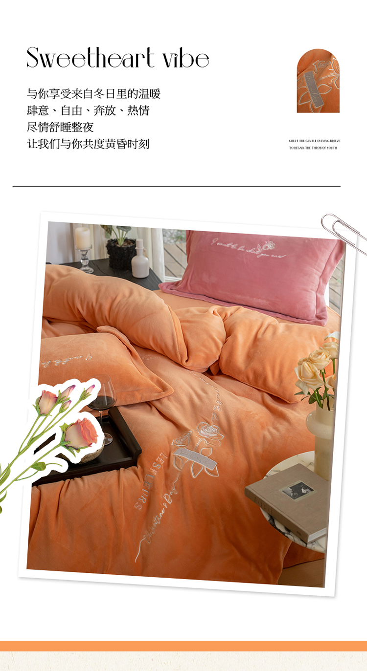 商品名称:名品优仓 2023新款高克重牛奶绒绣花浪漫玫瑰系列四件套 爱玛桔