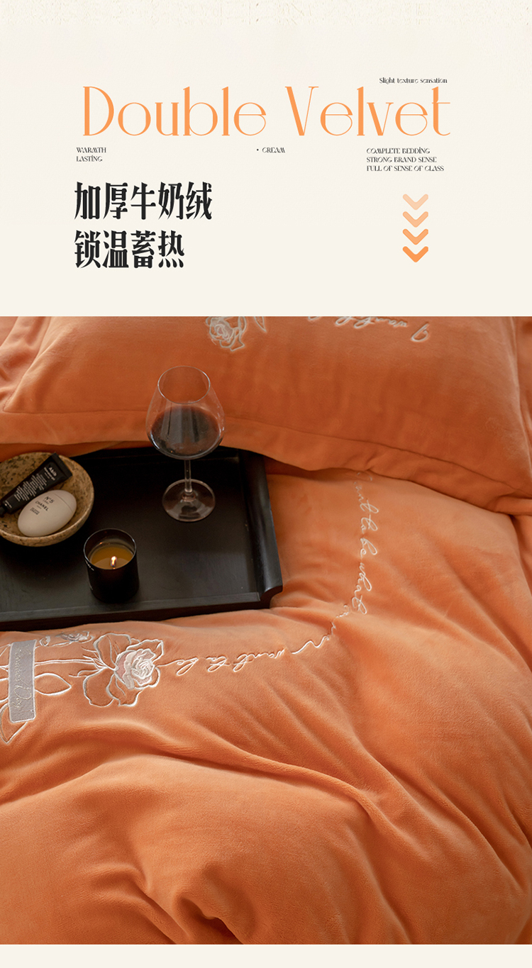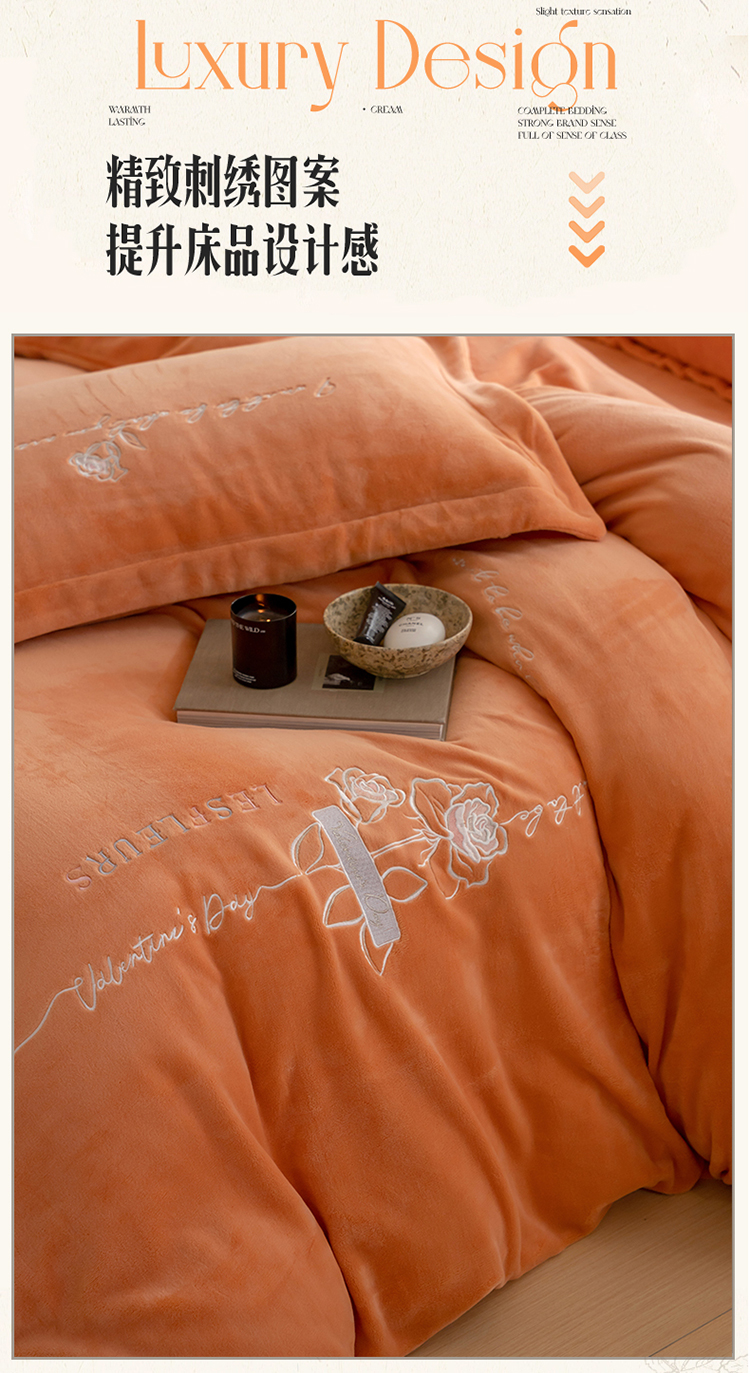 名品优仓 2023新款高克重牛奶绒绣花浪漫玫瑰系列四件套 爱玛桔