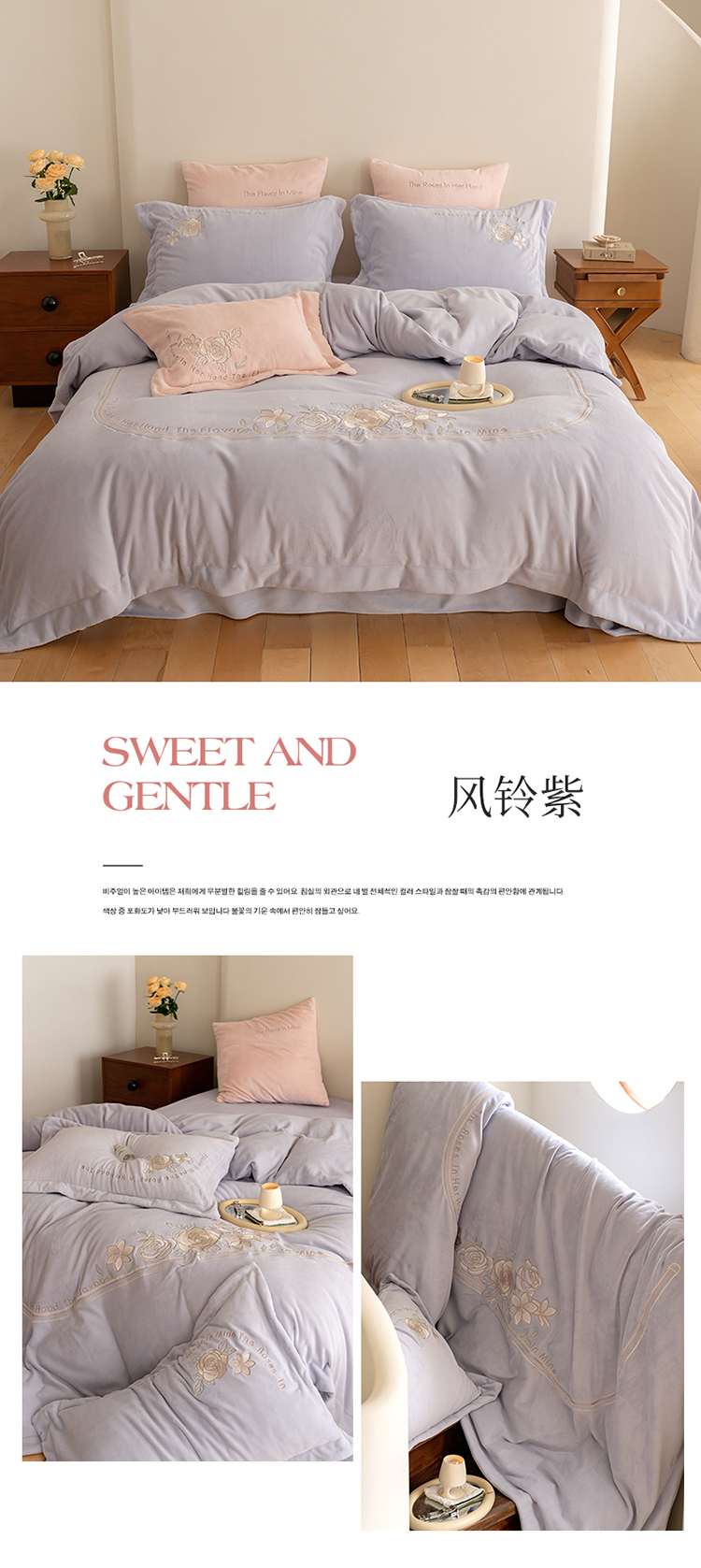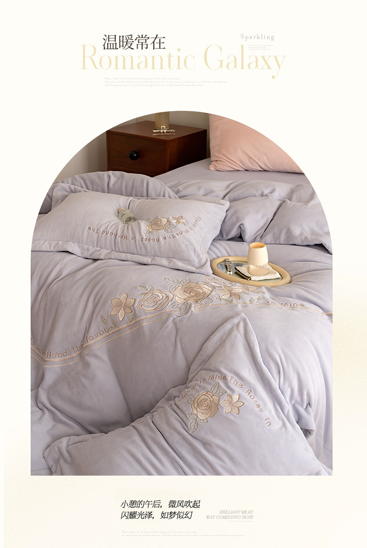 商品名称:名品优仓 2023新款高克重230g牛奶绒绣花蔓璃系列四件套 风铃紫