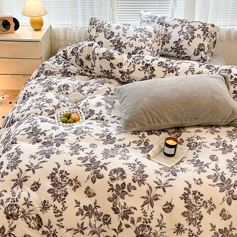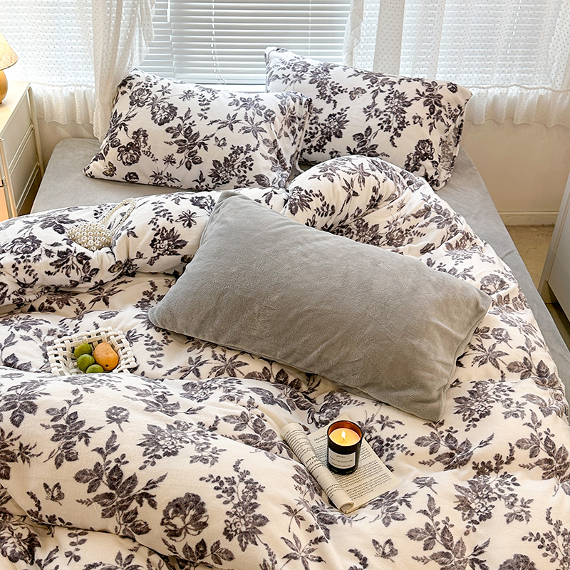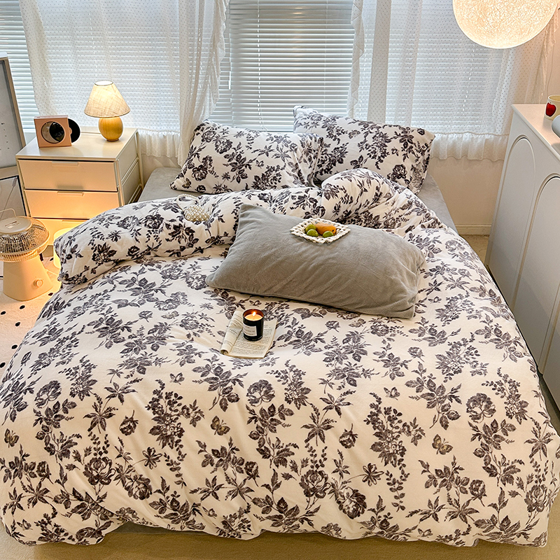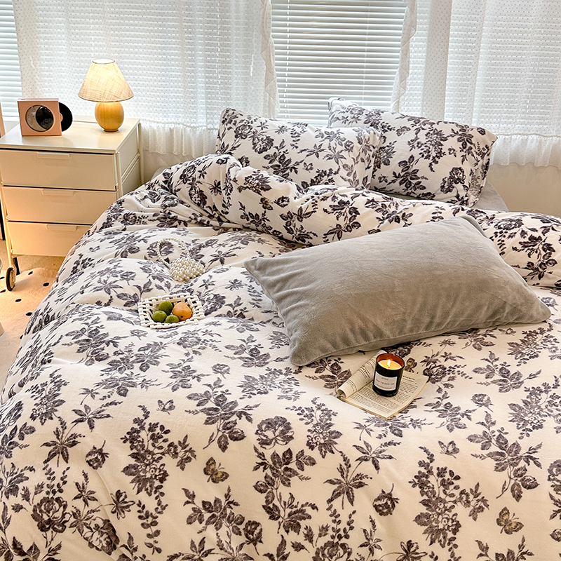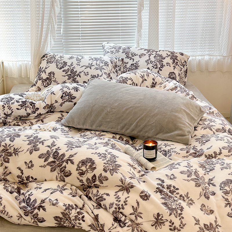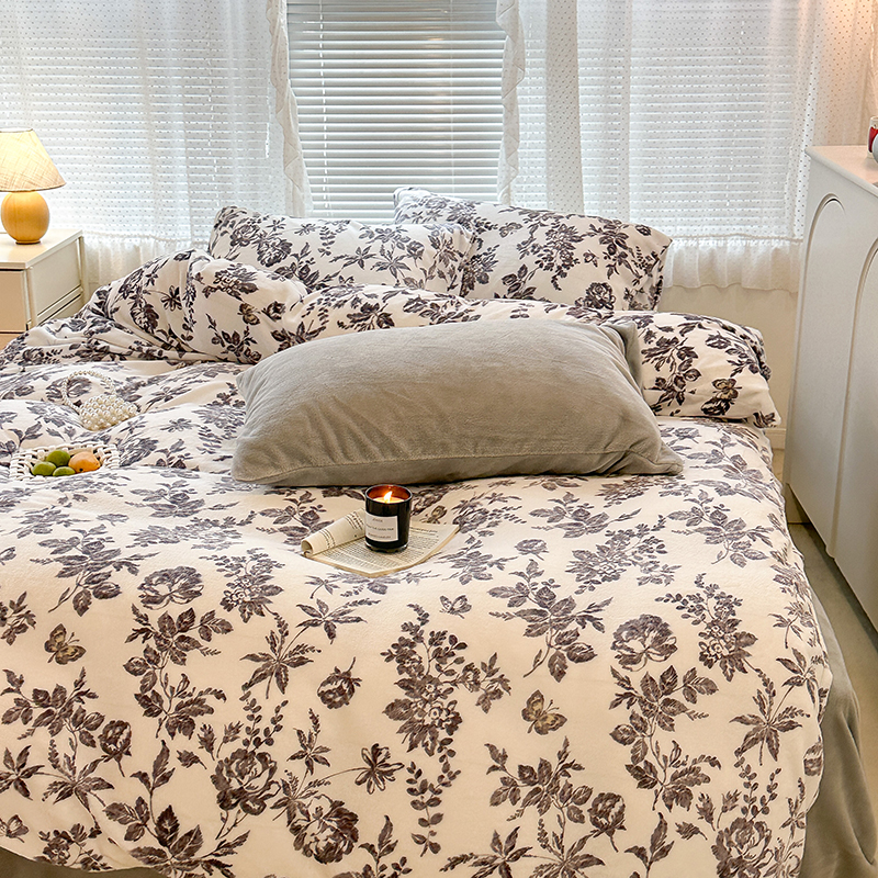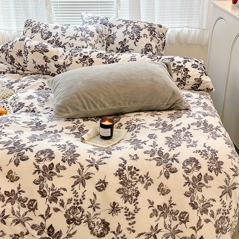 昔可家纺 2023新款高克重印花牛奶绒小清新系列四件套 法式茶歇黑