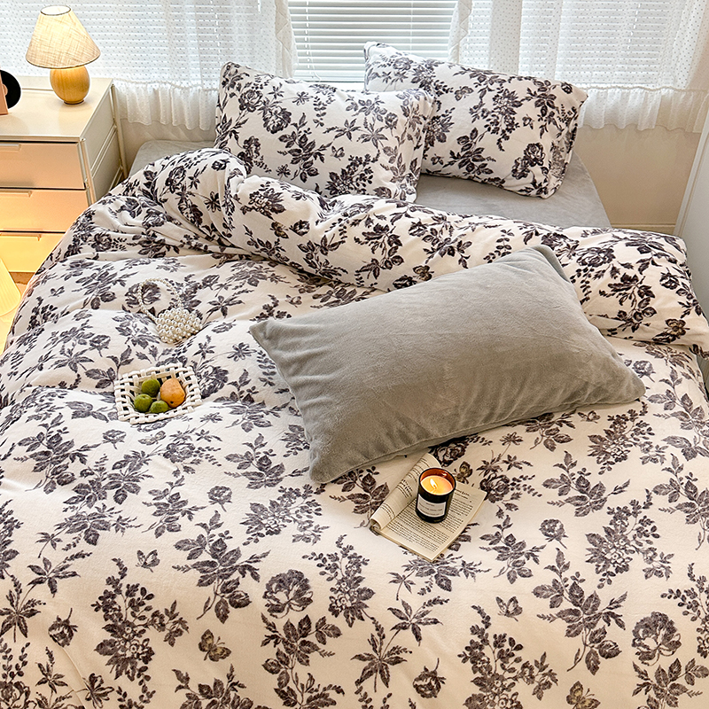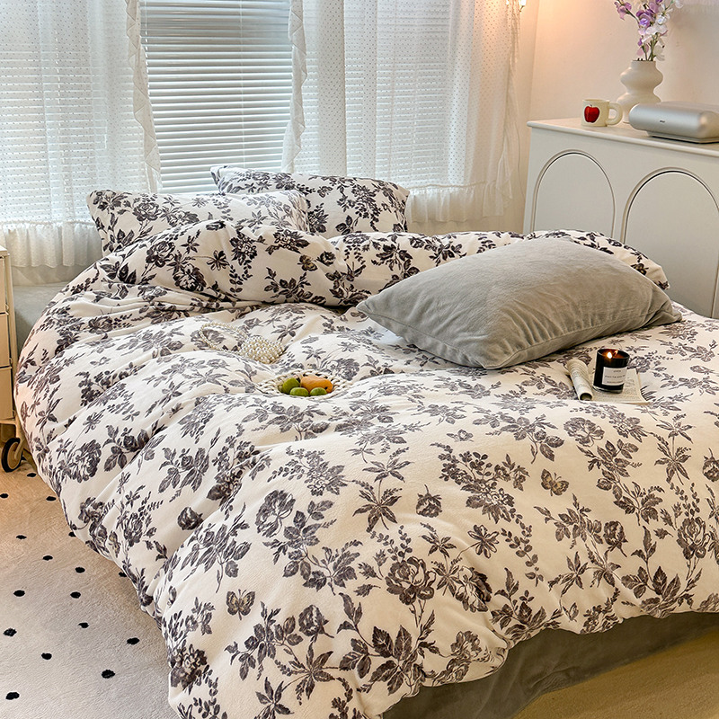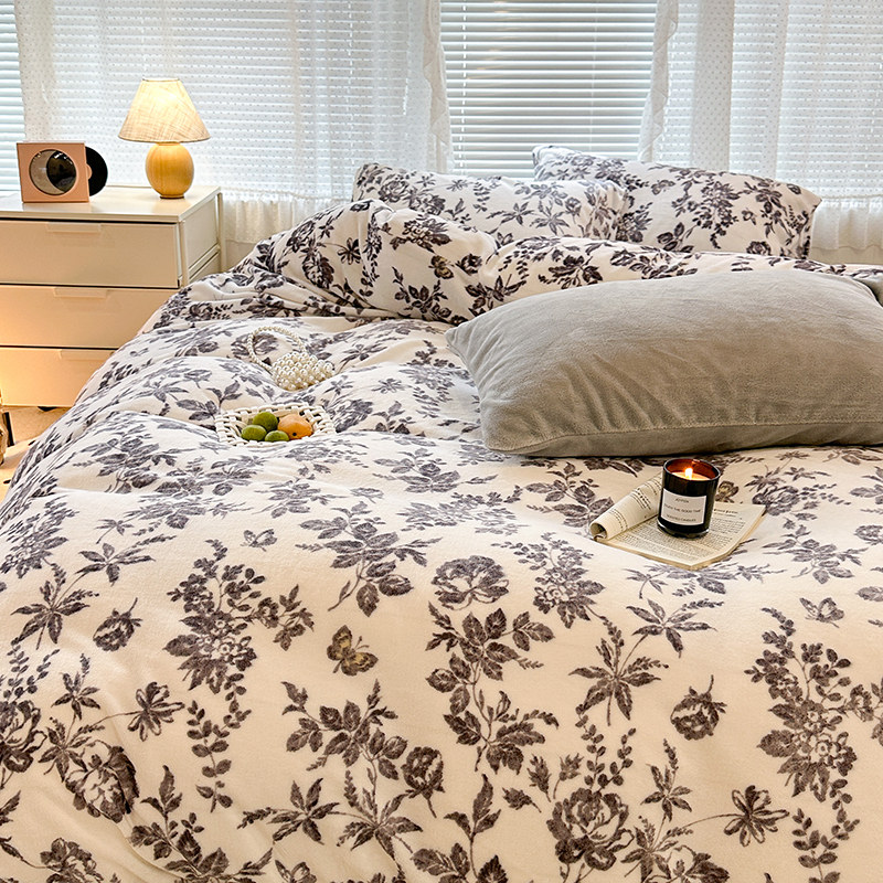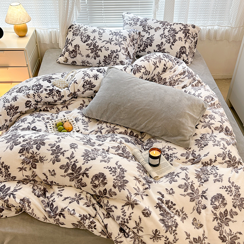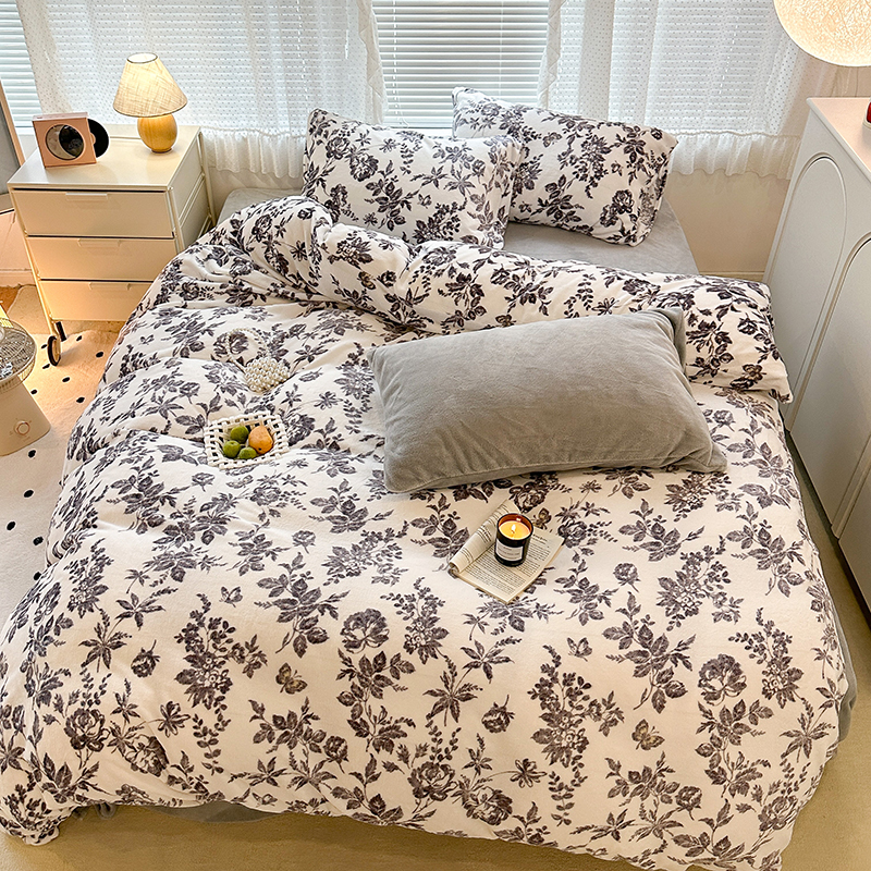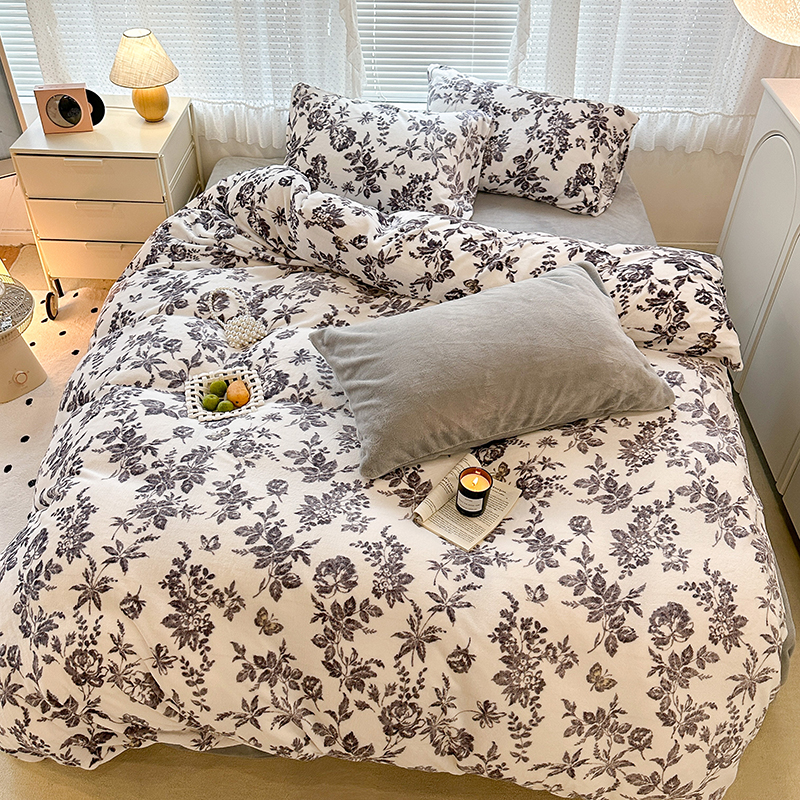 昔可家纺 2023新款高克重印花牛奶绒小清新系列四件套 法式茶歇黑