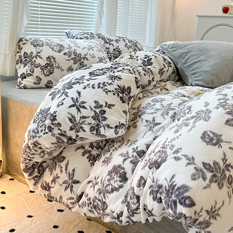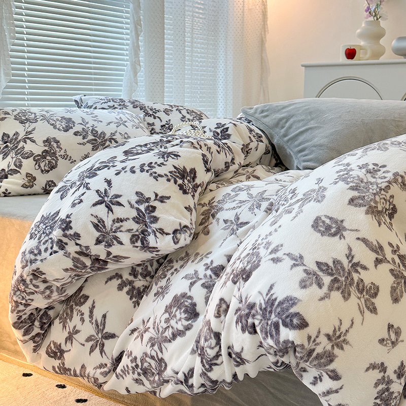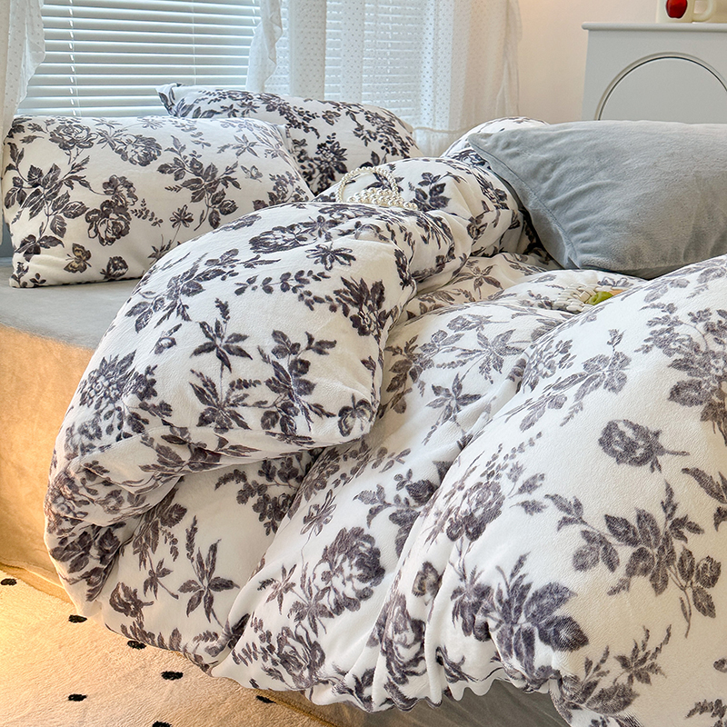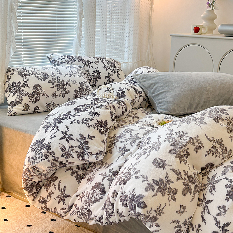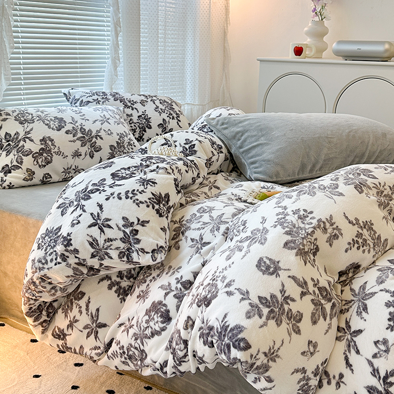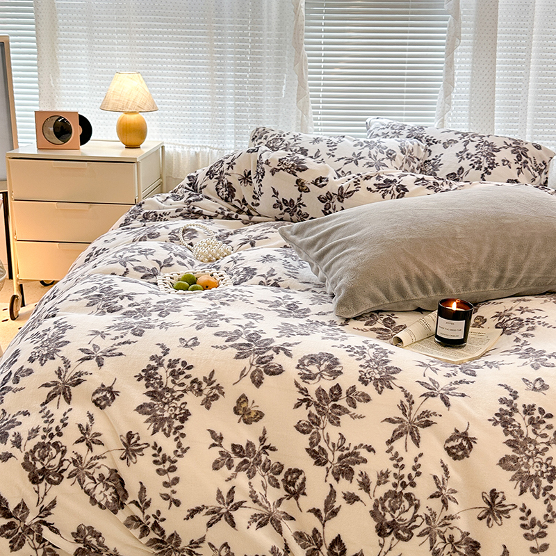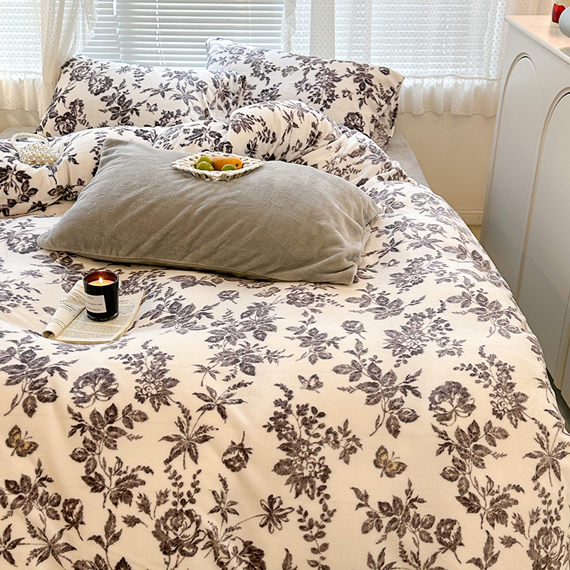 昔可家纺 2023新款高克重印花牛奶绒小清新系列四件套 法式茶歇黑