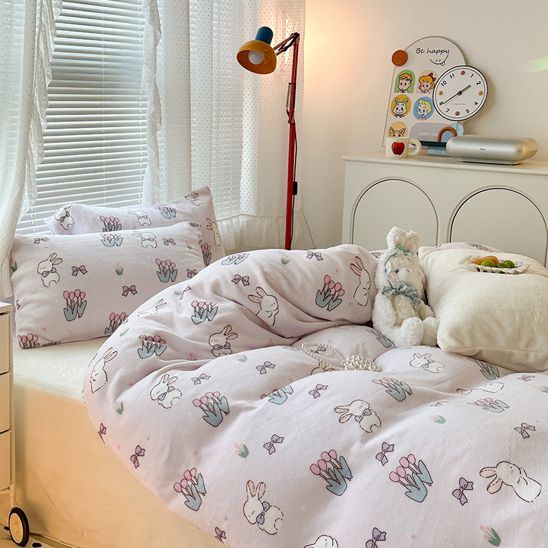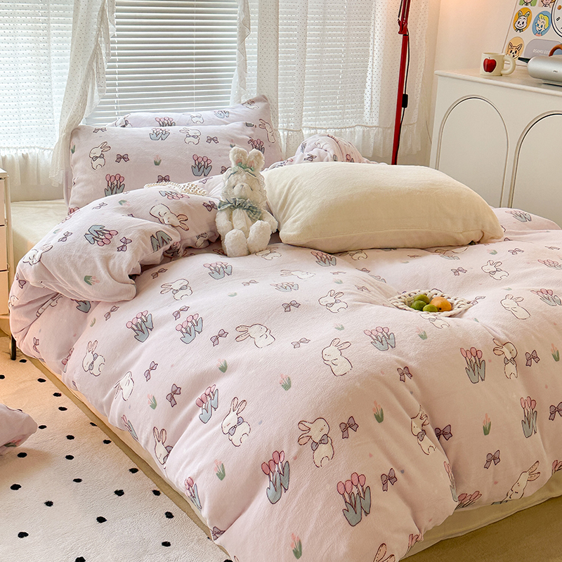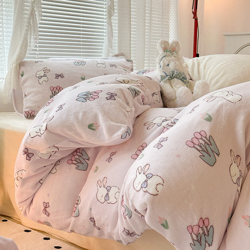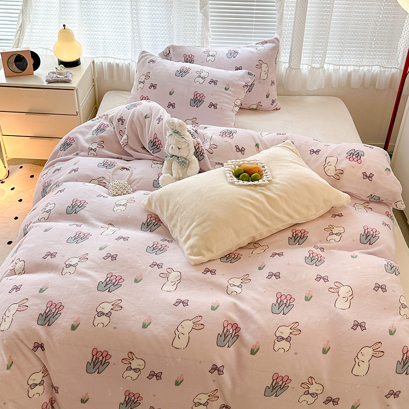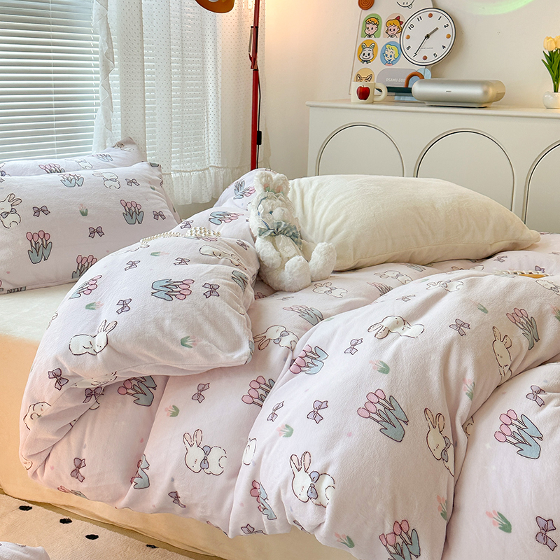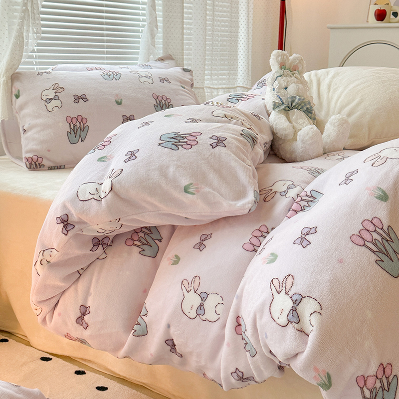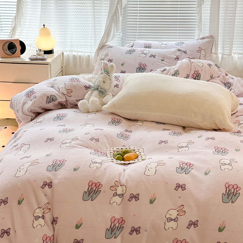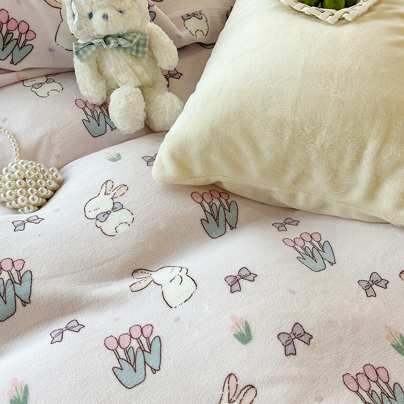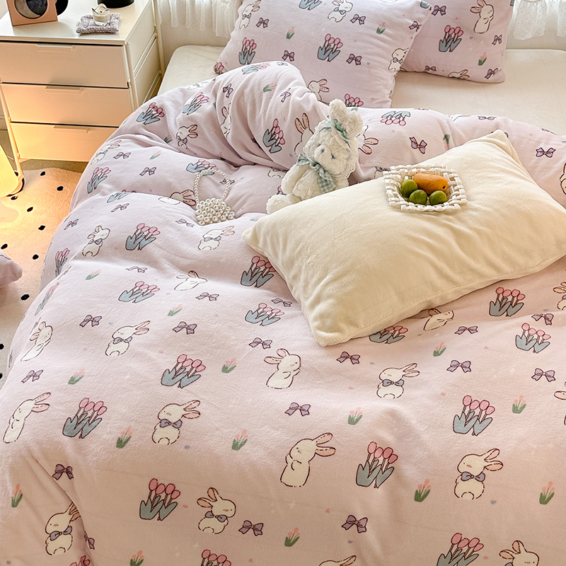 商品名称:昔可家纺 2023新款高克重印花牛奶绒小清新系列四件套 萌萌粉底郁金香兔