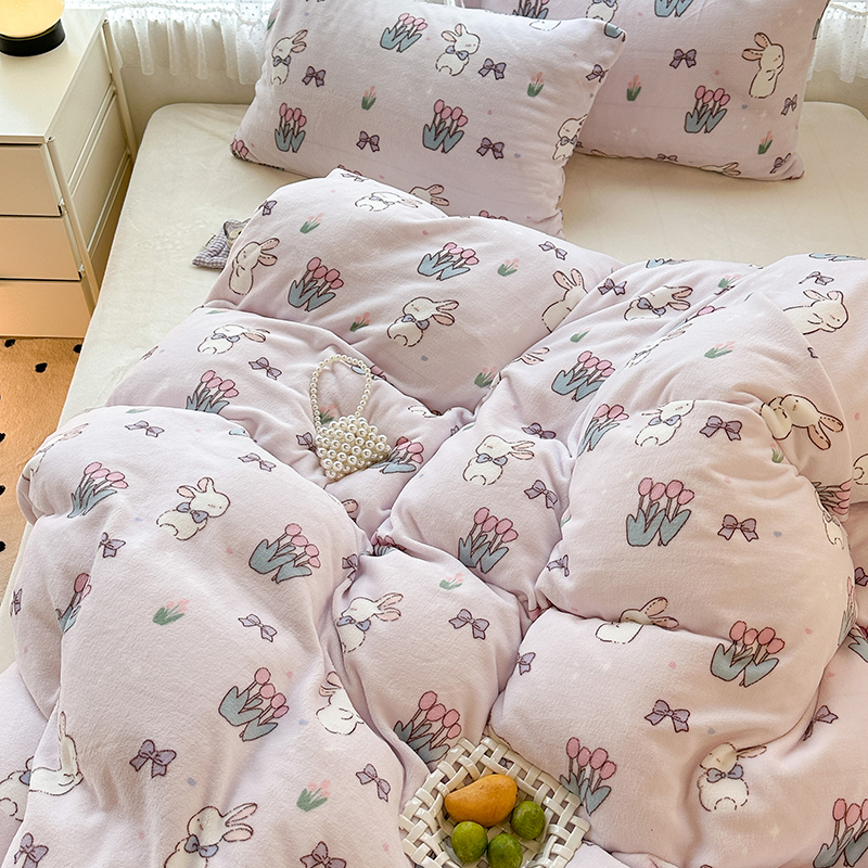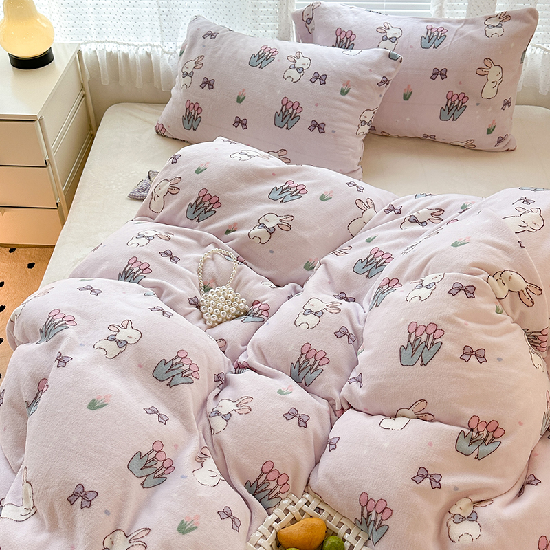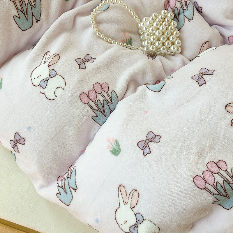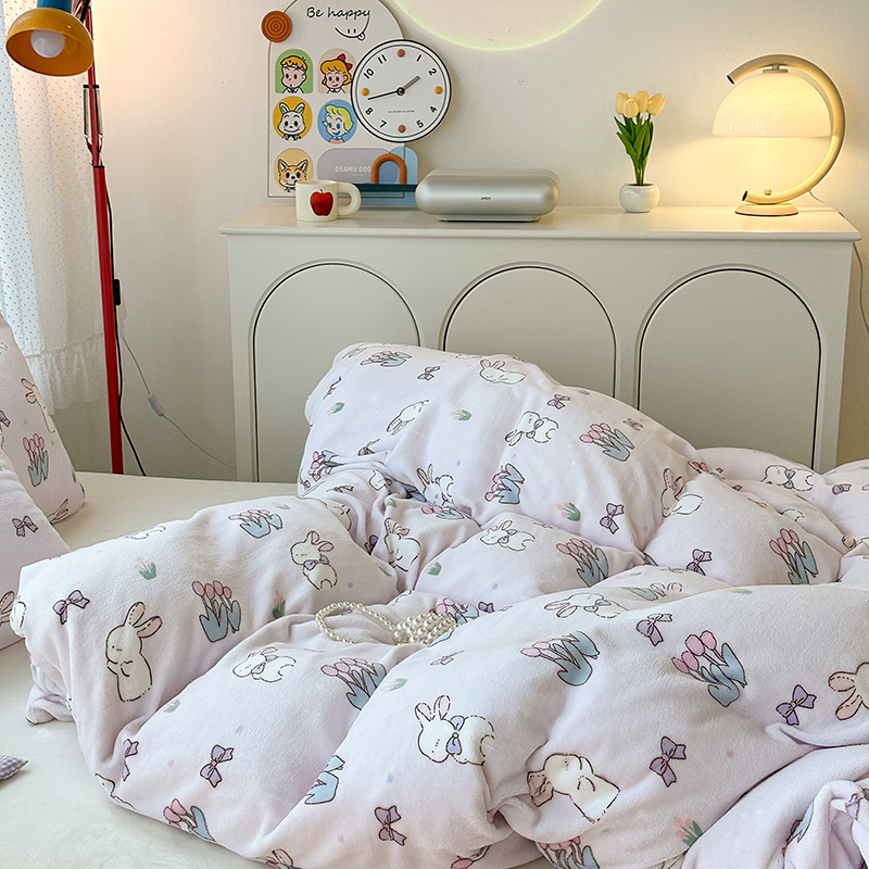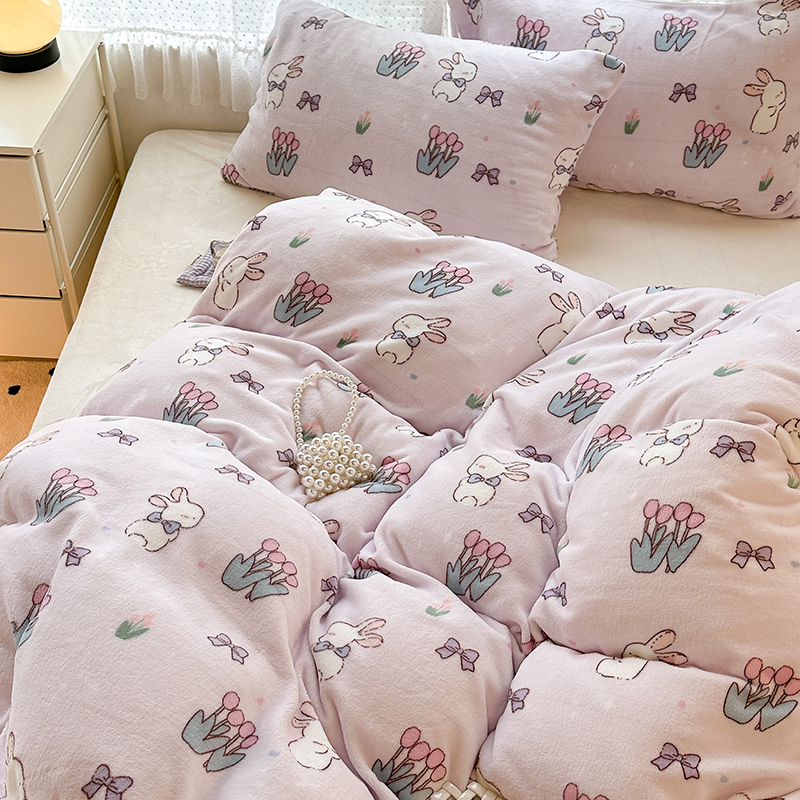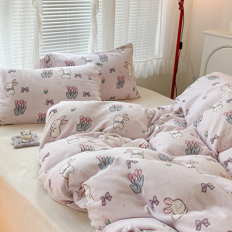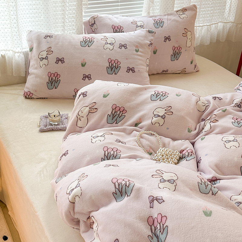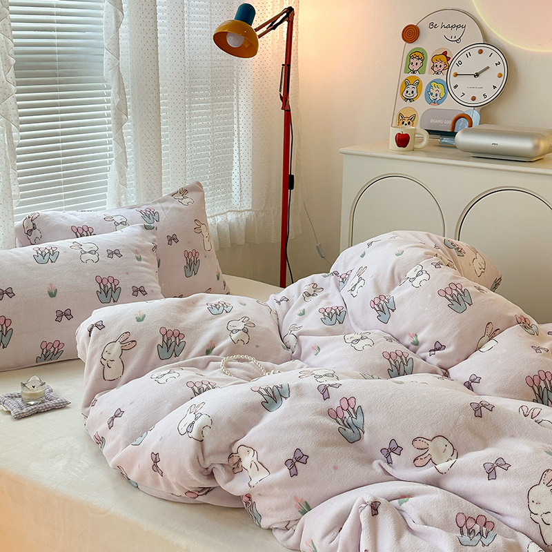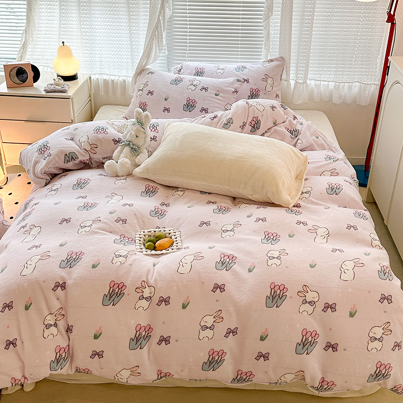 商品名称:昔可家纺 2023新款高克重印花牛奶绒小清新系列四件套 萌萌粉底郁金香兔