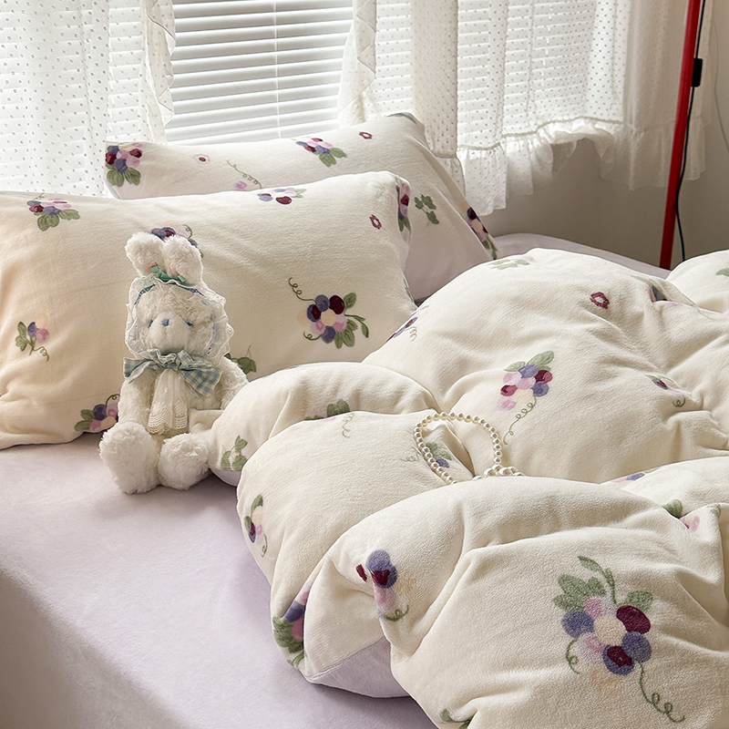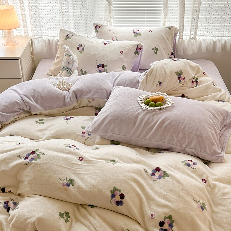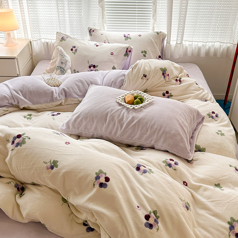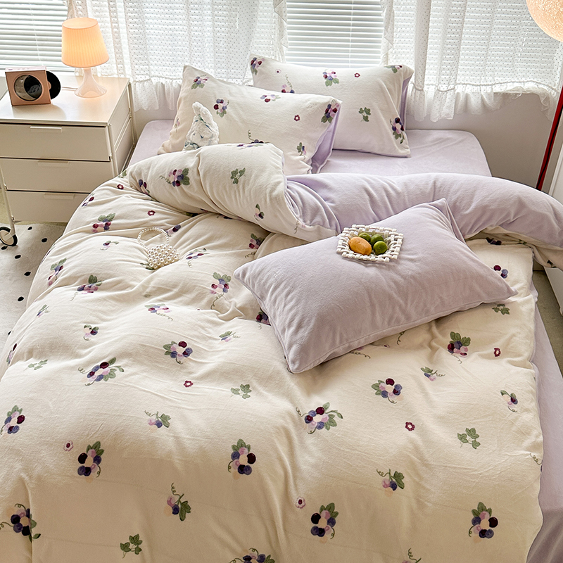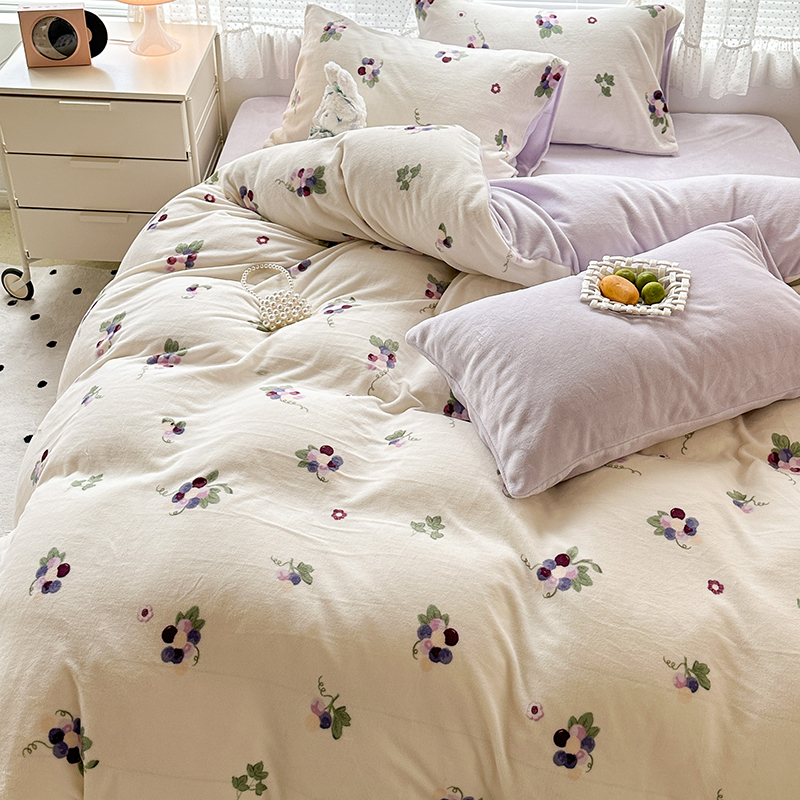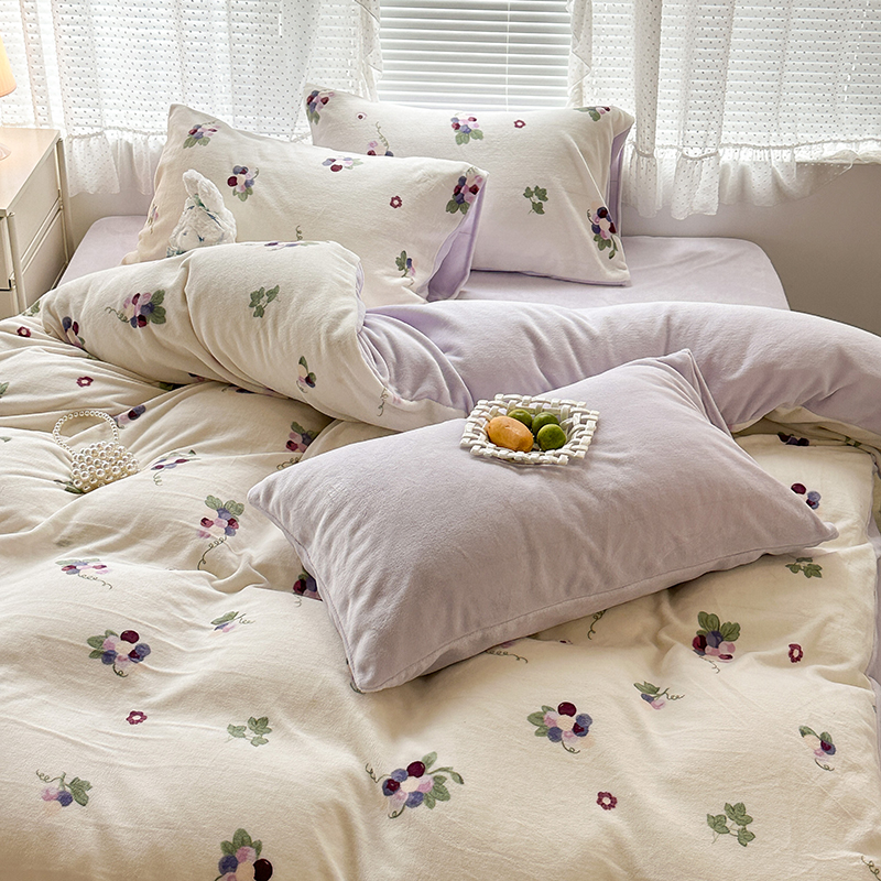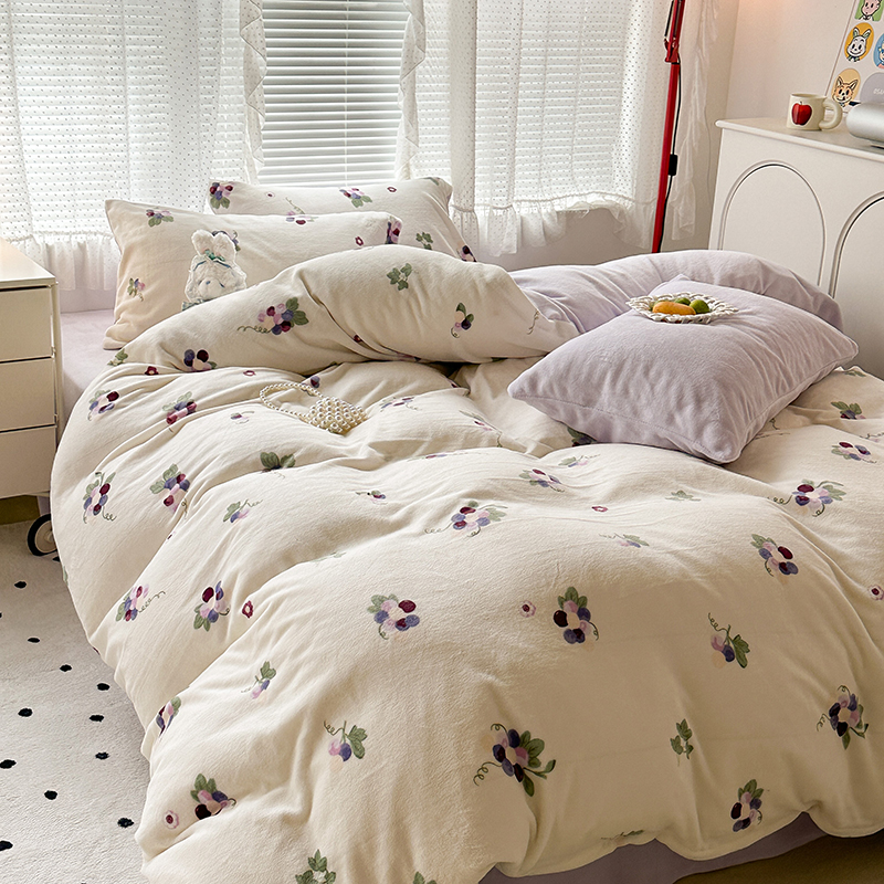 商品名称:昔可家纺 2023新款高克重印花牛奶绒小清新系列四件套 紫色葡萄