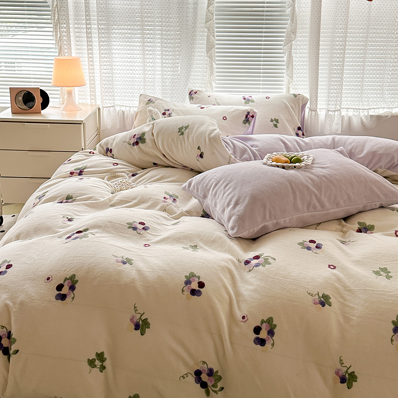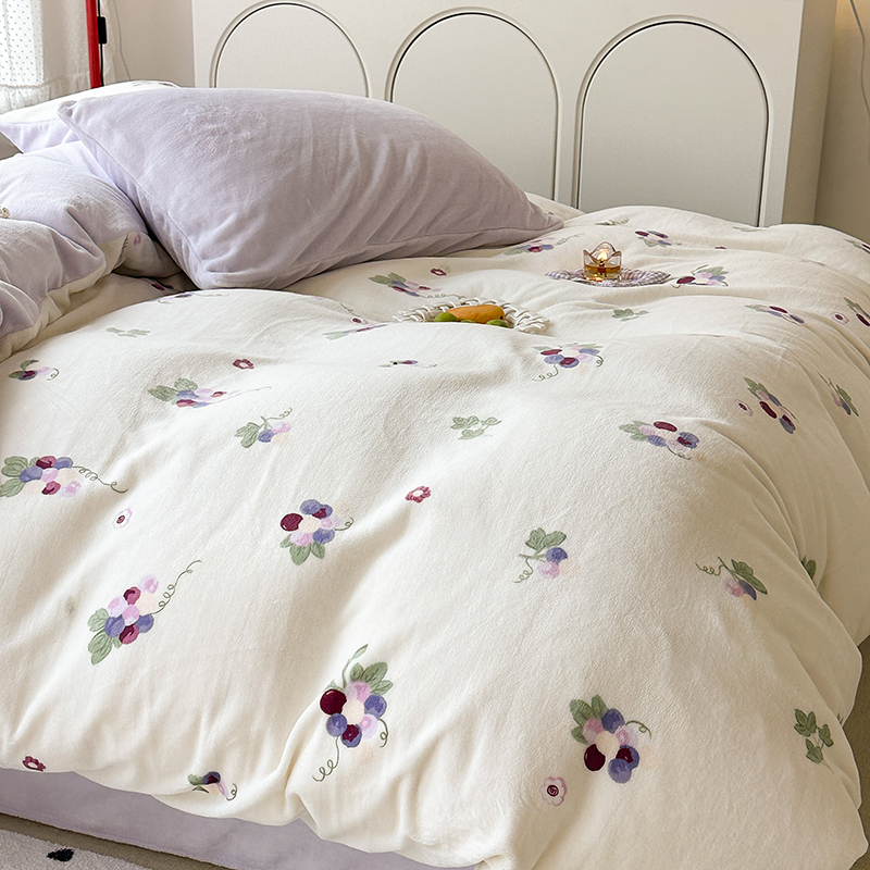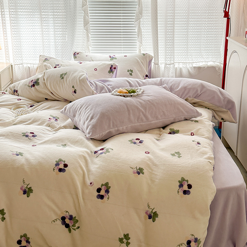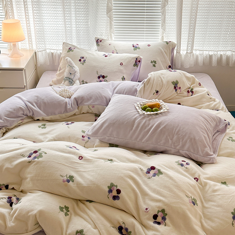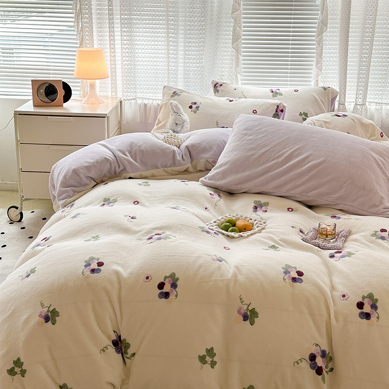 昔可家纺 2023新款高克重印花牛奶绒小清新系列四件套 紫色葡萄