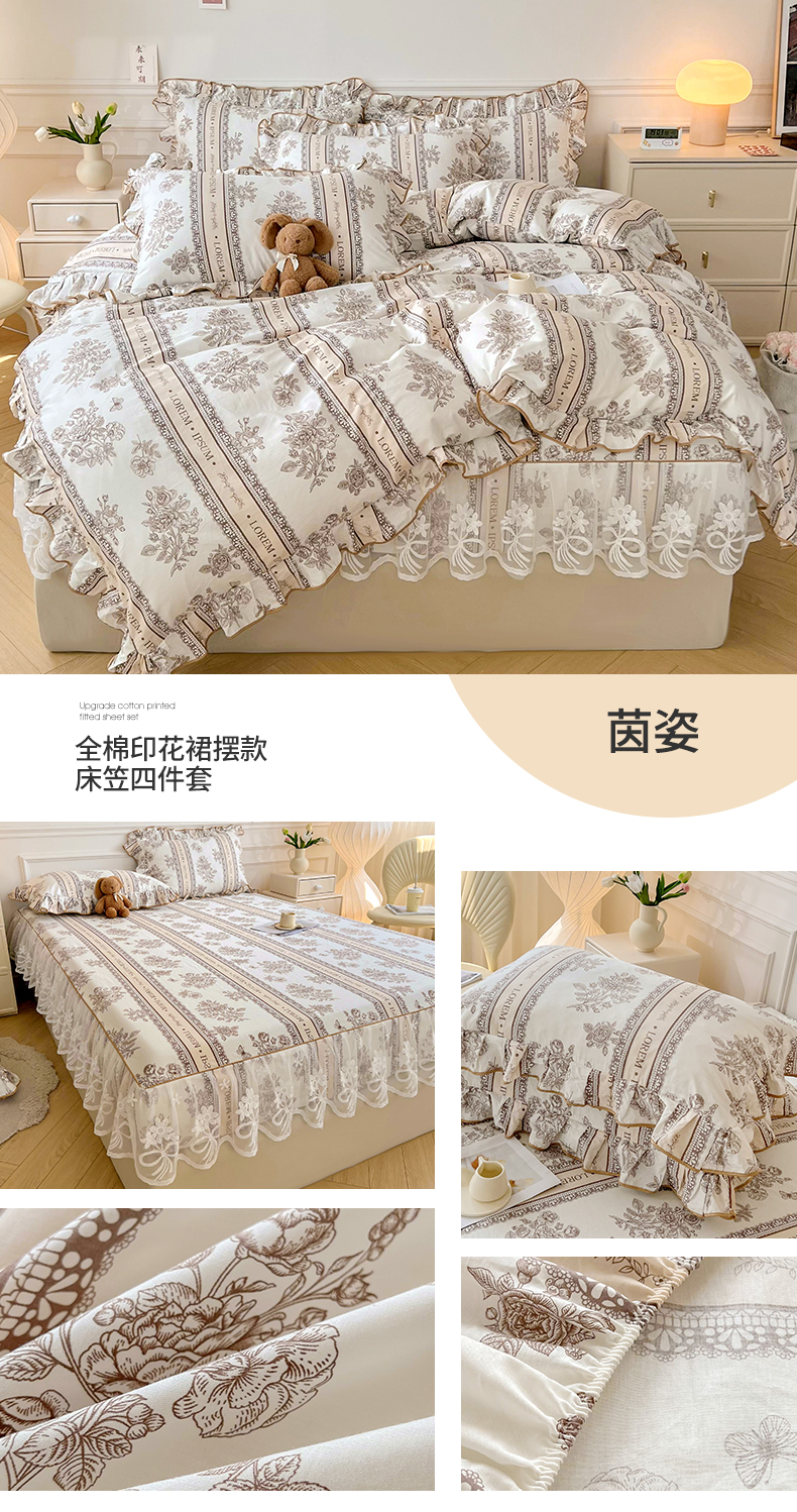 当前位置: 91家纺网 > 商品网购 > 床品套件 > 四件套 > 全棉普通四件套 > 宜凡家纺 2023款全棉花边裙摆款床笠四件套 茵姿